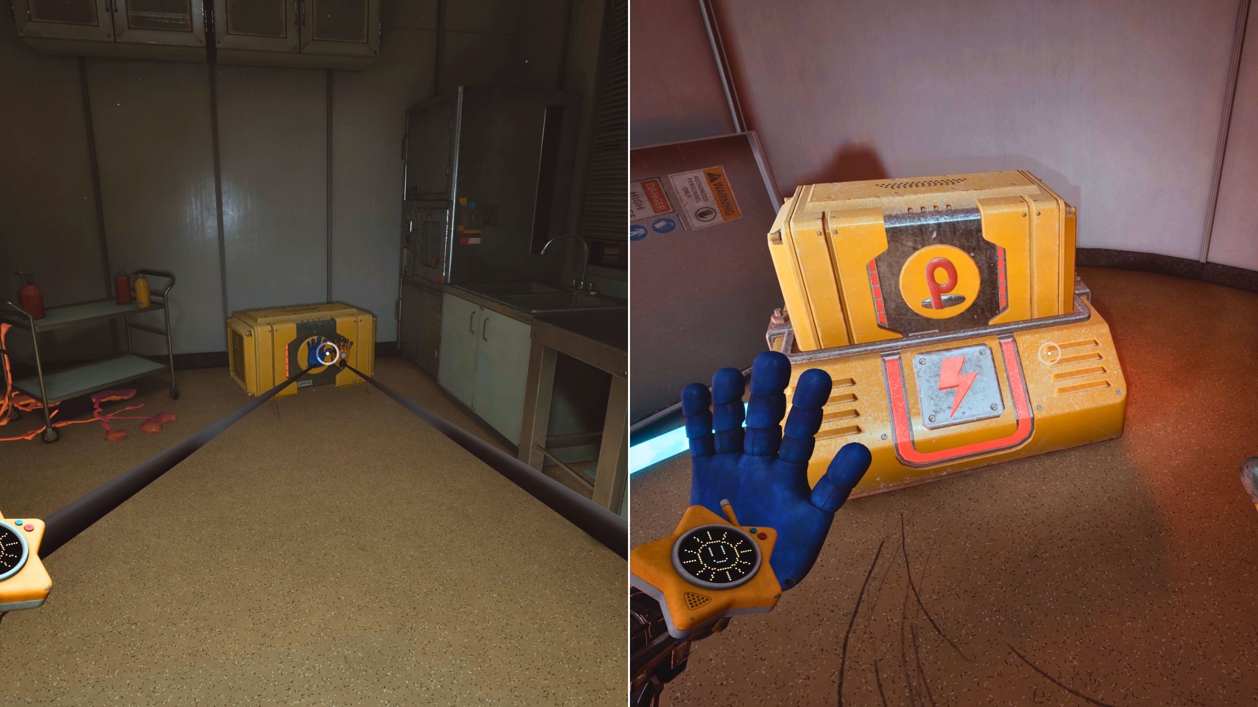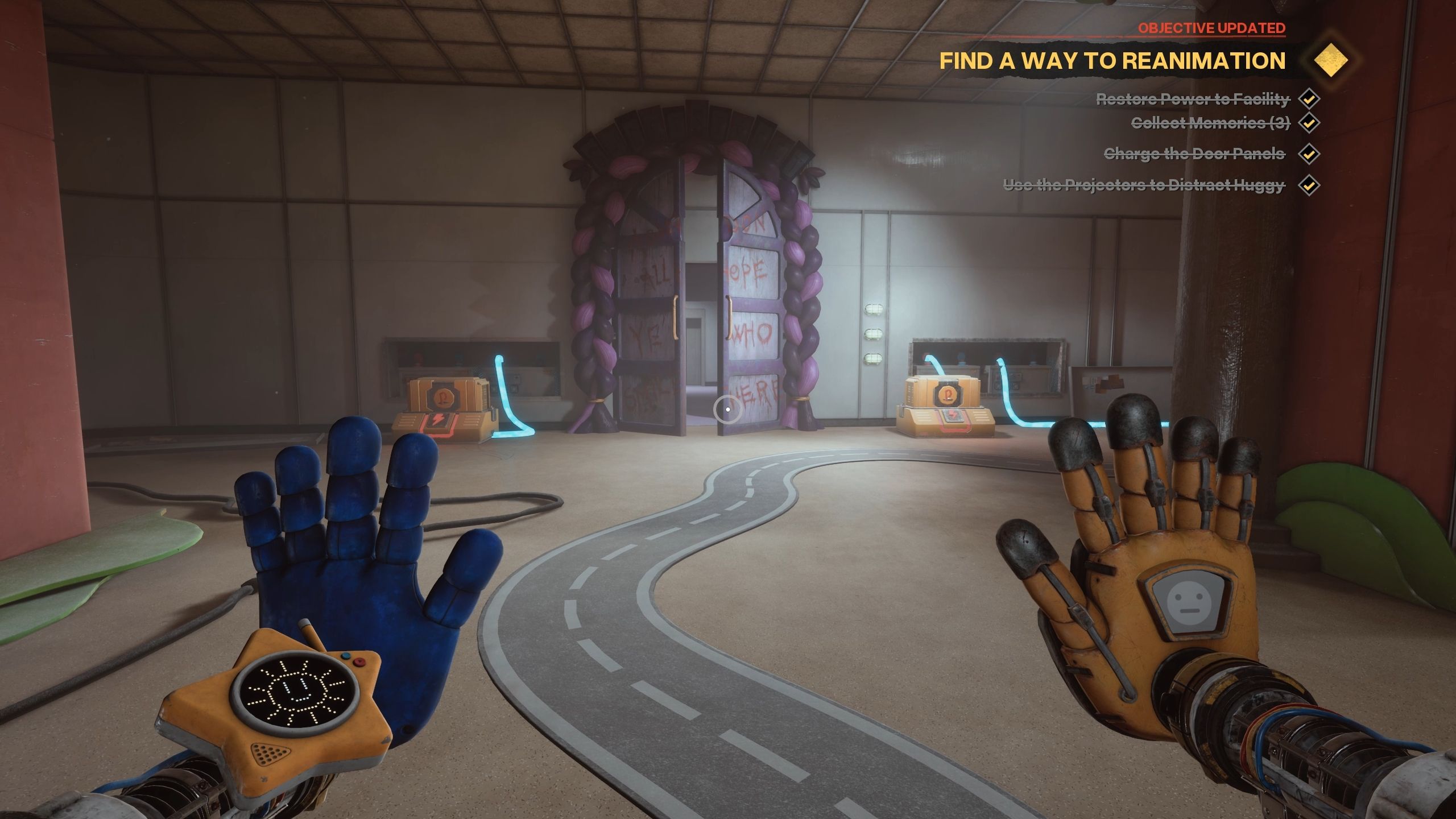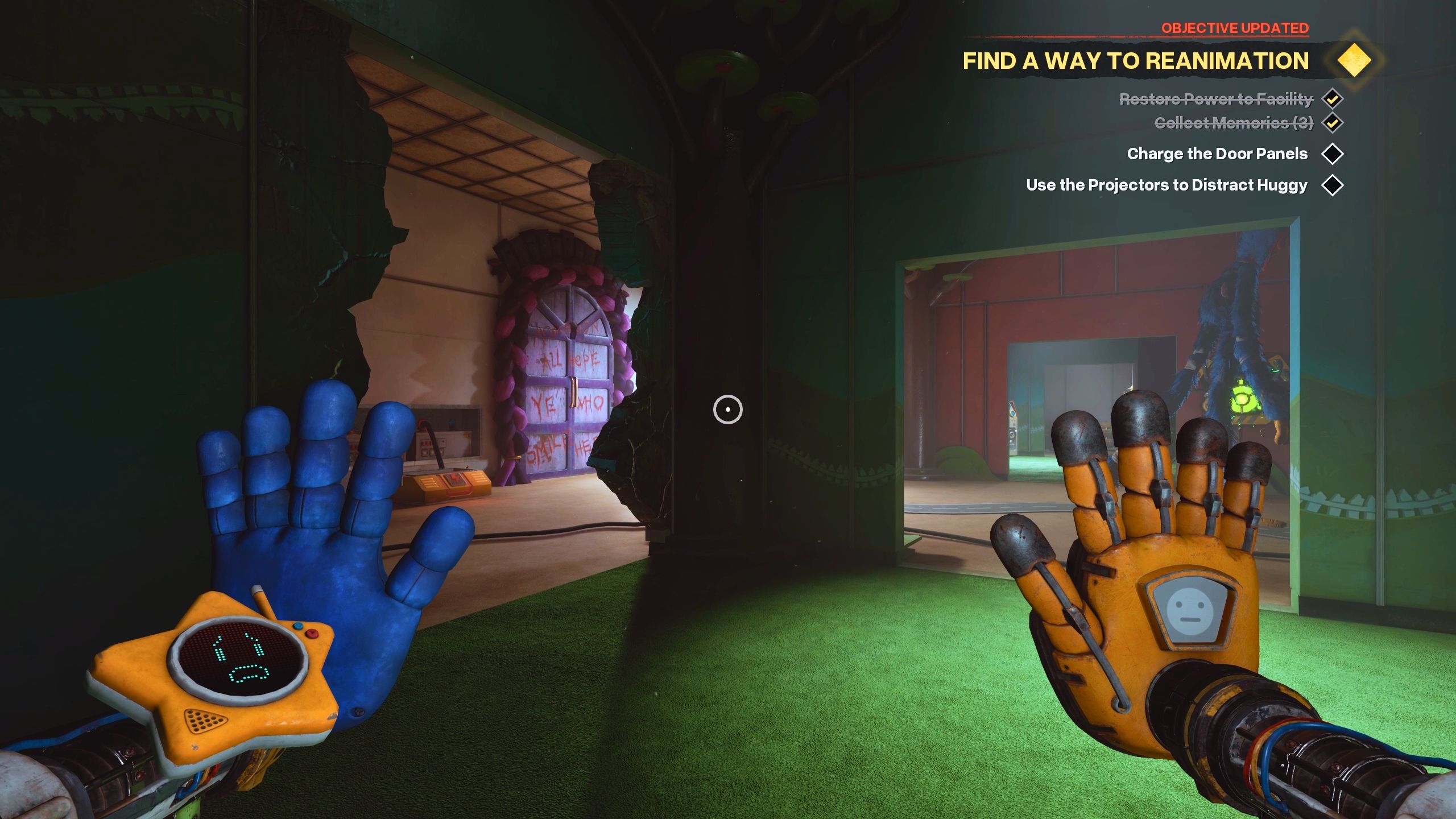 - To distract Huggy Wuggy, use the Conductive Hand to charge up projectors.