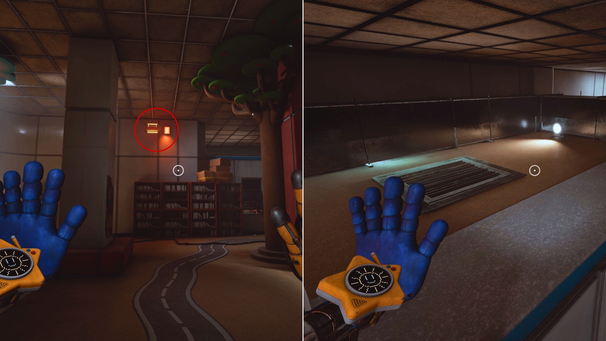 To find the second battery, look for a handlebar to the left of the room where you collected the first one. Use your GrabPack to pull yourself onto the bar, then climb over the boxes to reach the vent cover. Remove the cover and drop down into the room below.