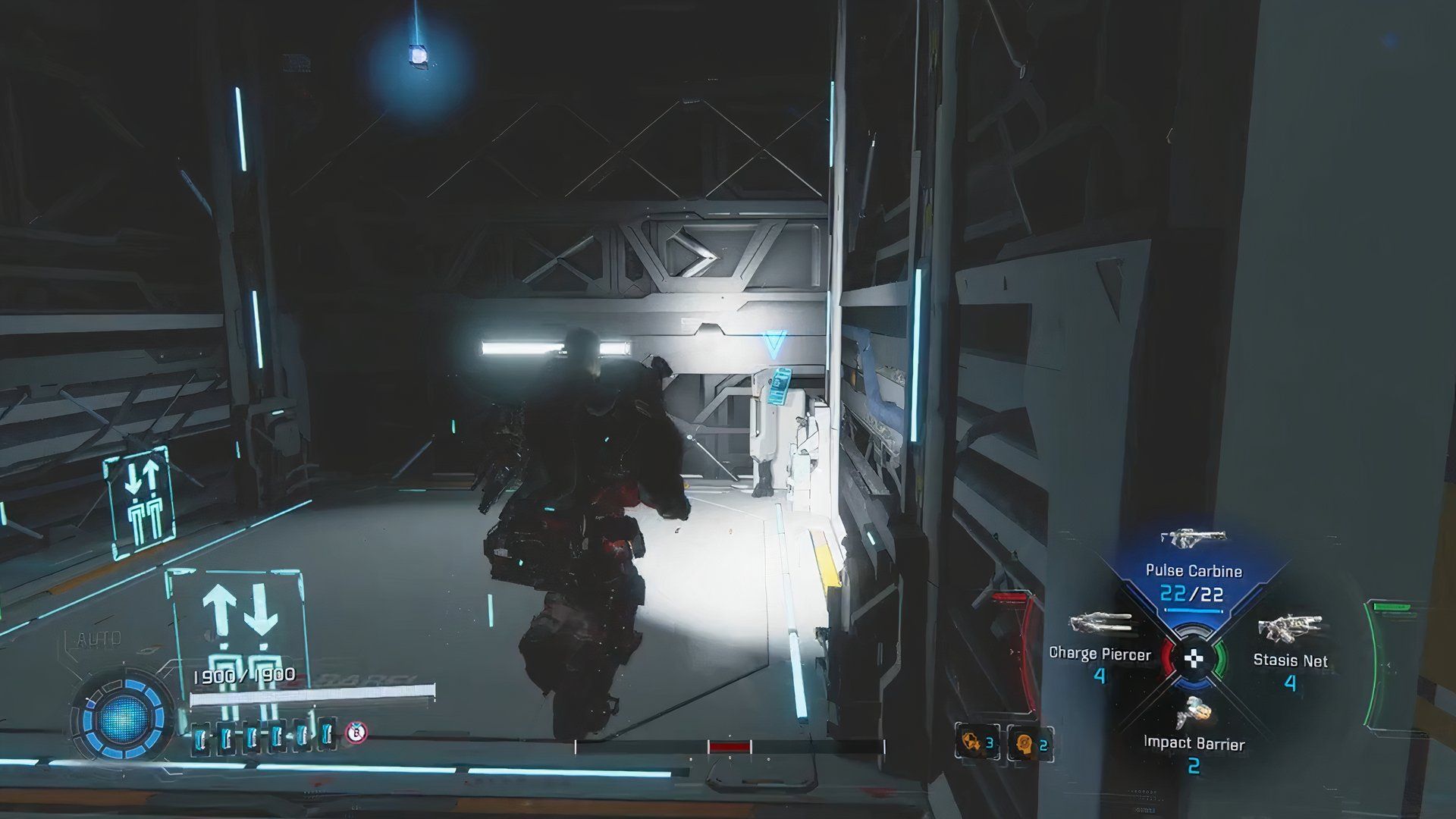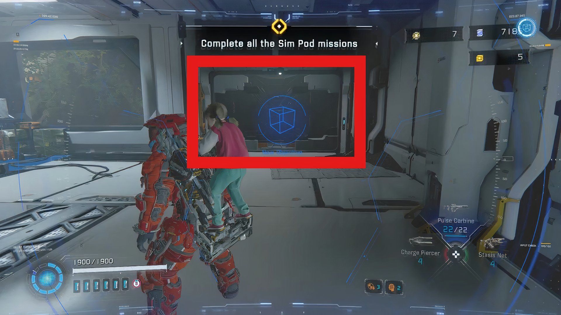 Return to the station where you began and locate the Mini Cabin (GeoScience Lab). Instead of going through the door to the right, take the lift nearby to go down to the lower level. Once you’re down there, find the door next to the machine that shoots out red rings and go through it. Stay to the right to pass through an open doorway, then drop down to the next area.