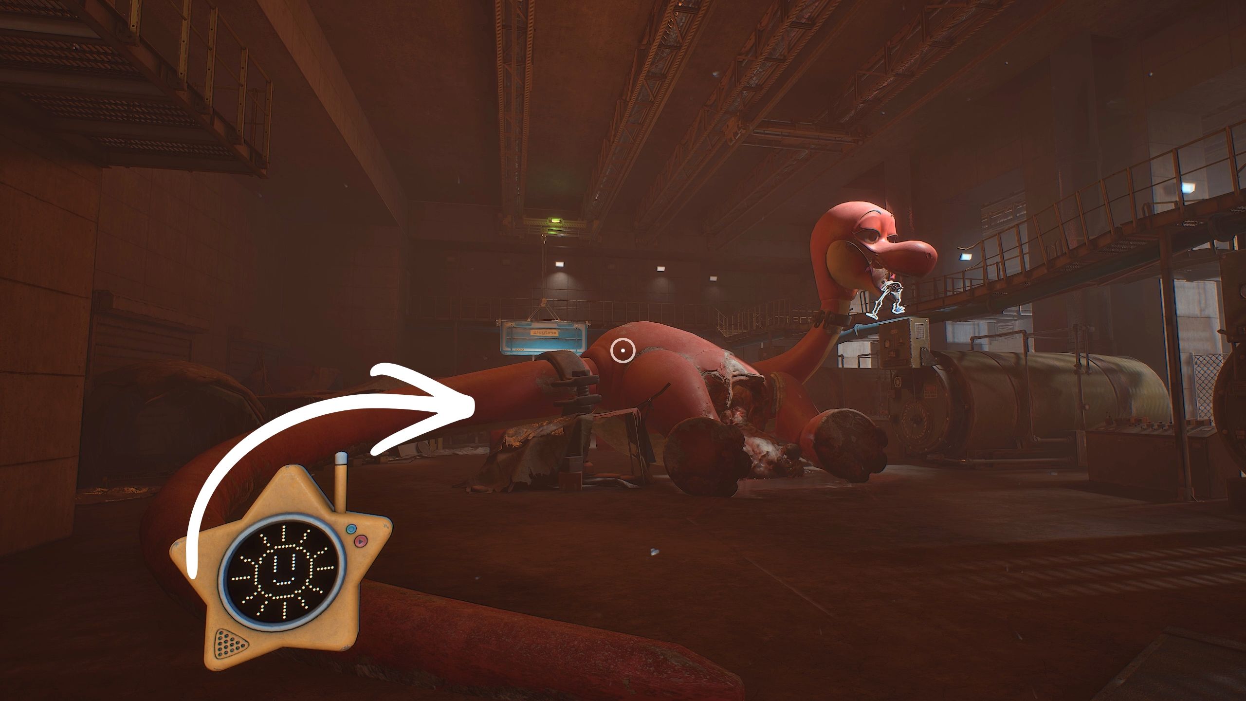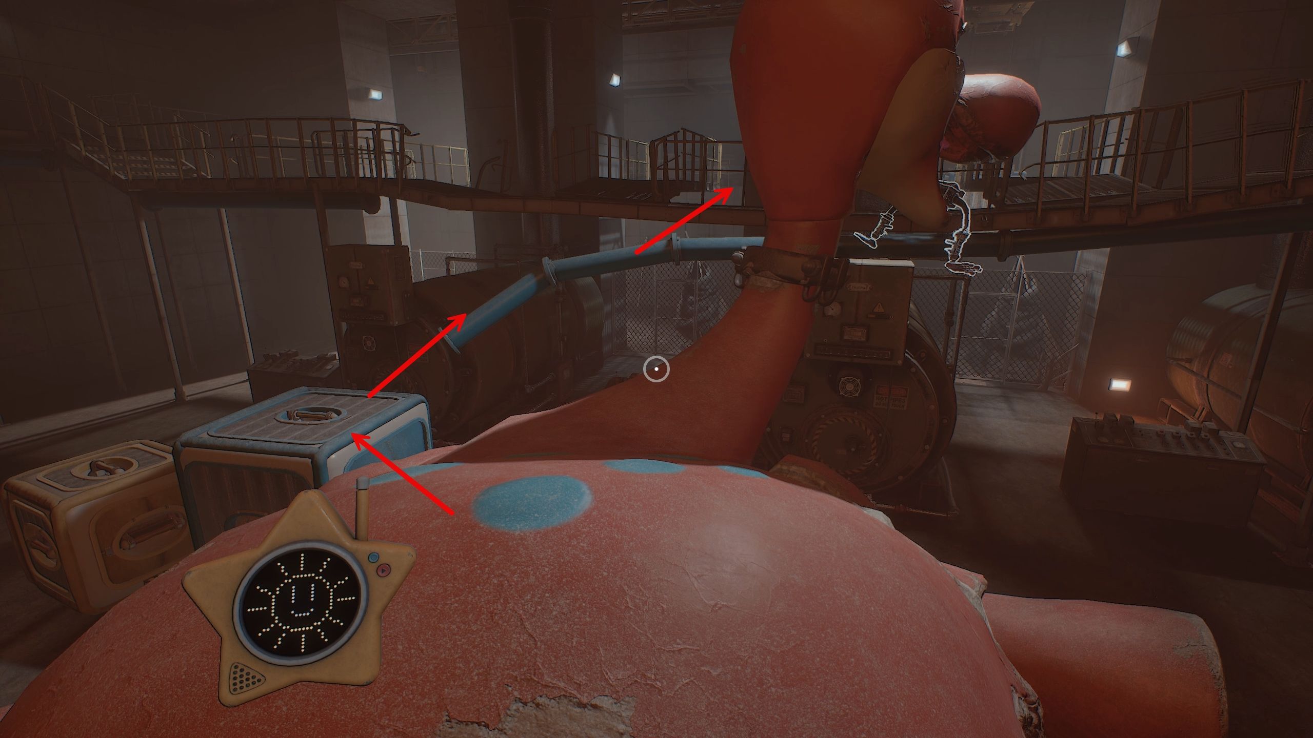 To get the GrabPack, climb up Bron’s tail and onto its body. Then, jump down onto the large box to the left to reach the blue pipe, which leads to the main catwalk. Once you’re there, you can finally take the GrabPack from Bron’s mouth – it includes both a Blue Hand and a Red Hand.