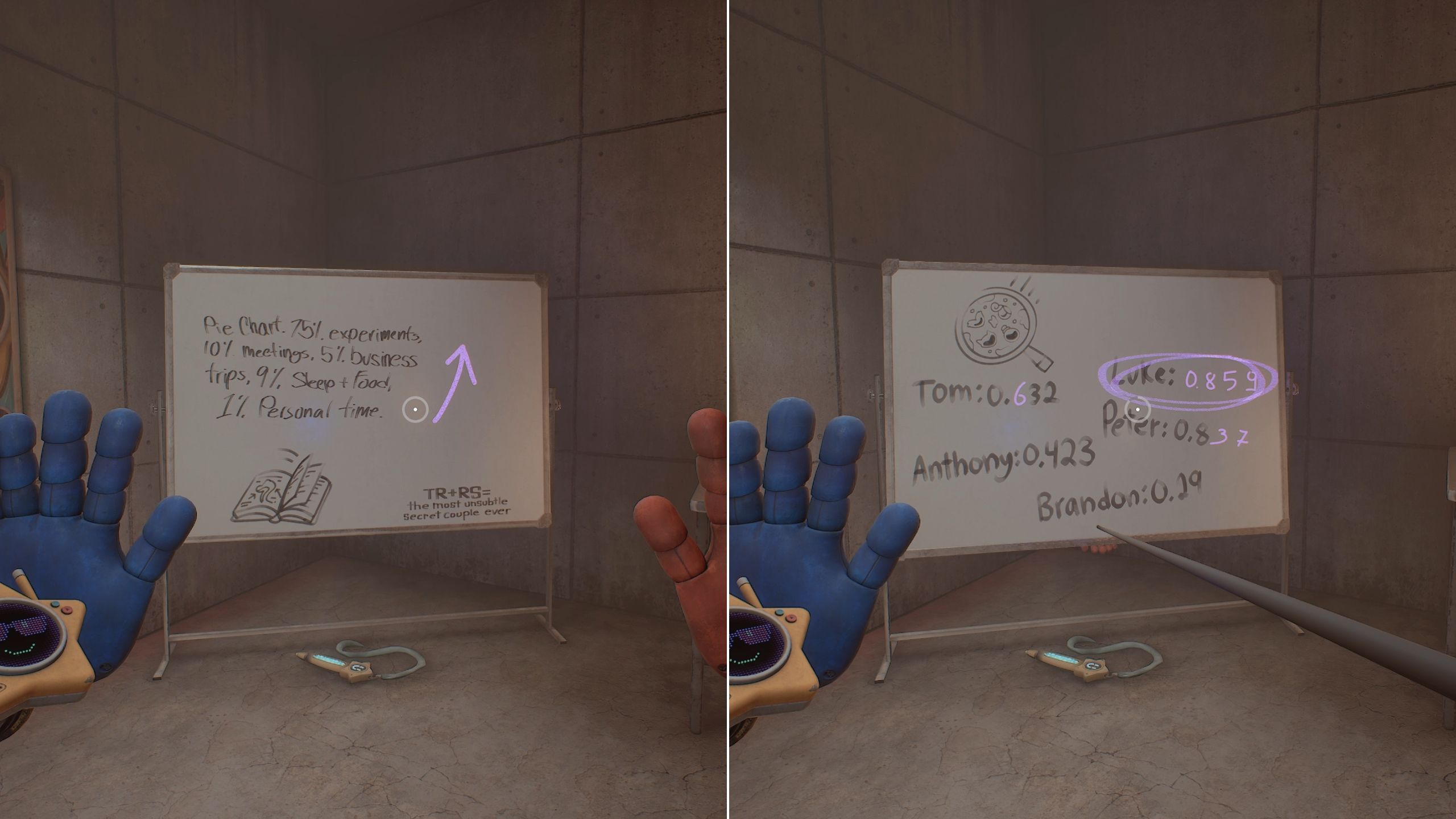 When you get to the office, change the Glowby’s light setting to blacklight. Look at the whiteboard – you’ll see an arrow pointing up. This means you need to flip the whiteboard over to find the code for the Pressure Hand locker in Poppy Playtime: Chapter 5. The code will be circled on the back.