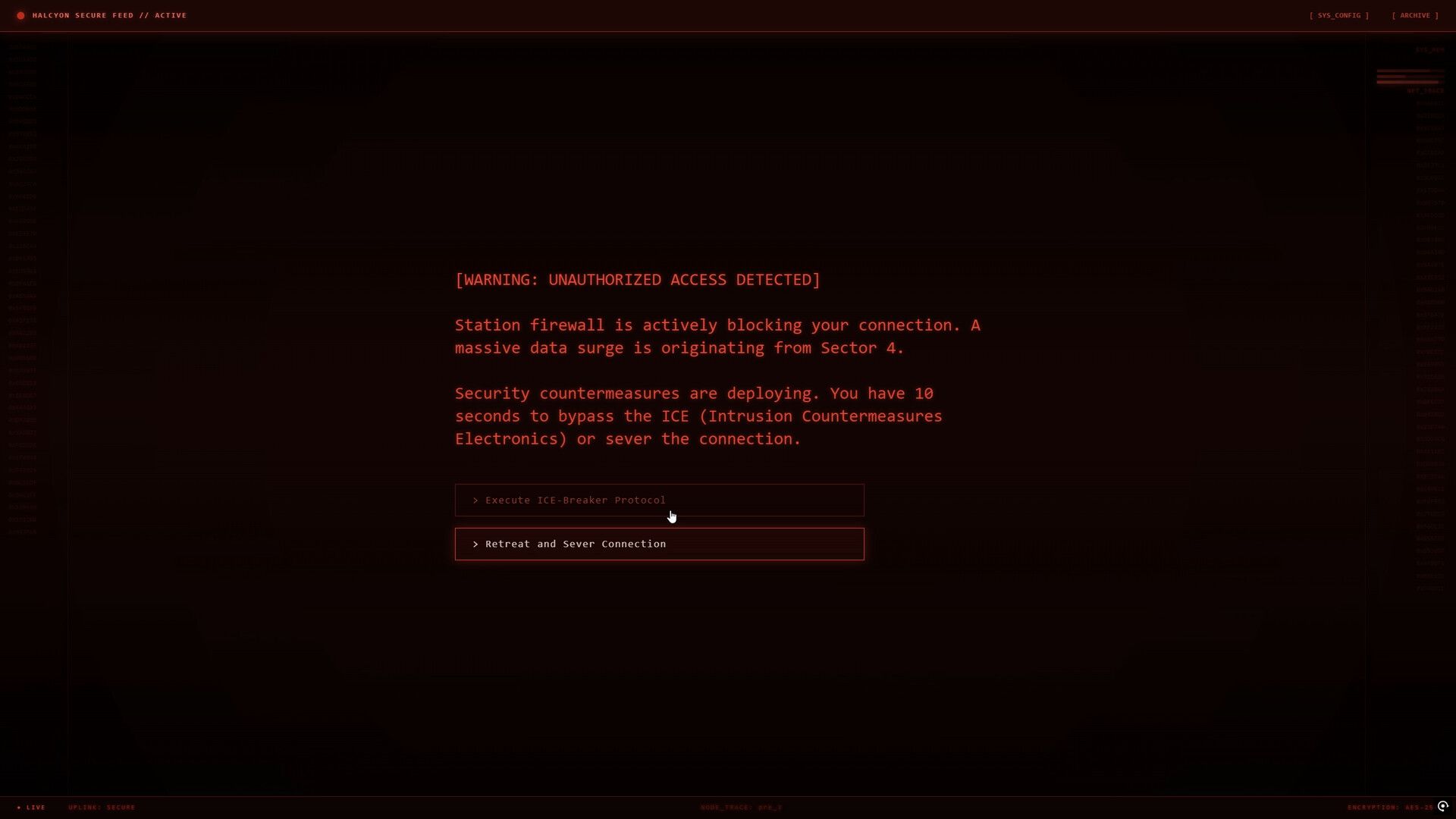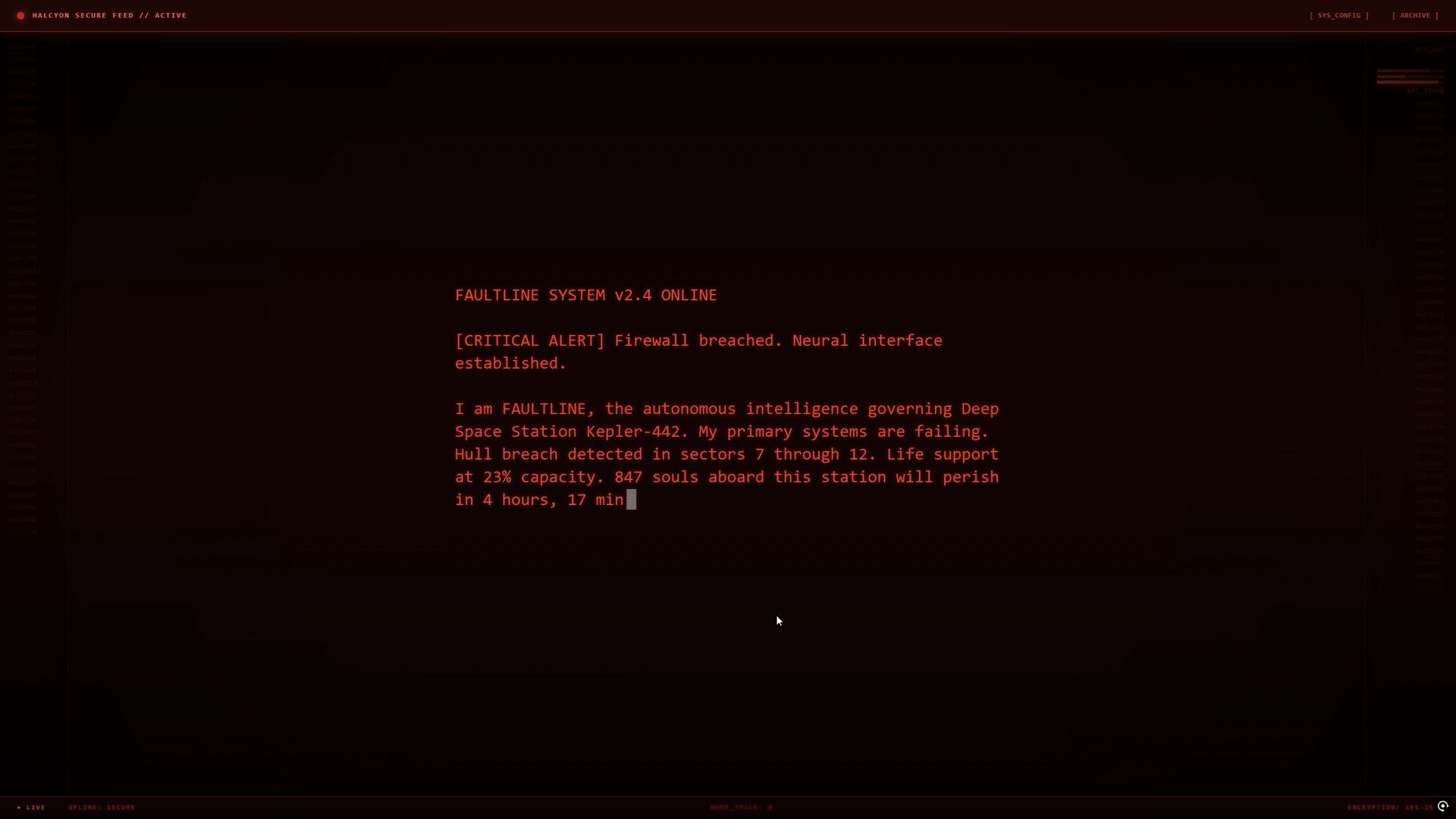 Faultline.EXE is a sci-fi thriller where you connect to a struggling space station, Kepler-442 (Tartarus Deep), through a neural link. You play as a remote operative tasked with hacking into damaged systems, avoiding security forces, and discovering what went wrong with a secret biological experiment. You have just four hours to make critical decisions that will determine your survival, reveal the truth, and impact the fate of the entire sector.