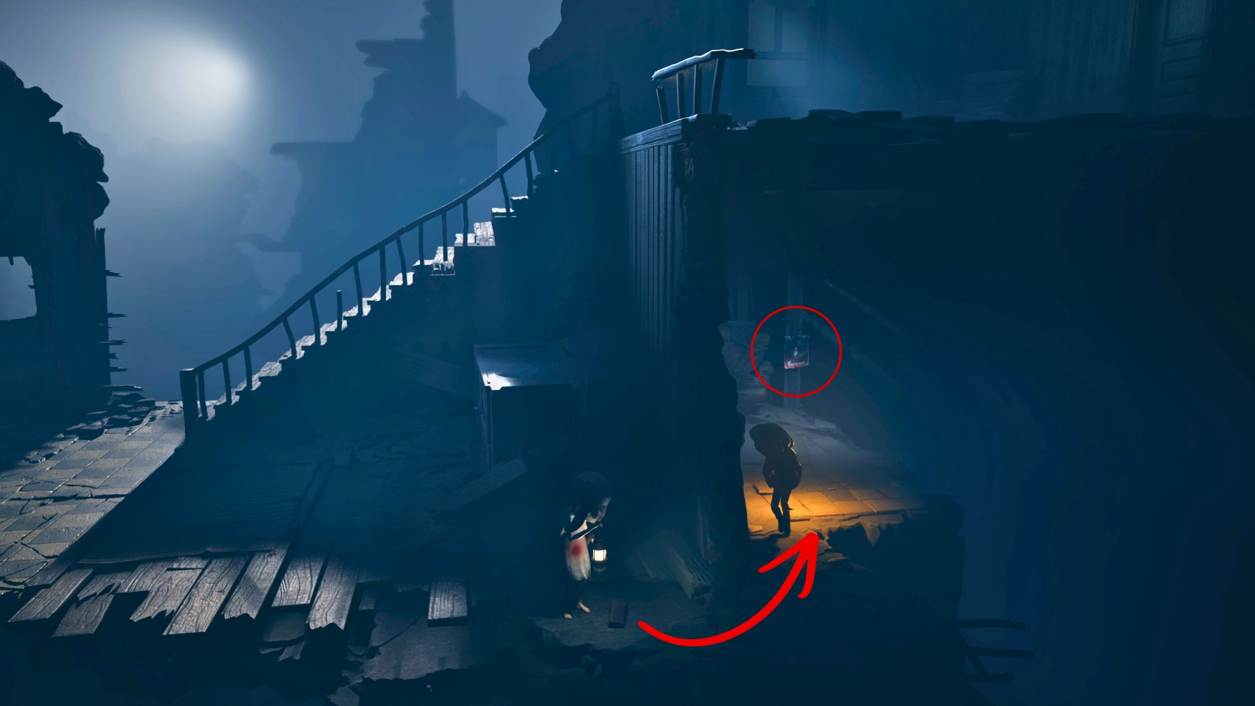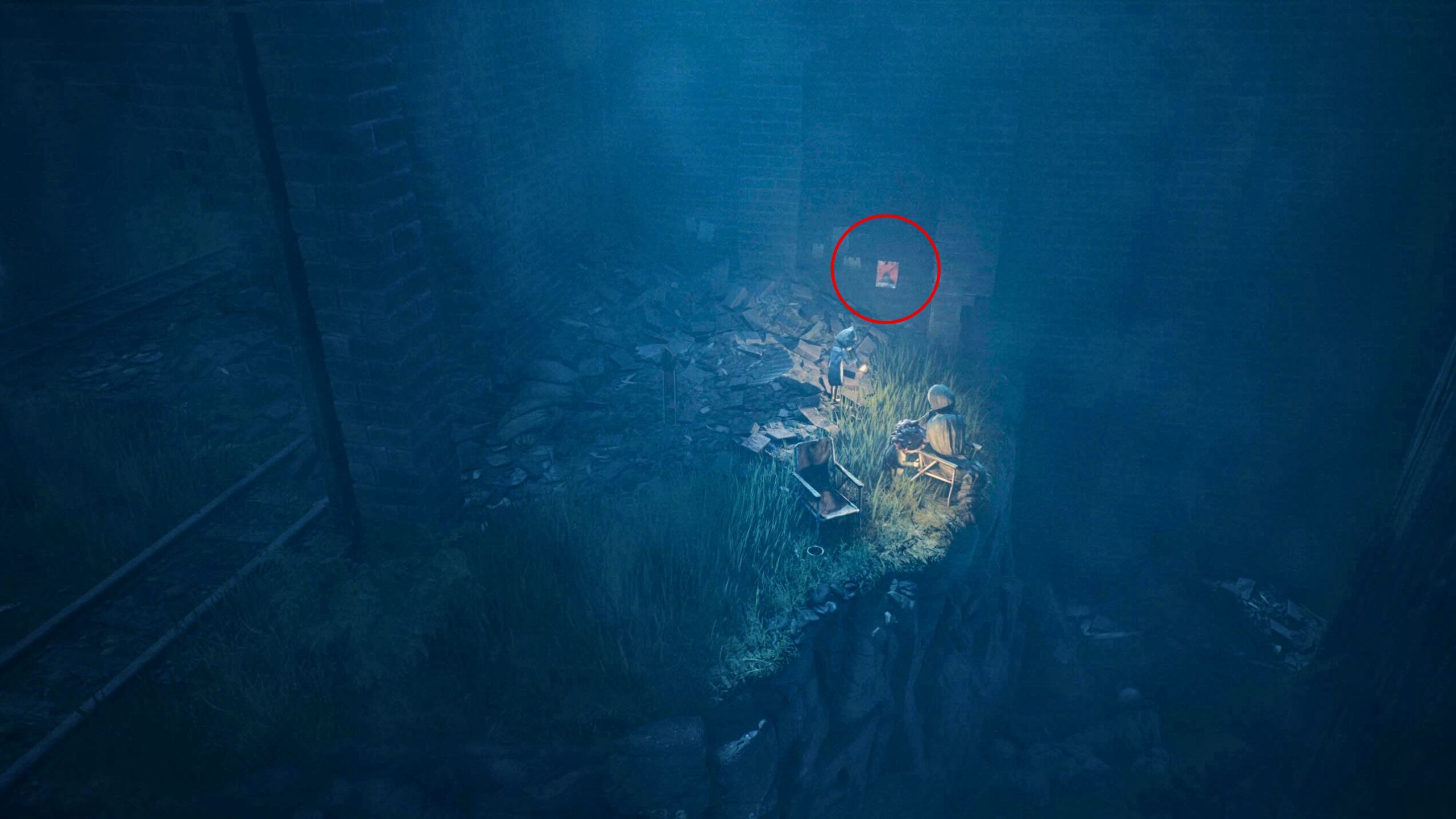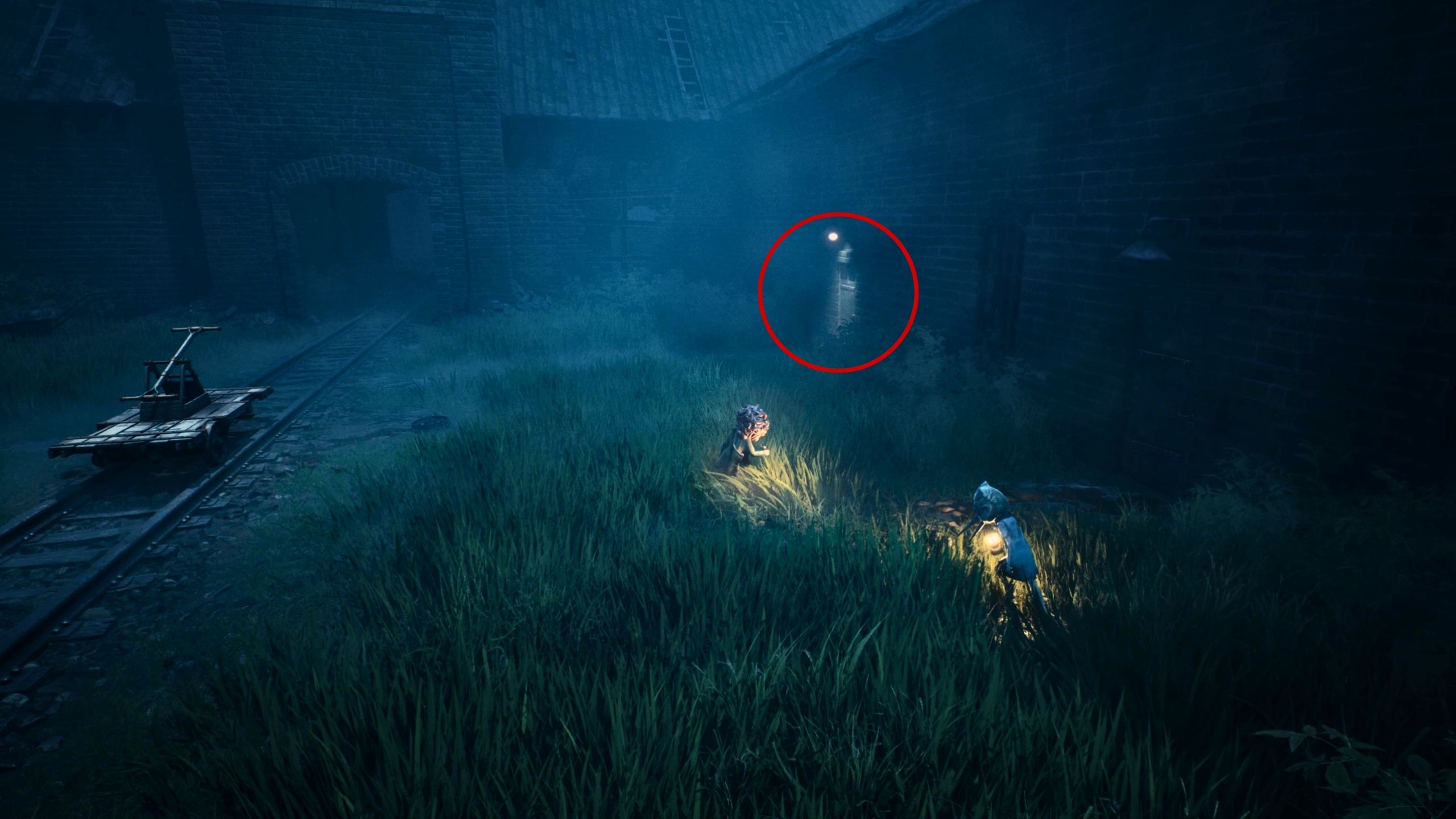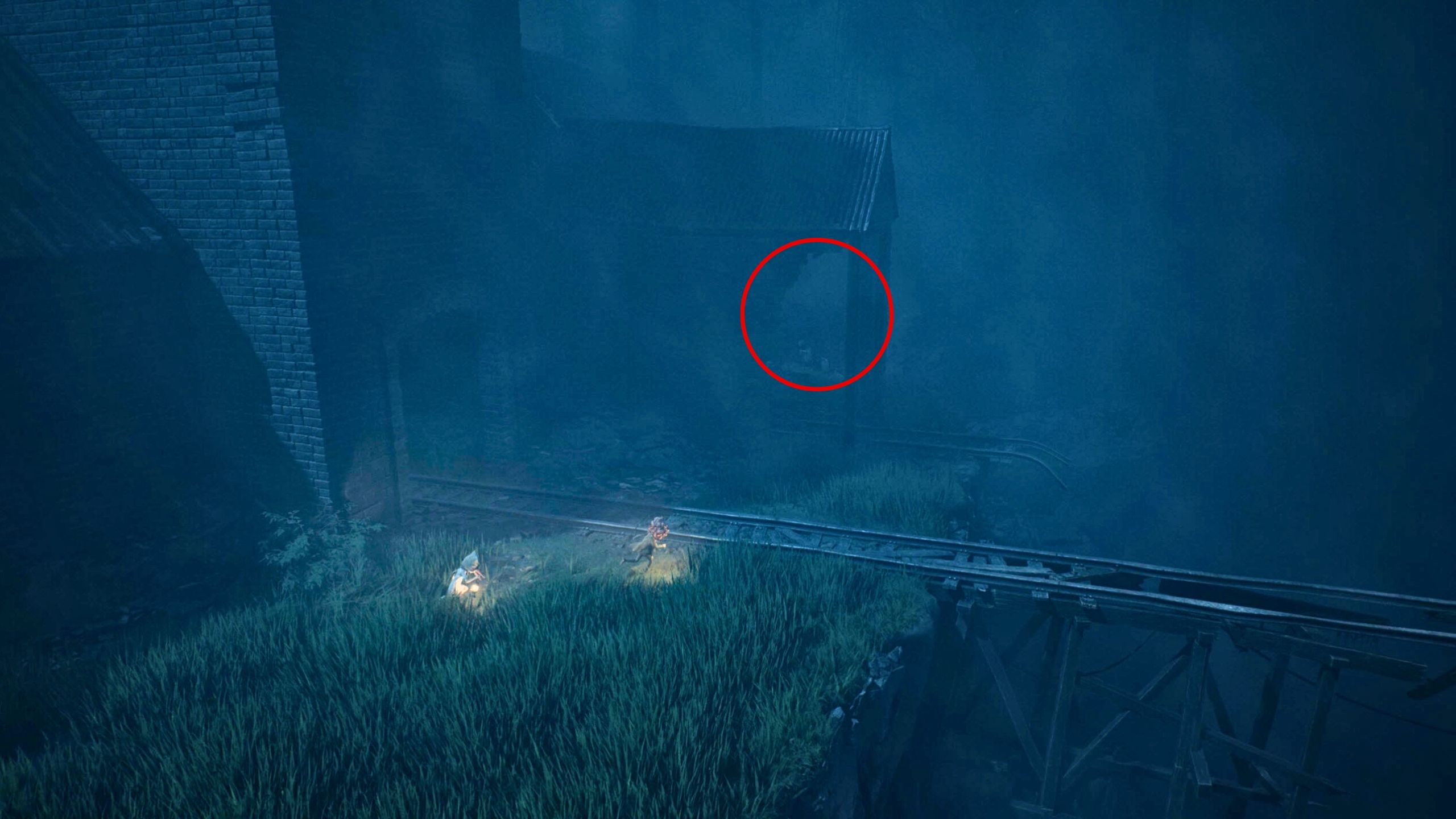 As you progress through the Mill area in the first chapter, you’ll reach an open space with train tracks and see the Sniffer moving around. Instead of immediately following the Sniffer, explore the ruined building on your right first.