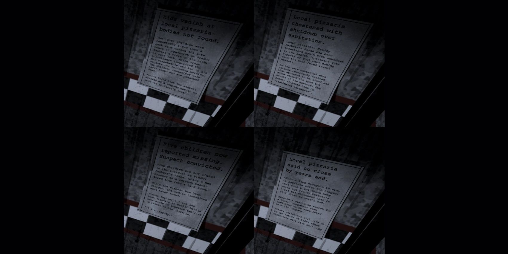As a dedicated gamer immersed in this intriguing narrative, what sends a shiver down my spine is the unsettling fact that the bodies of the victims were never discovered. The articles paint a crystal-clear picture of their grim fate, yet it’s as if the animatronics were left unexplored or perhaps the company had a hand in hushing things up. This notion feels subtly hinted at by how scant the story is in the actual gameplay. If you rush through without paying attention, you’ll only grasp the bare bones of what transpired. The terror here isn’t just about an evil perpetrator, but a corporation seemingly bent on maintaining their reputation by blocking justice from unfolding.