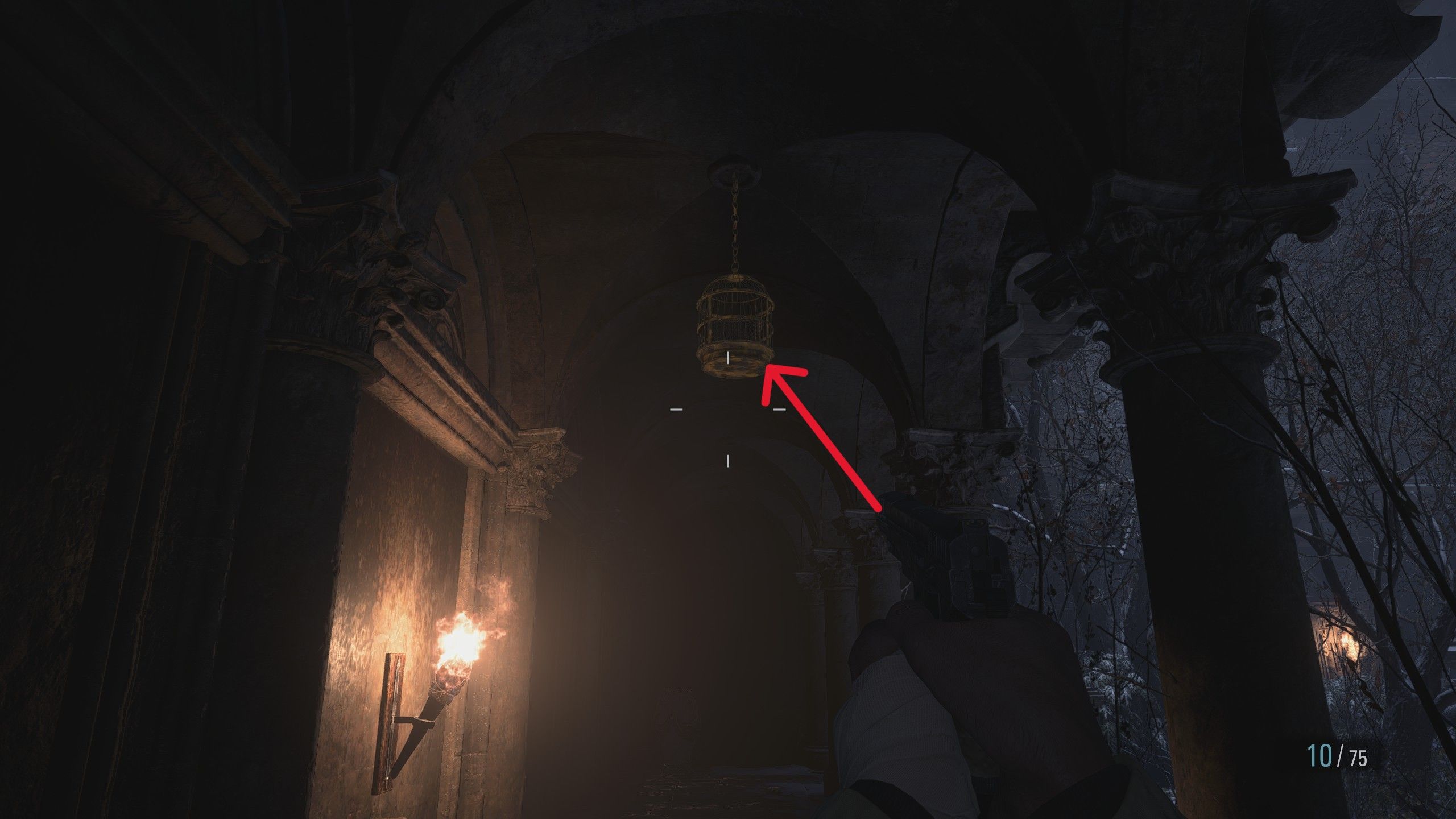 - Shoot the hanging golden bird cage, found between the two gardens directly south of the center of the Courtyard, for 1,000 Lei.