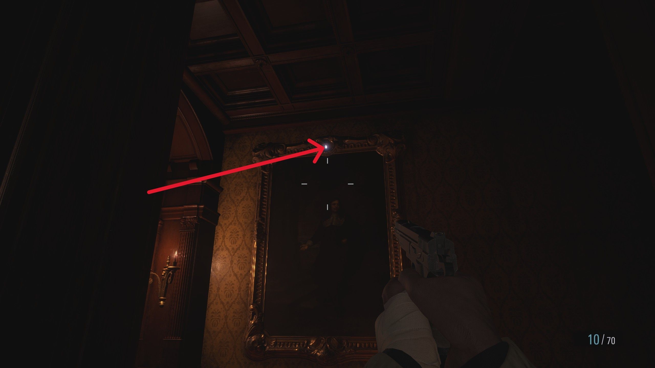 - In the southwest corridor, look up at the painting of a man and shoot the glowing glint on the top of the painting with any gun to drop a Crystal Fragment on the shelf.