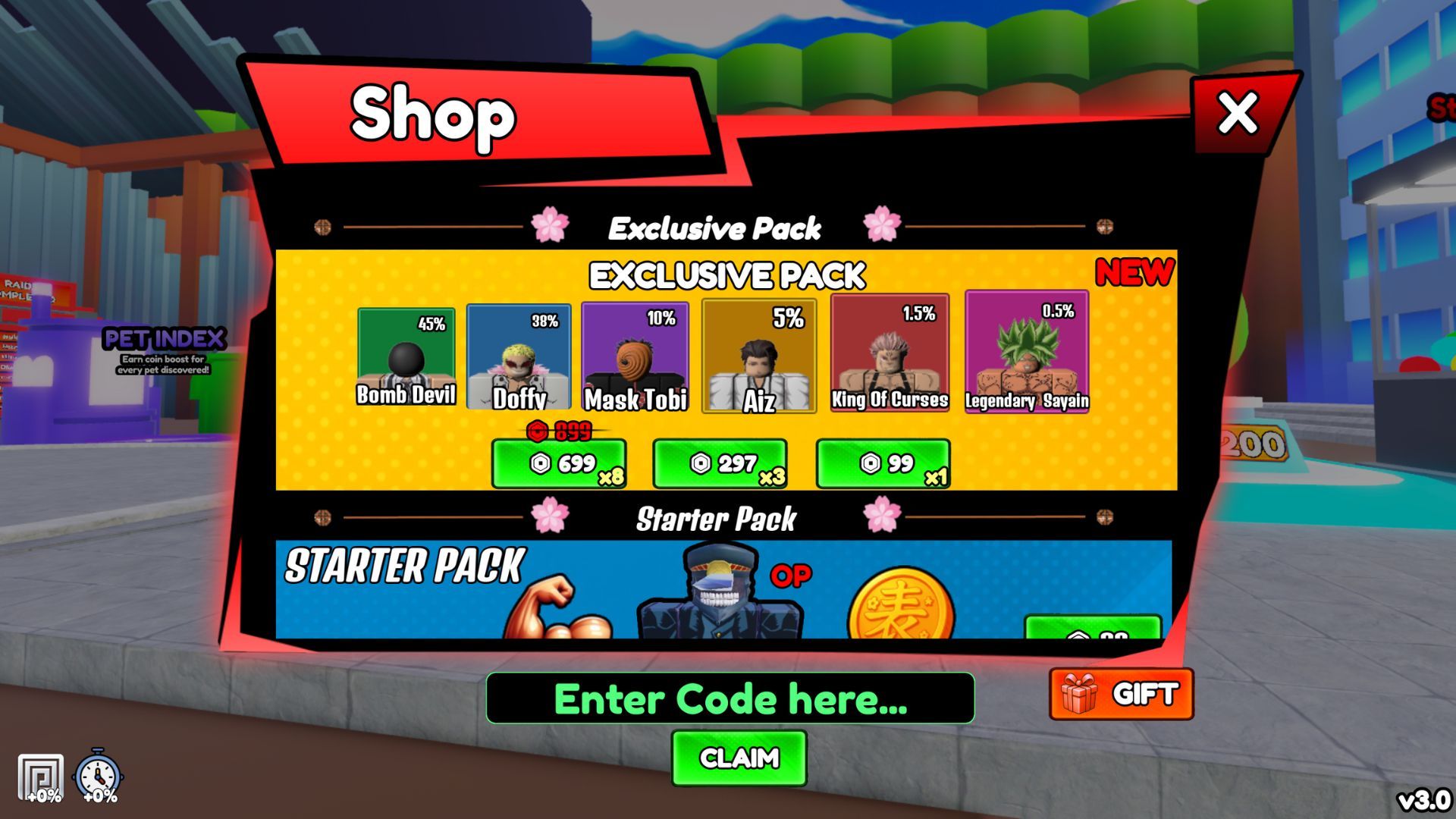 - Below the Shop menu, you will see the line for codes. Enter the one you want to use.