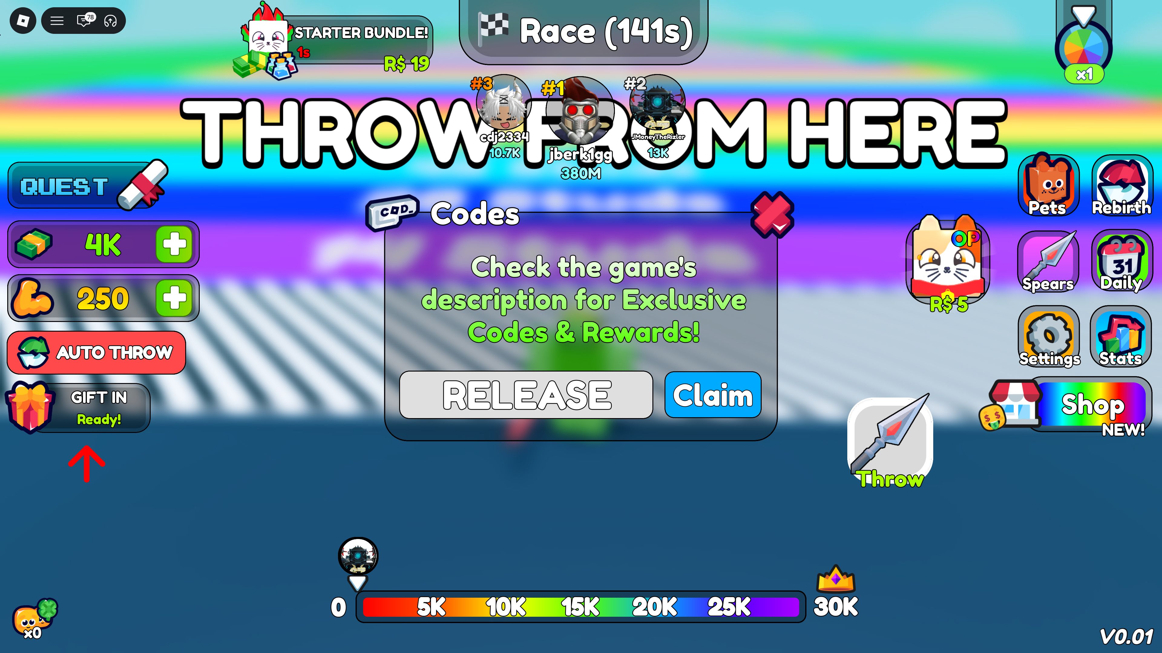 Redeeming codes in Spear Training is easy, just like in many other Roblox games. First, go to the Shop by clicking the rainbow button on the right side of your screen. Then, click the blue ‘Codes’ button at the bottom of the Shop menu and enter a valid code from the list above into the text box. Finally, click the blue ‘Claim’ button to get your rewards!