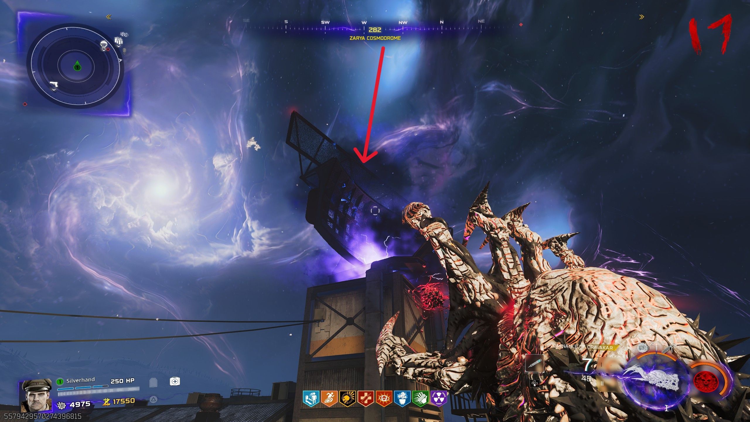Now that you’ve reached Zarya Cosmodrome, find the two array towers to the northwest and northeast. Use the Necrofluid Gauntlet’s charged shot on them. These towers spin quickly, but firing at one while the Gauntlet is powered up by the clock tower will slow it down. After hitting the first tower, go back to Ashwood to recharge the Gauntlet at the clock tower, then shoot the second tower.
