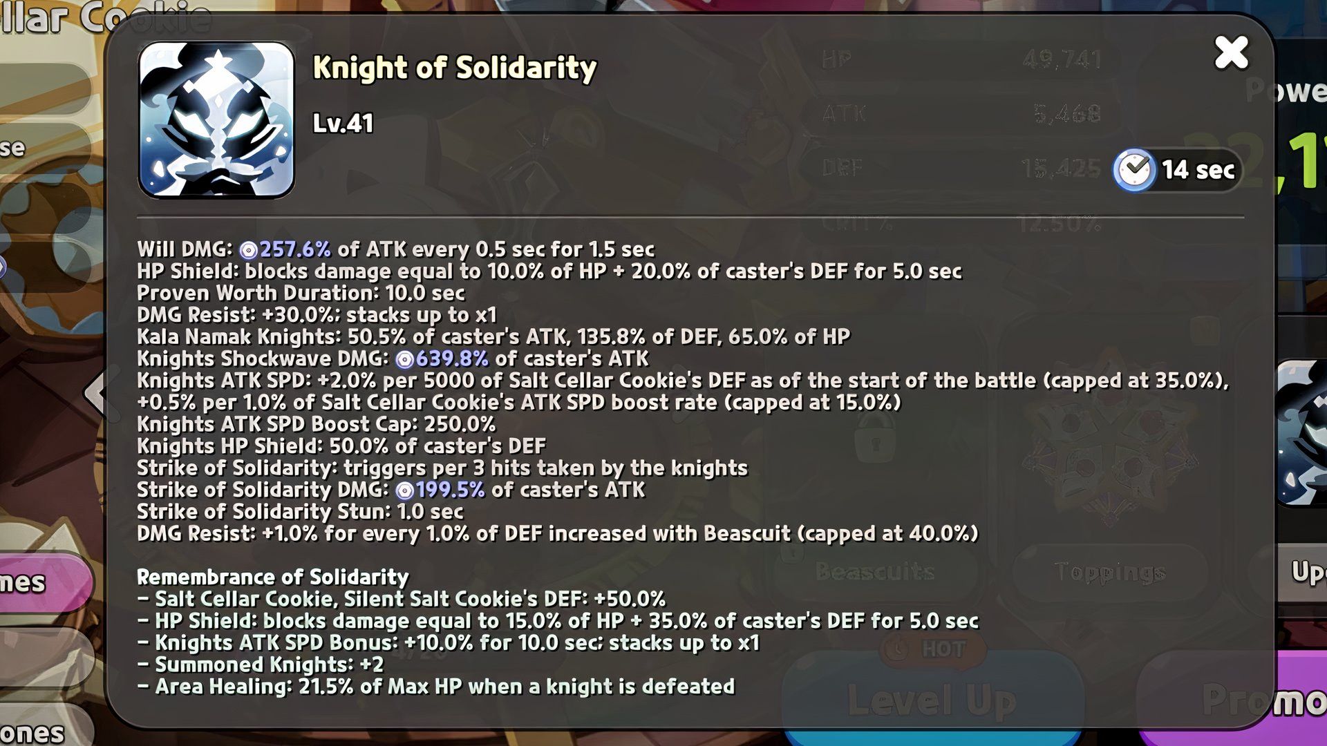 When activated with the Silent Salt Cookie, her ability becomes even more powerful. A feature called Remembrance of Solidarity gives her increased damage resistance, lets her summon two additional knights, restores her health when a knight is defeated, and provides extra buffs to help her stay strong in battle.