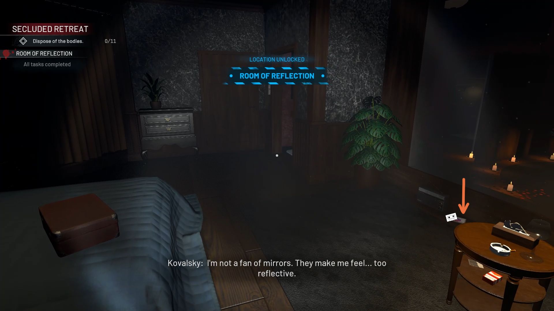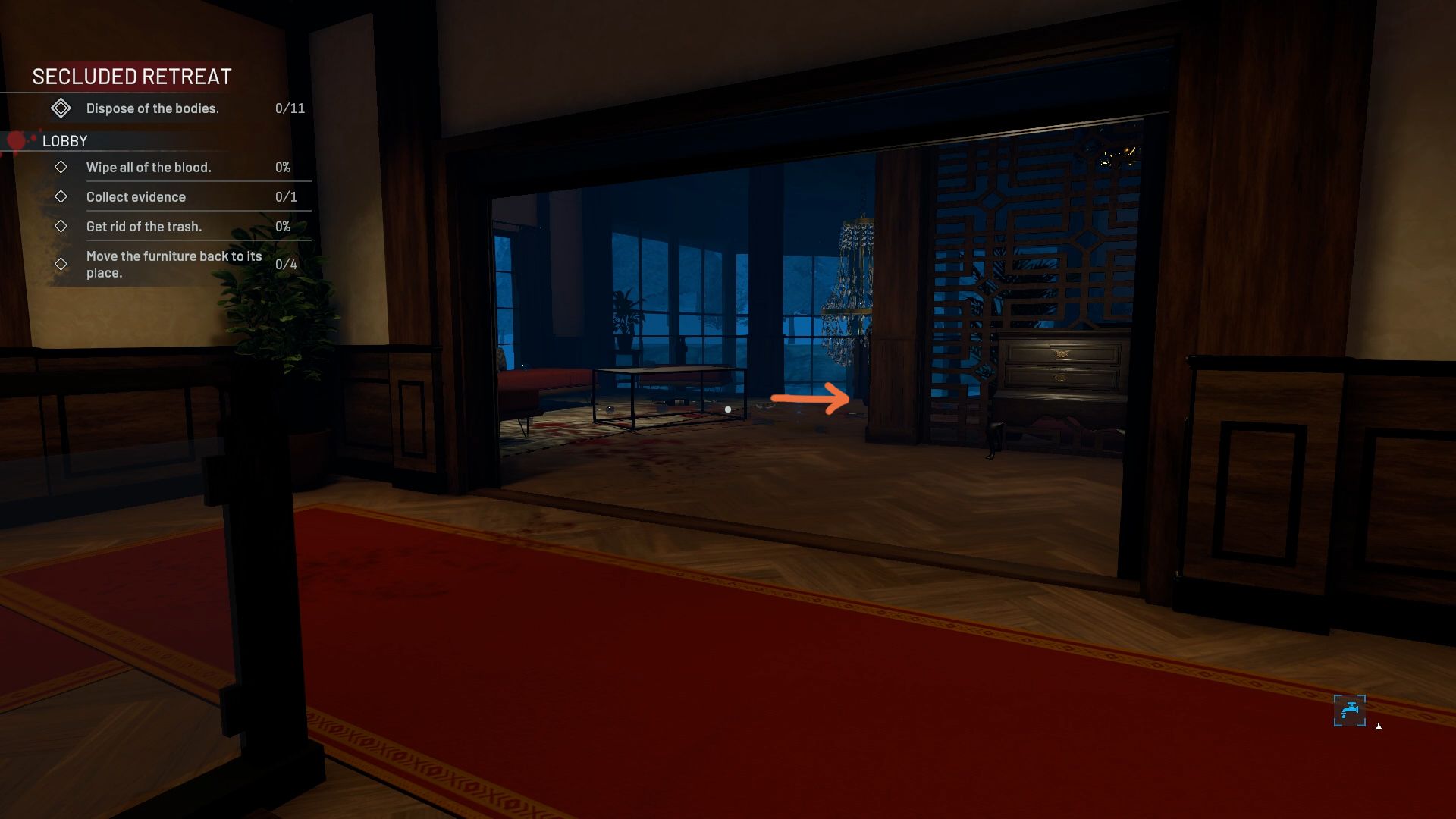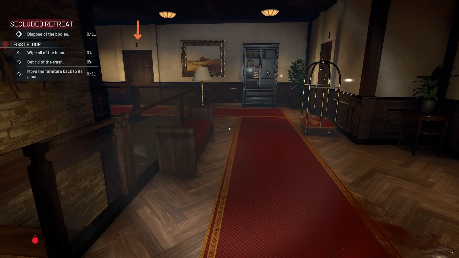 As soon as you reach the top of the stairs, you’ll notice the chandelier. Once inside, you’ll find a piano to your right and a body near the entrance.