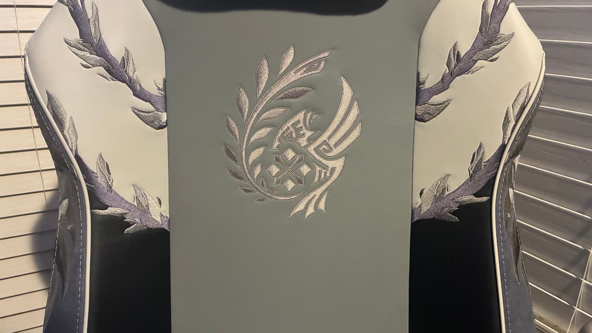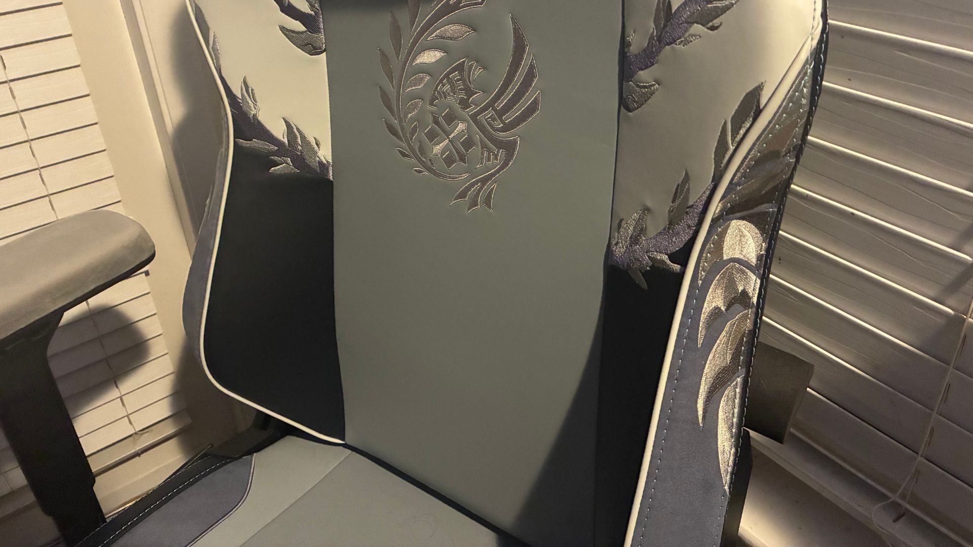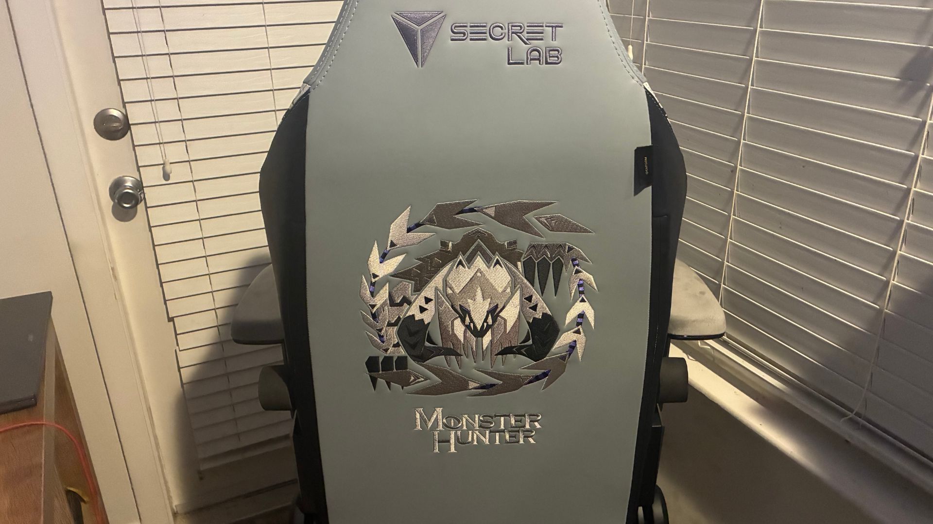 The chair prominently features the Monster Hunter Wilds logo on the backrest, right where you’d sit. It’s a striking silver color with bold, thick stitching, making it the largest Monster Hunter logo ever seen on a chair – and it looks fantastic.