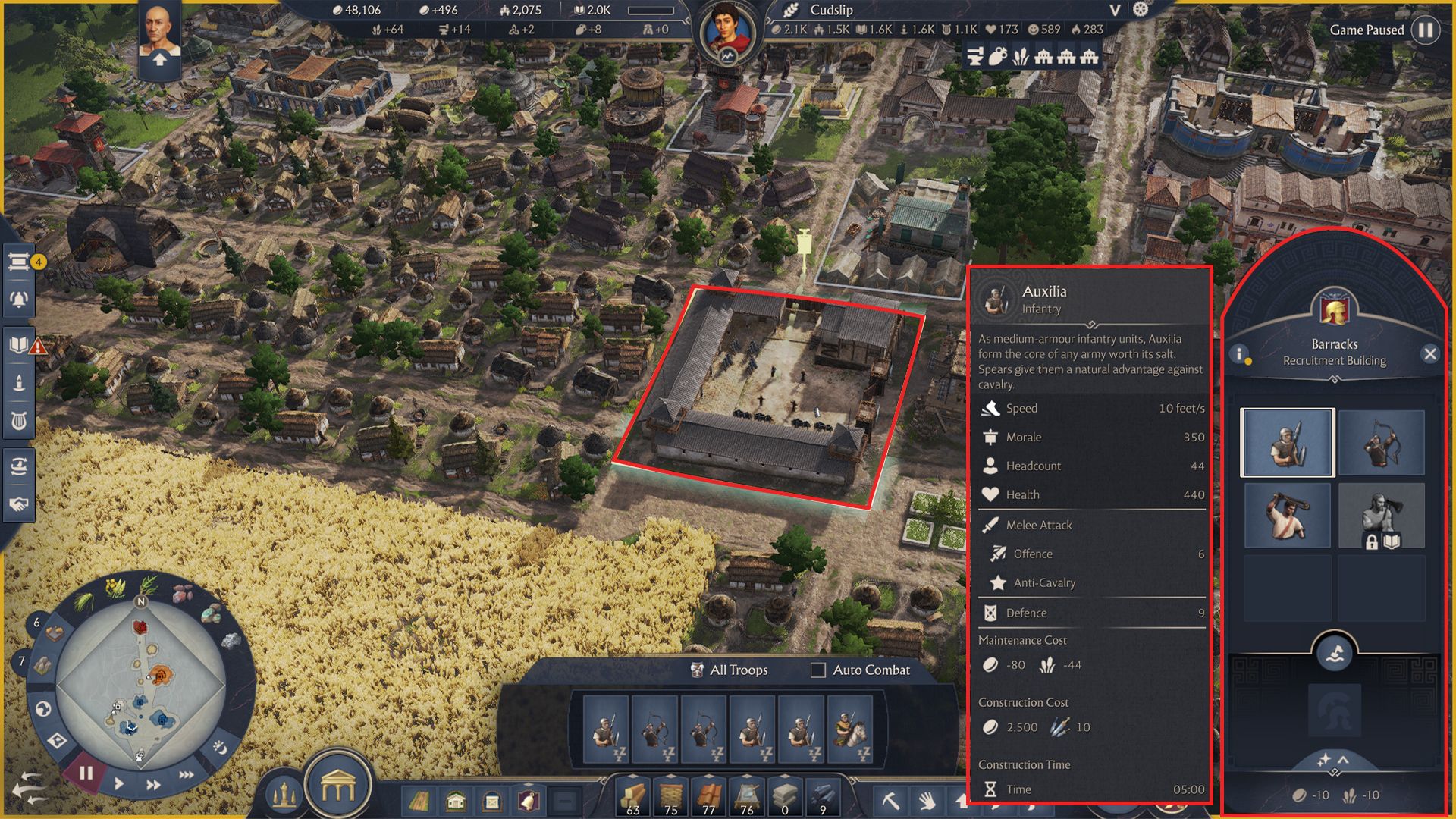 Once I unlocked the Barracks, I could finally start building my army! At first, I was limited to recruiting Auxilia and Archers, but it was a great start.
