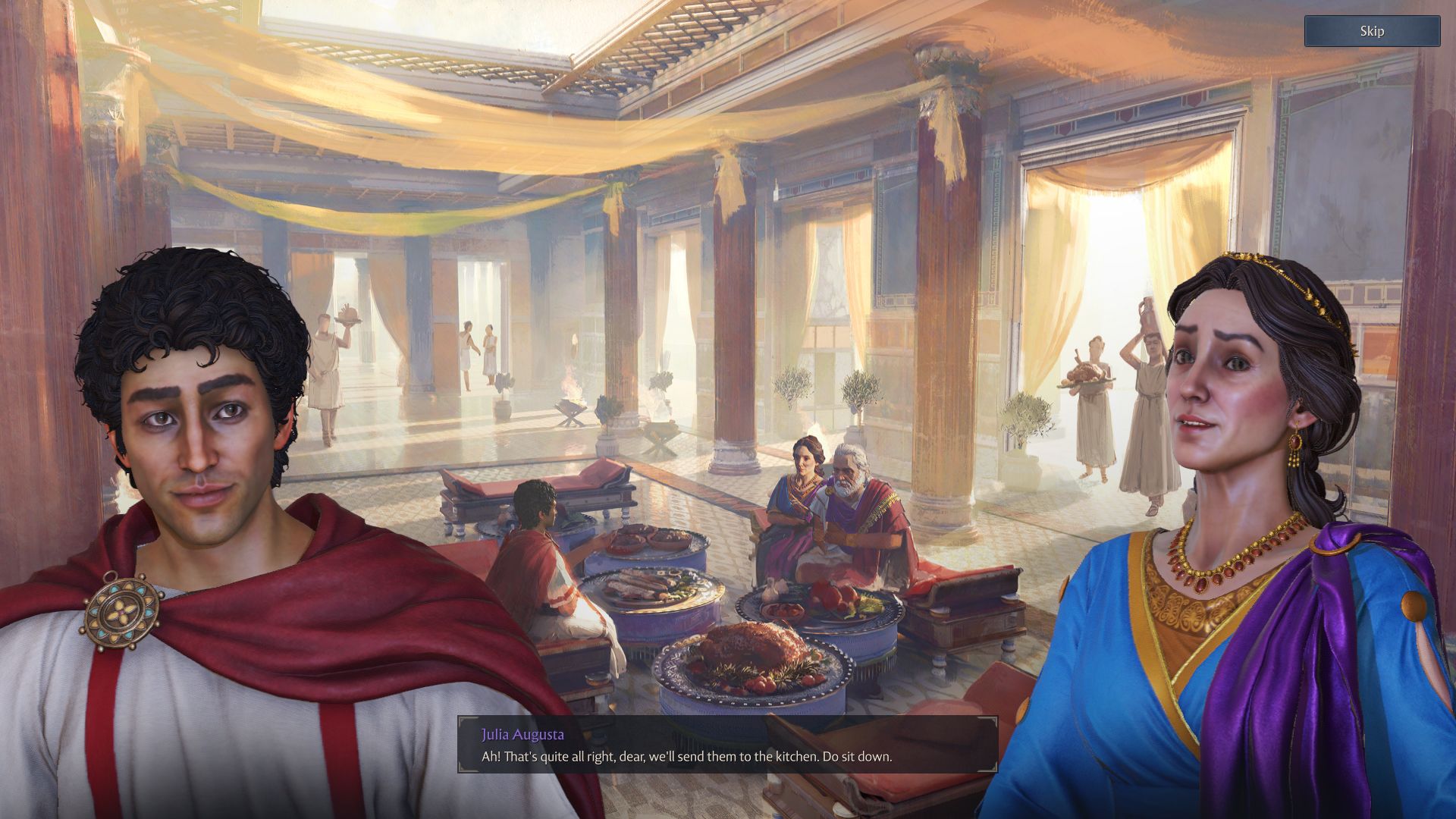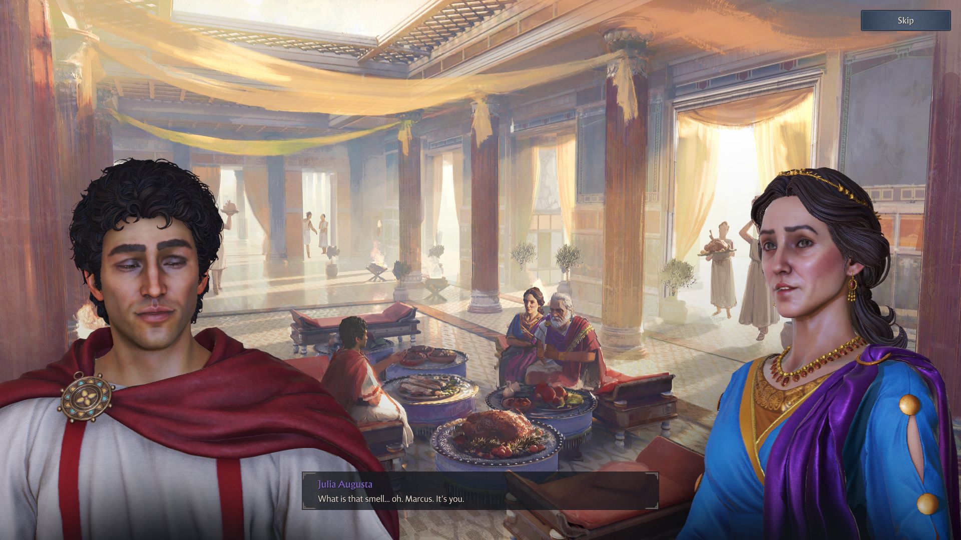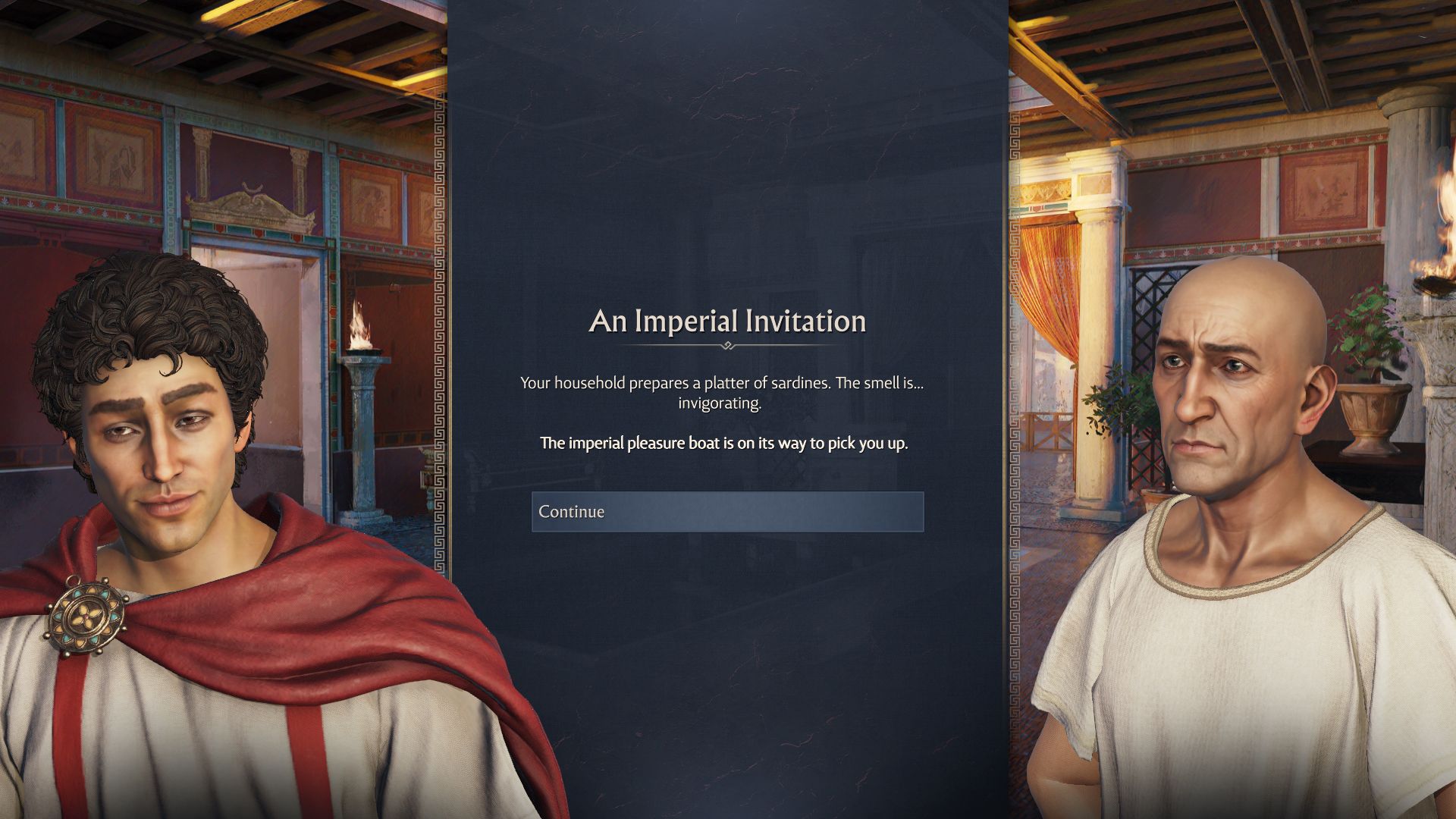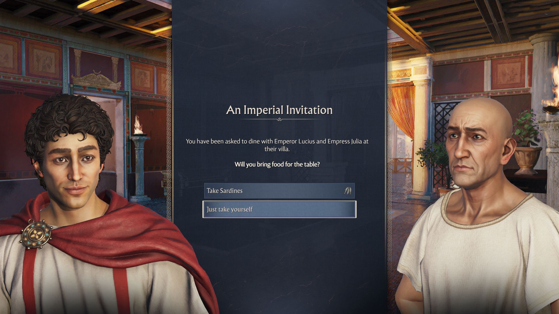 Bringing sardines to the meal with the Emperor and Empress will trigger a hint that they have a strong, revitalizing scent. Once you arrive at the palace, Empress Julia will notice the smell and react differently depending on which character you are playing as in Anno 117: Pax Romana.