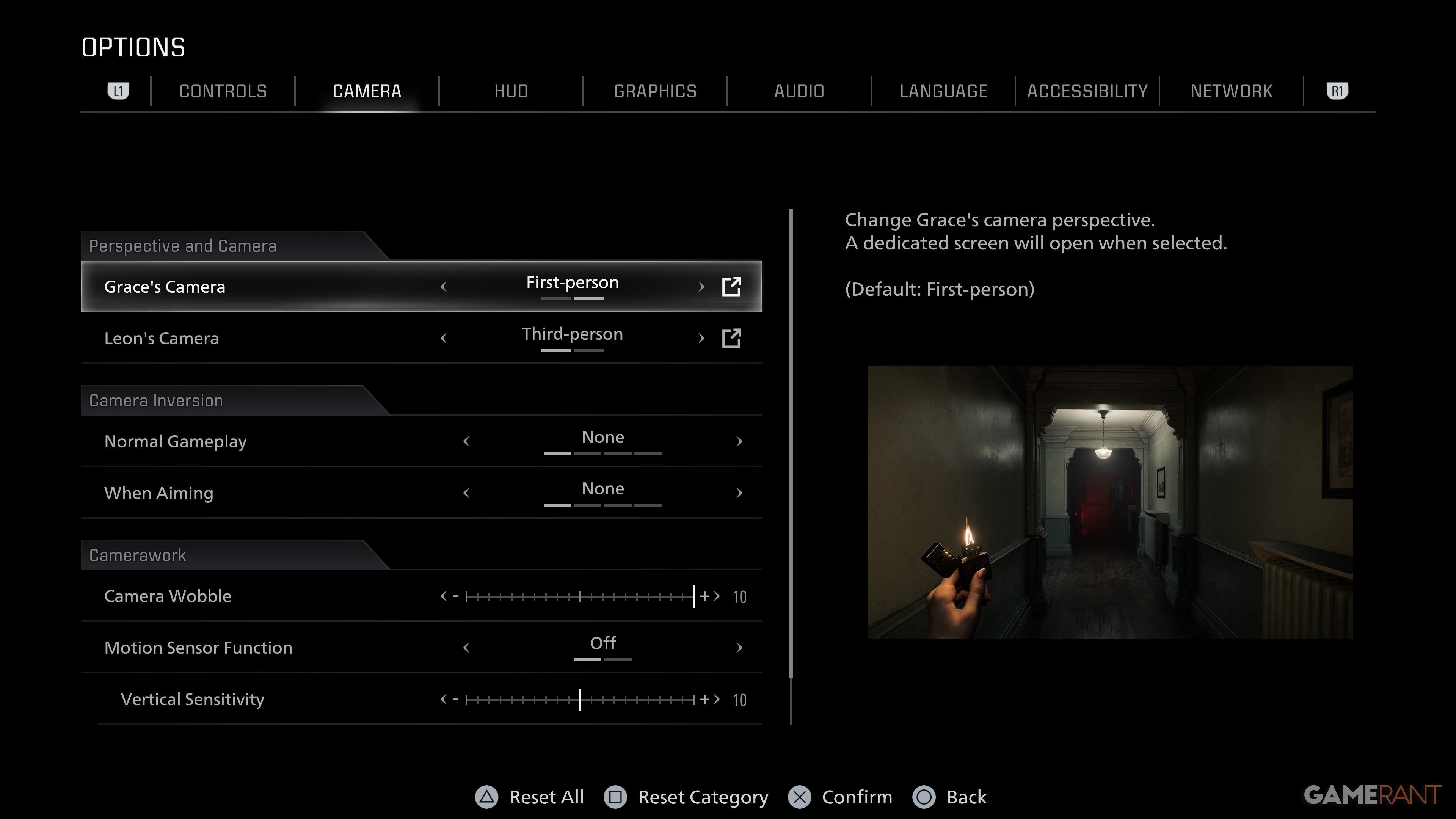 You can adjust the camera view in the Options menu. Press the Select button, then go to the Camera tab. Here, you’ll find settings for both Grace and Leon’s cameras, letting you easily switch between playing in first-person and third-person for either character.