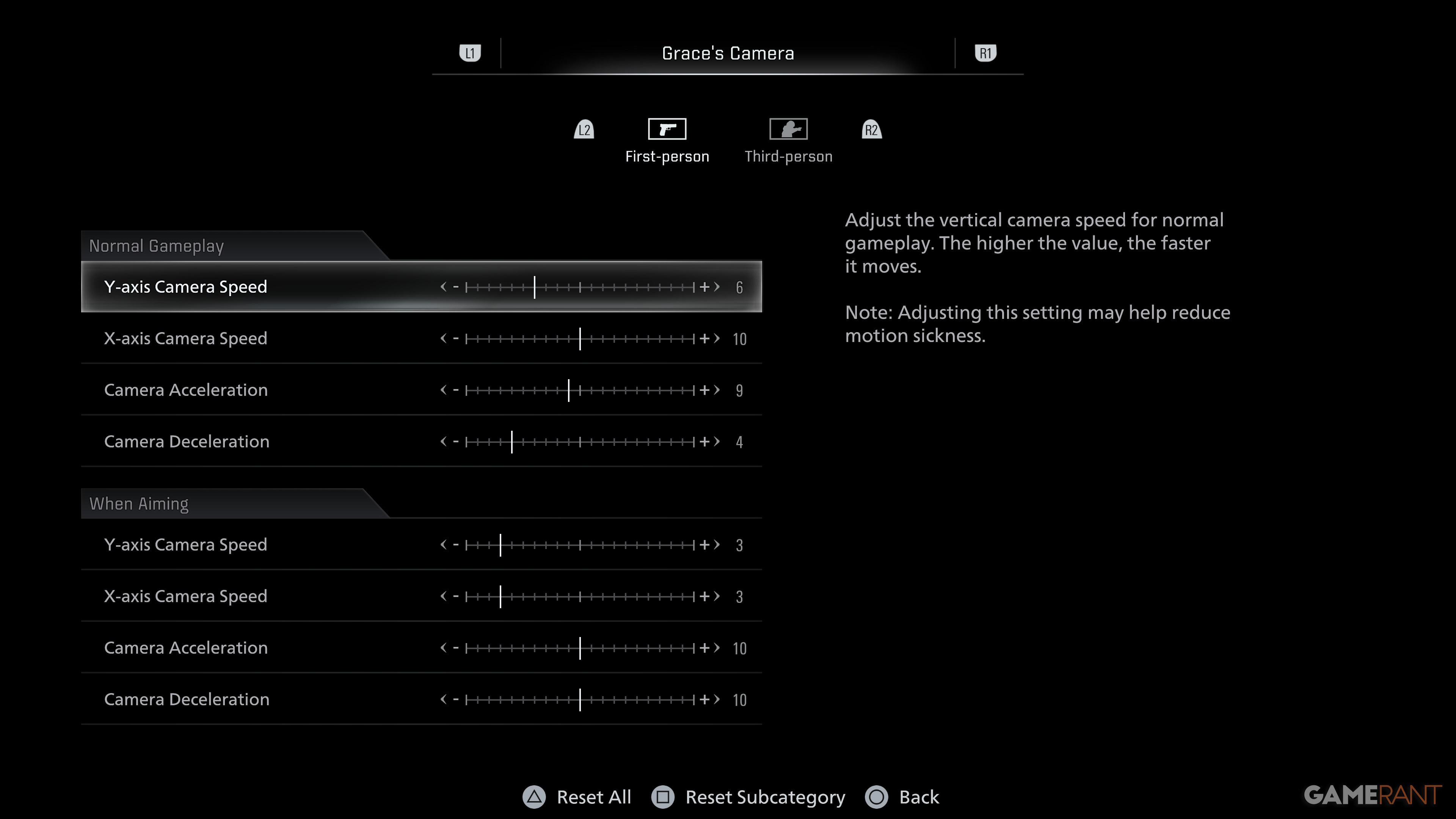 You can adjust how quickly the camera moves during gameplay and aiming by clicking on either Grace’s Camera or Leon’s Camera settings. This lets you customize both the speed and how smoothly the camera accelerates and decelerates, giving you more precise control.
