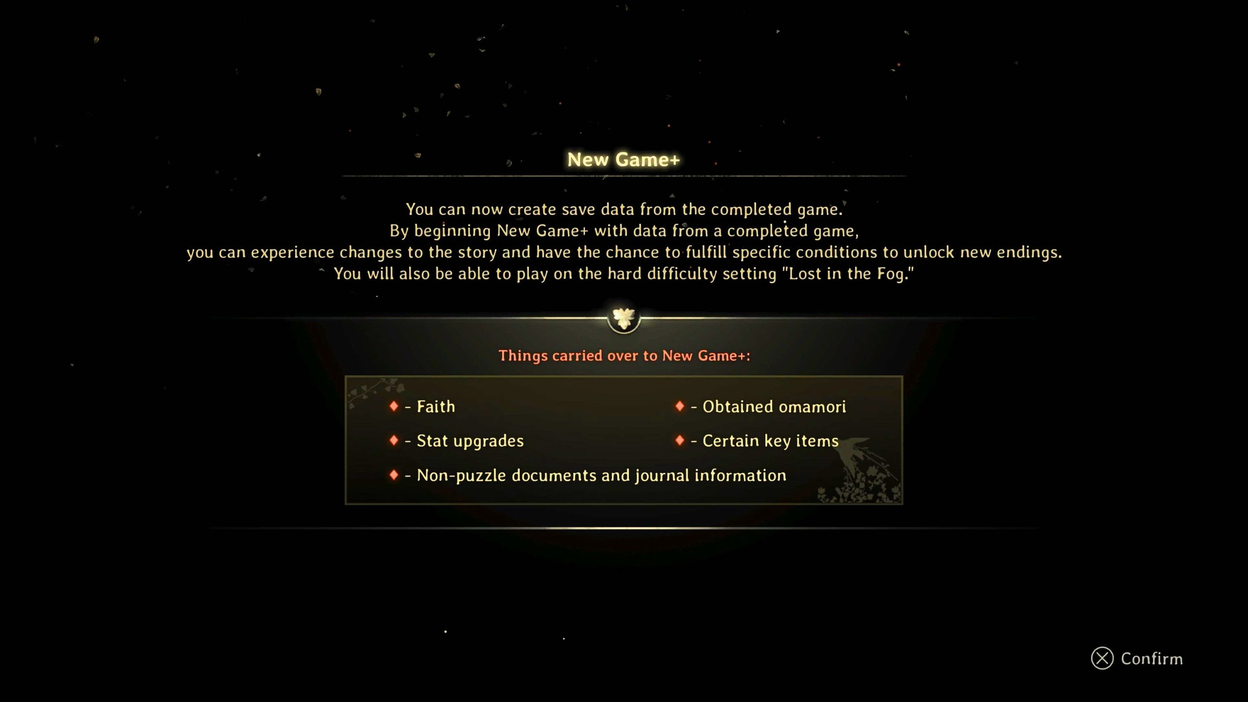 Don’t worry about starting New Game+ from scratch! You’ll keep your progress, as things like Faith, Omamori, stat Upgrades, lore documents, and certain key items will carry over.