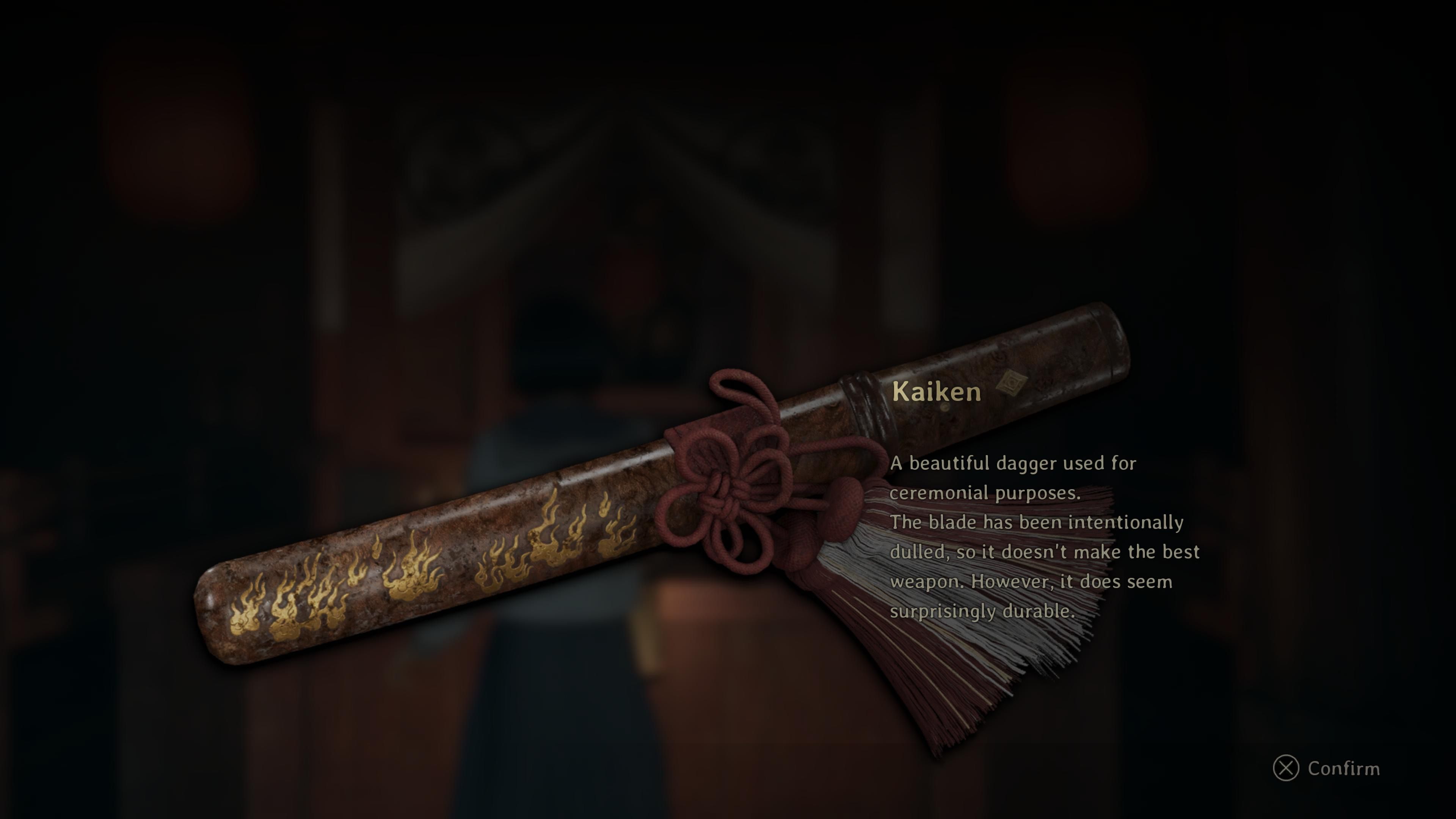 The Kaiken was a small dagger traditionally used in Japanese ceremonies and, historically, served as a self-defense tool for women, particularly those married to samurai. In this game, however, the Kaiken’s blade is deliberately made blunt, resulting in very little damage.