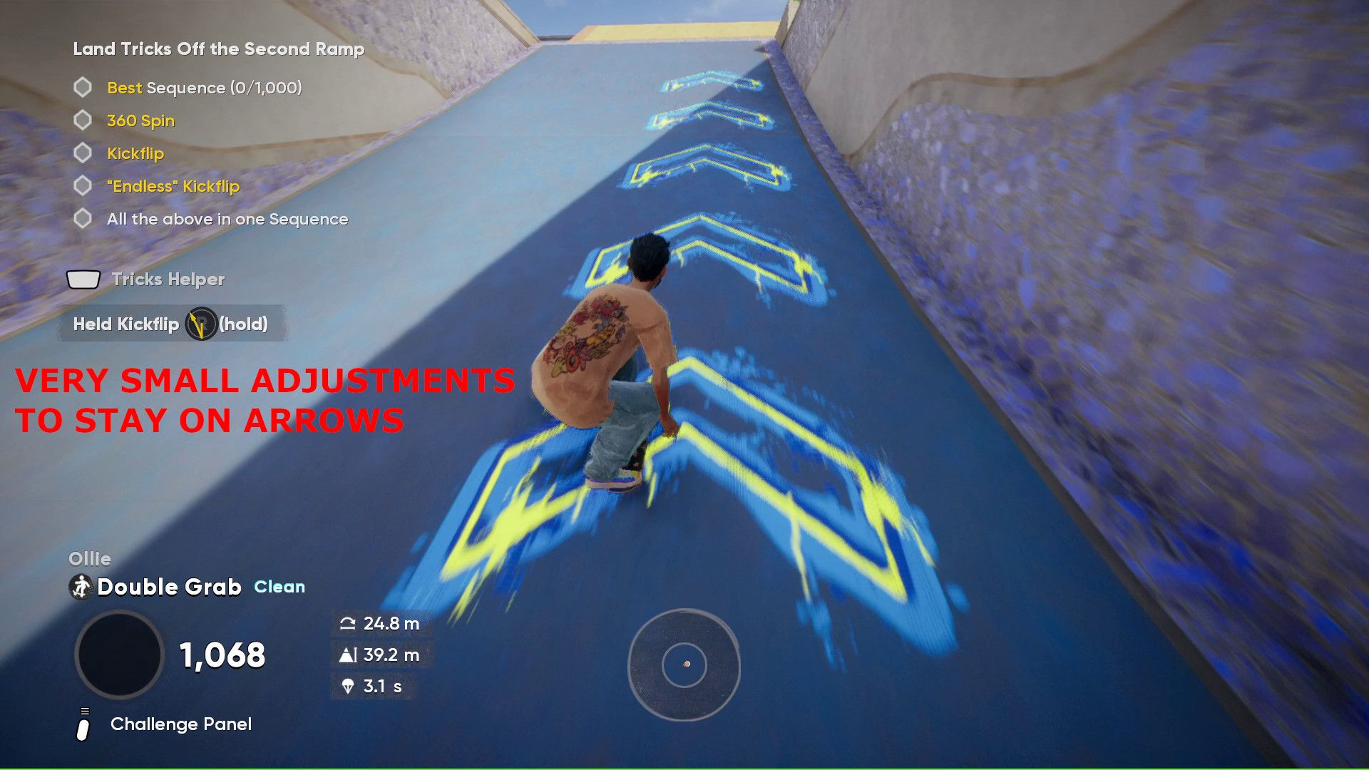 - After passing the last arrow, hold down on the right joystick and then hold it up and diagonally to the left at the very end of the ramp to start a kickflip.