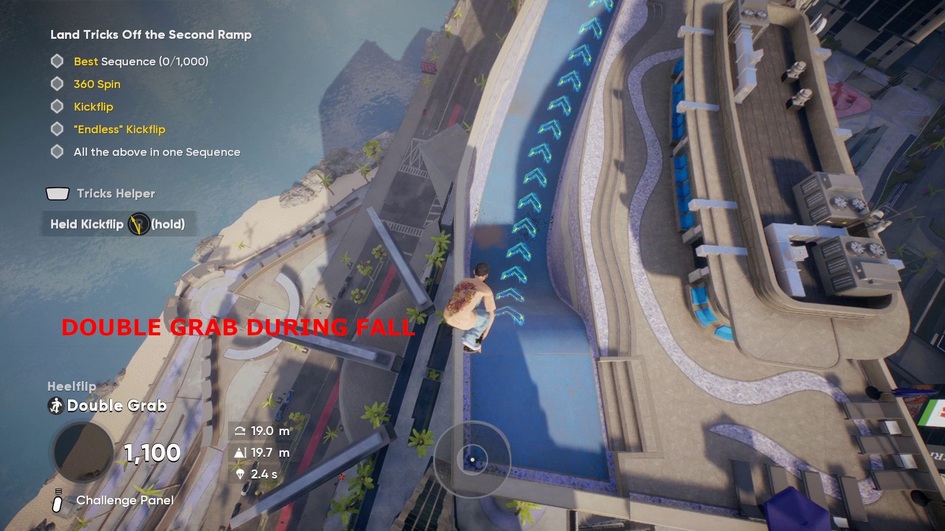 If you’re consistently underestimating your landing distance, try making small, gentle adjustments with the left joystick while on the blue ramp. Pressing the stick too hard actually slows your skater down, so use a light touch. Also, be sure to perform the double grab as you approach the ramp and time your kickflip for the very last moment.