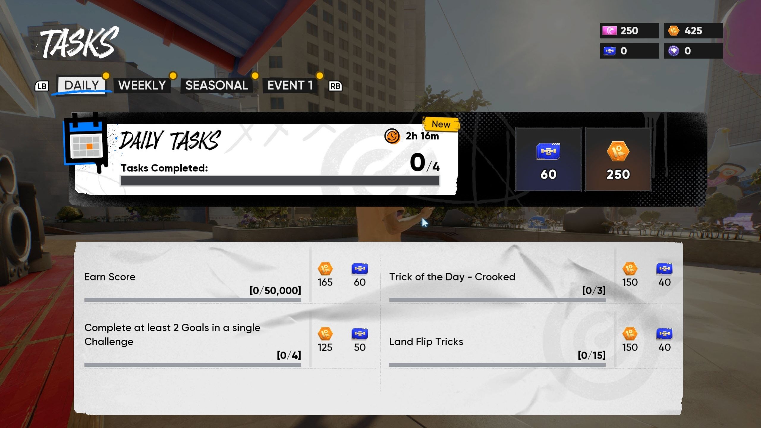 To finish the daily “Crooked” challenge in Skate, you need to land the trick three times. You can find the challenge tracker by going to the tasks menu from the main screen. This menu shows your progress on completing the Crooked trick.