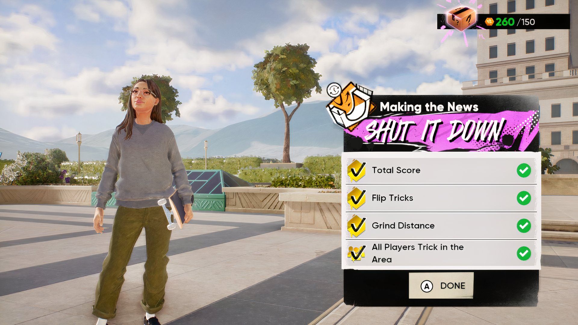 | 7 | Simply the Best | Triumph over other players to win 4 Throwdowns. | Hold down on the d-pad and select the Throwdown option and let everyone join. This will trigger a Skate Jam mini-game, which you’ll need to win against other players. Set up three more, or join other players’ Skate Jams on the map. You can also host a Throwdown in a party. |
