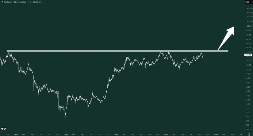 Let us zoom out, dear audience, and consider the grand performance from a long-term perspective. The logarithmic chart for Solana is displaying a rather clean and steady consolidation base, upon which the final act could unfold. A breakout from this range might just unlock an extraordinary multi-hundred-percent rally, one that will leave the audience gasping in awe.