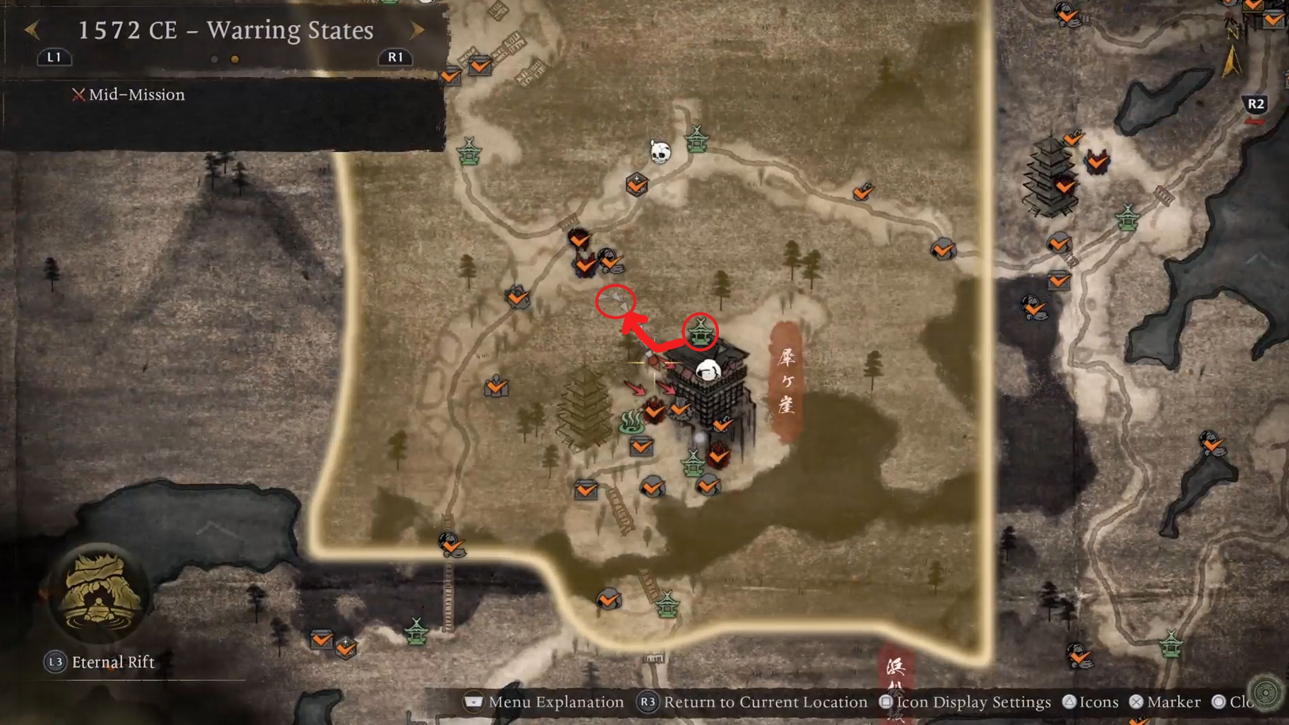 When you reach the Futamata Castle Defensive Gate Shrine, go around the enemies and head upstairs. After defeating Baba Nobuharu, you’ll finish a main quest and get the Demon of Mino’s Charm. Bring the charm back to the ghost, and he’ll ask you to find another item.