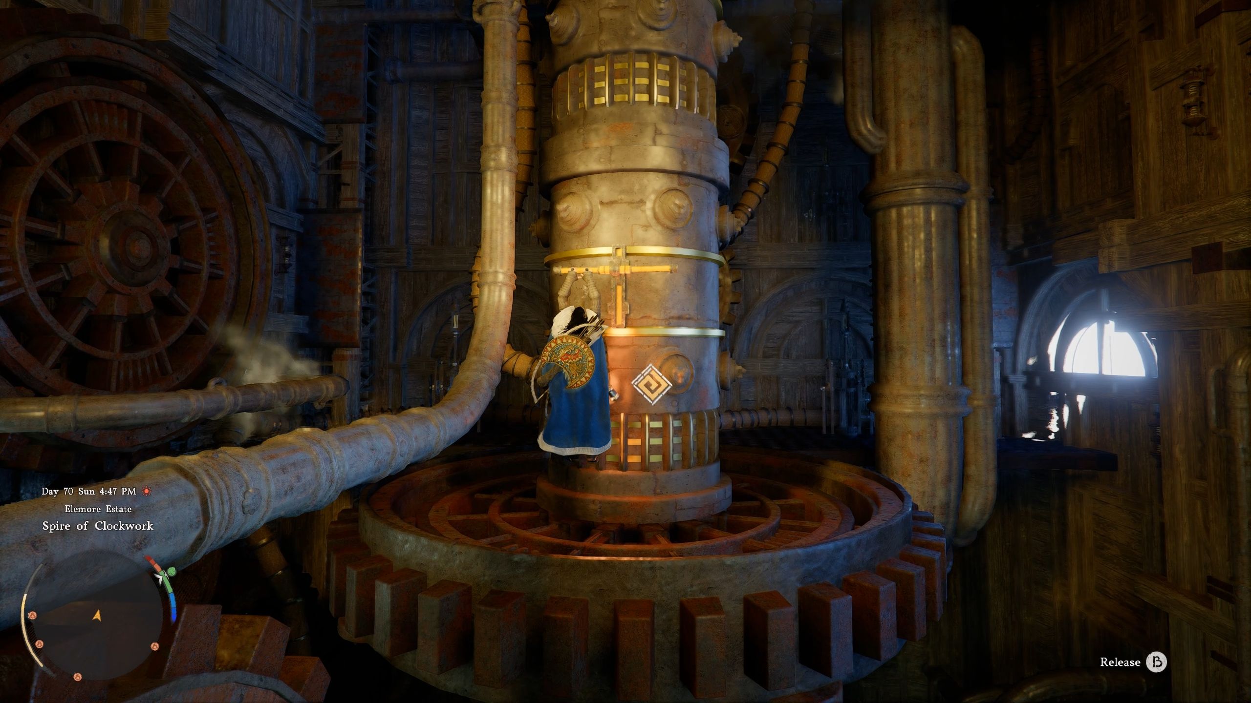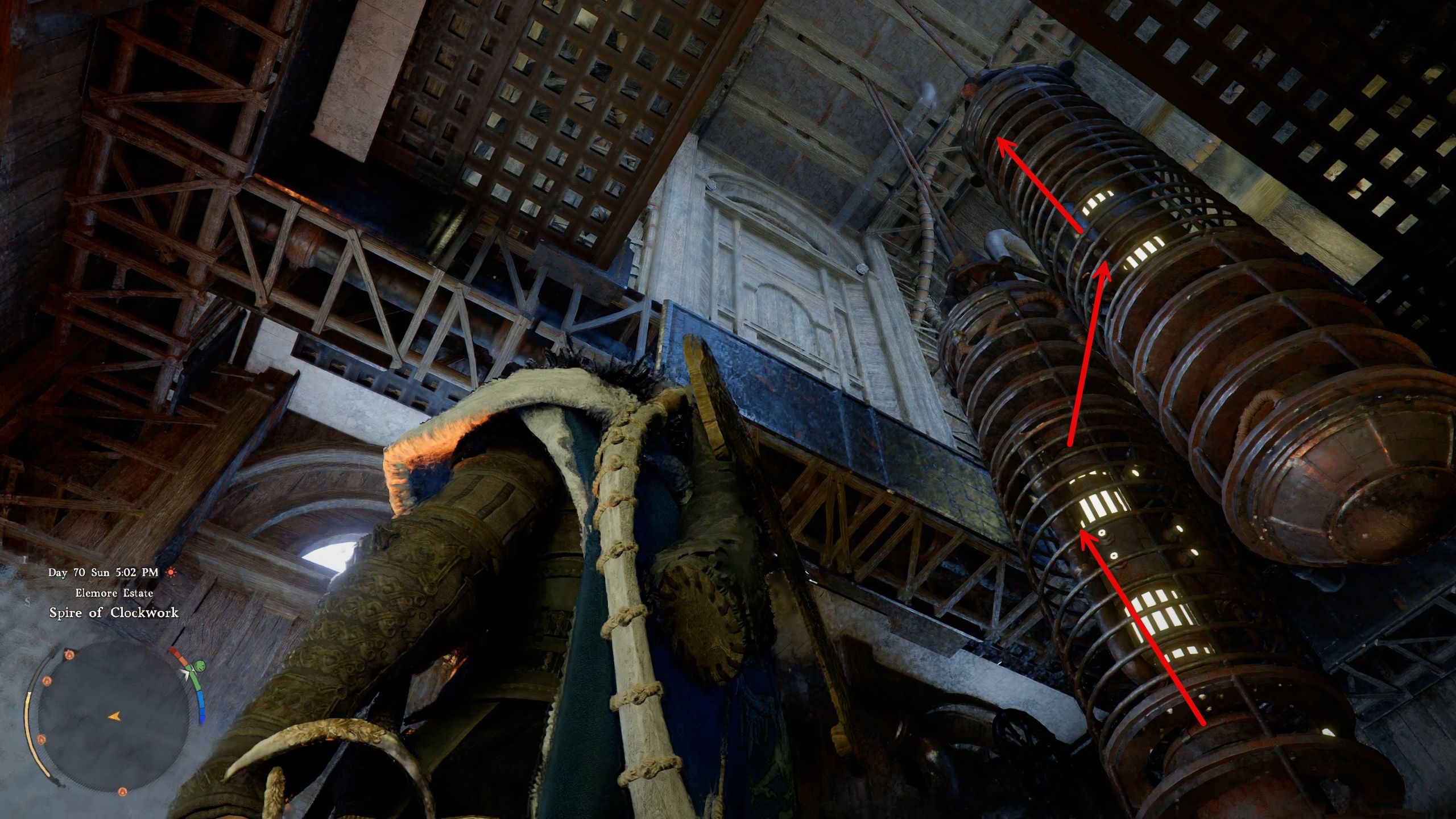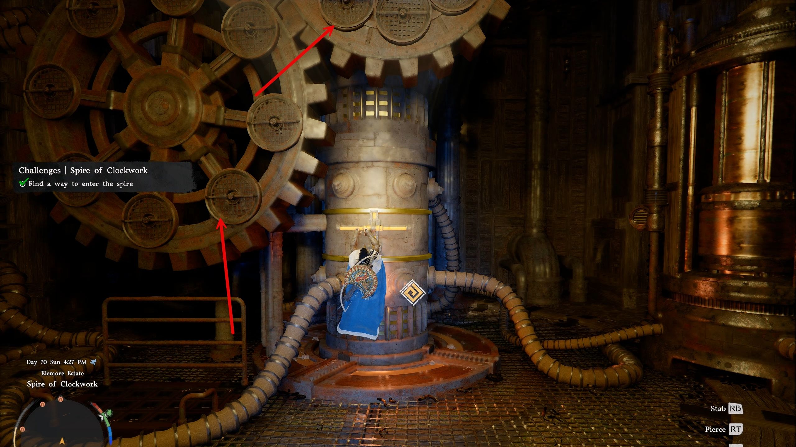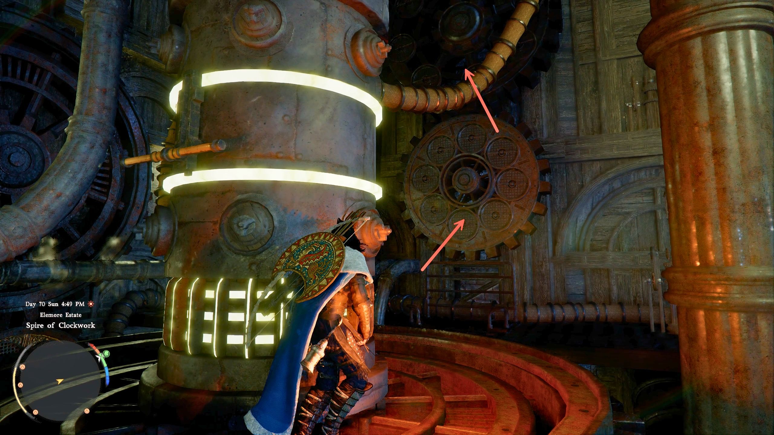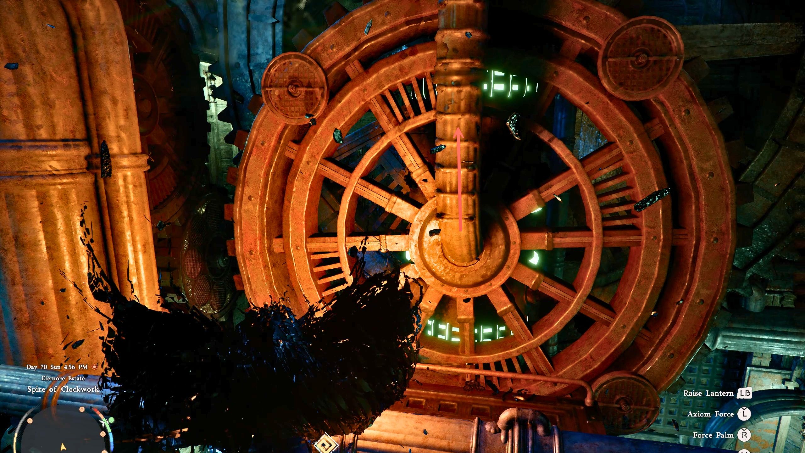 After pulling the lever, walk around the pillar, and you’ll see some gears you can climb to get to the higher parts of the Spire.