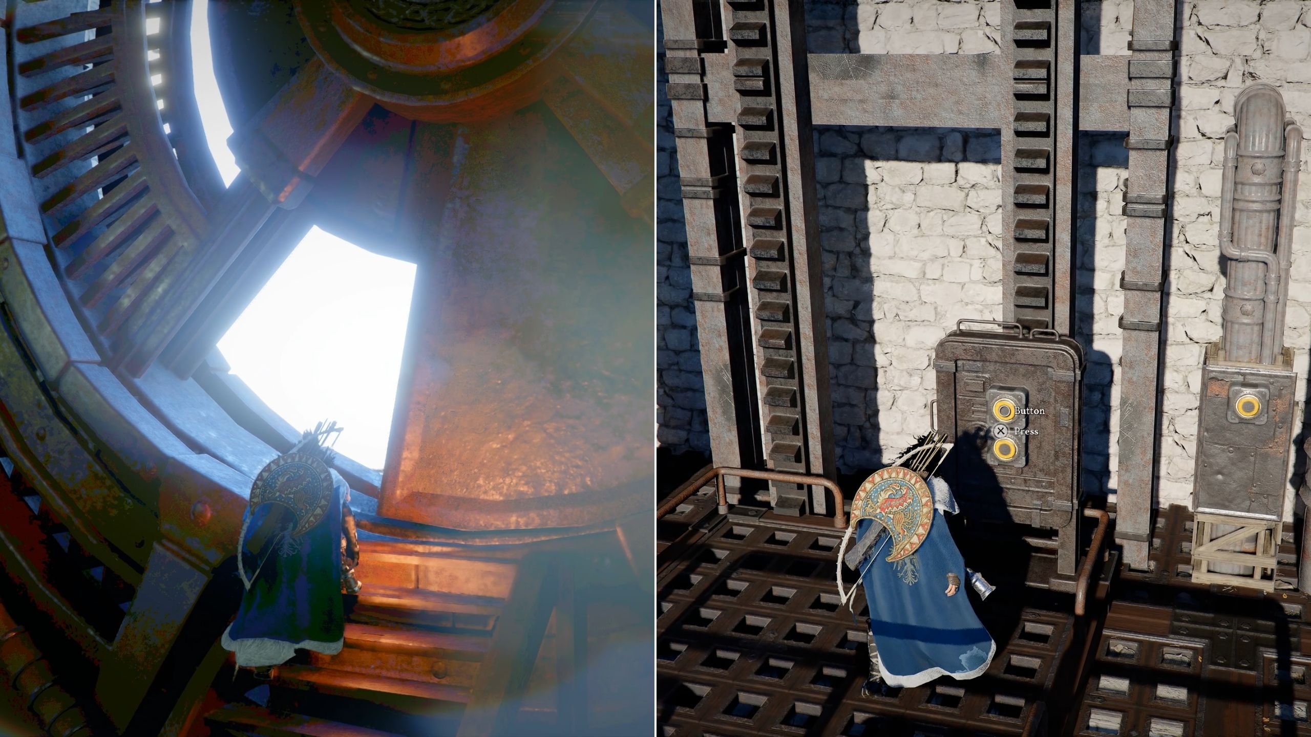 Now that you’ve climbed higher, you’ll see two weighted tubes you can use to continue. Climbing one tube lowers it, while raising the other. Carefully time your jumps between the tubes to reach the top of the Clockwork Spire in Crimson Desert.