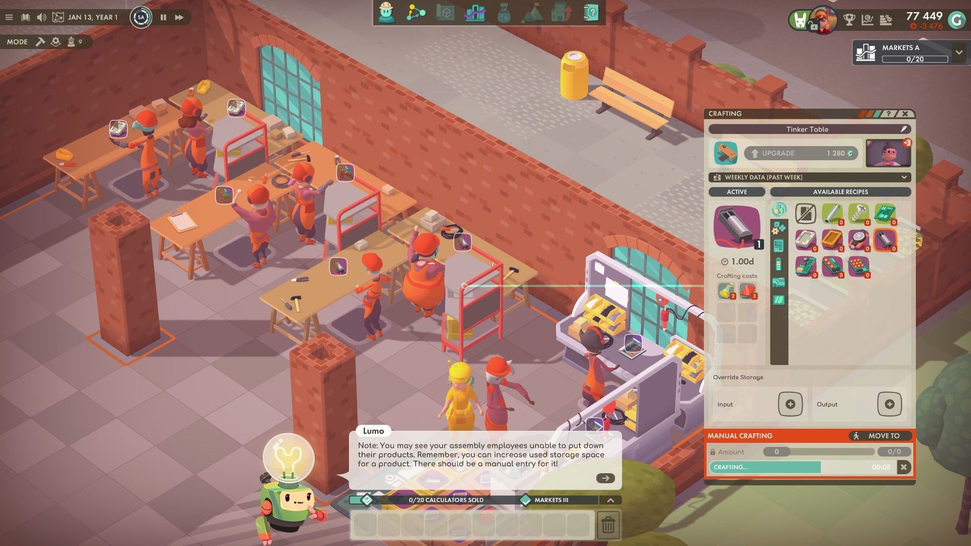 Good Company is a detailed simulation game where you create and manage a tech company, starting from a small business and growing it into a highly efficient, automated factory. You’ll design production lines, manage your workforce, and streamline operations to build and sell tech products in a constantly changing market. The game combines the freedom of a sandbox with the goals of a traditional business tycoon game, letting you expand your facilities, improve your systems, and compete to become a leader in the industry.