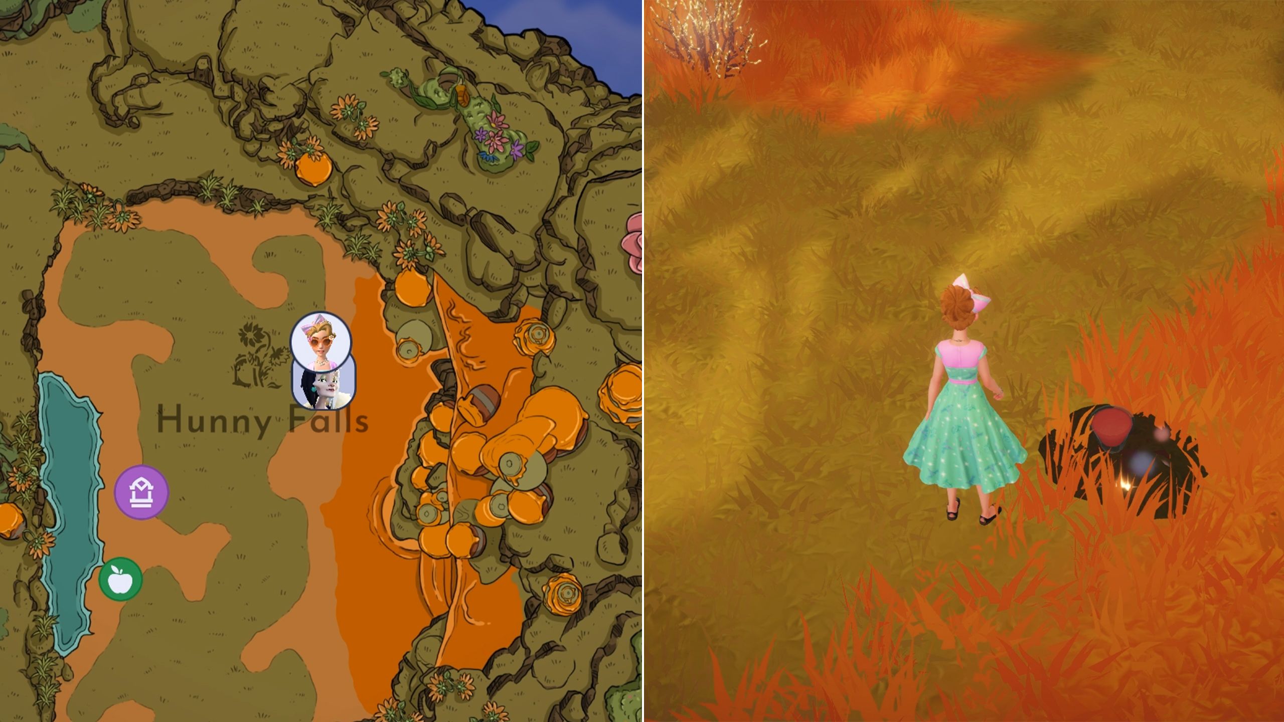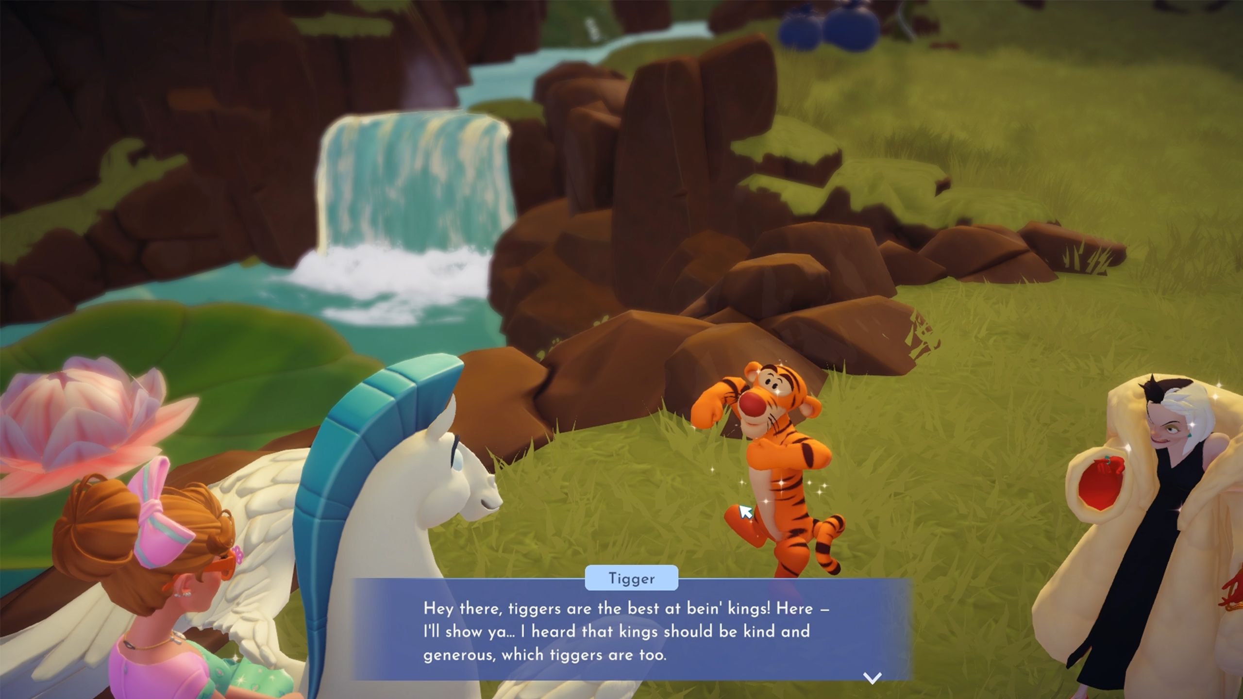 To discover Cruella’s style, go to Hunny Falls and look in the upper right corner, close to the honey waterfall. You’ll find a red potion bottle buried – dig it up with a shovel, then talk to Cruella. Tigger is relieved to no longer be considered a fashion expert, but a new issue has come up.