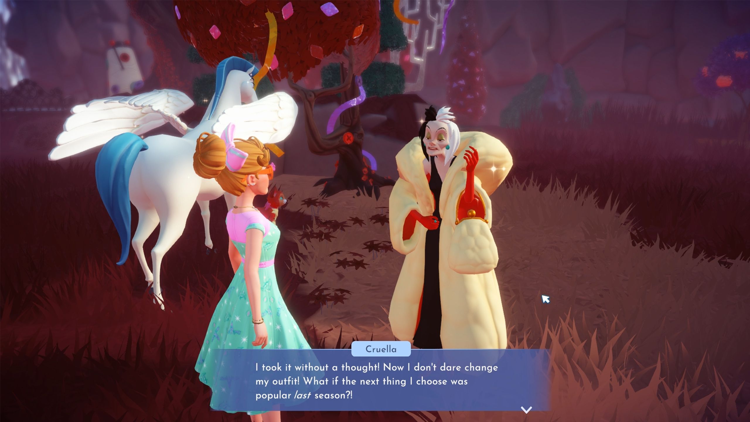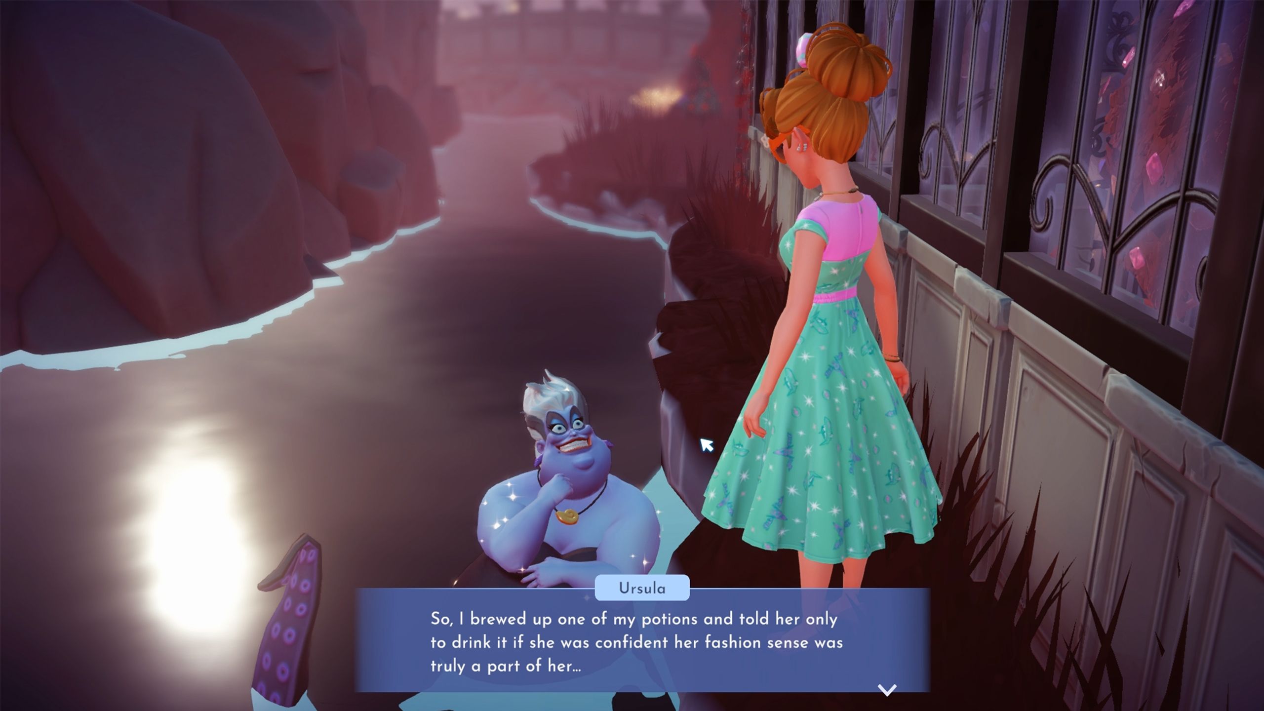 Once you’ve changed clothes, talk to Cruella. She’ll explain that she lost her ability to create stylish outfits after a conversation with Ursula.