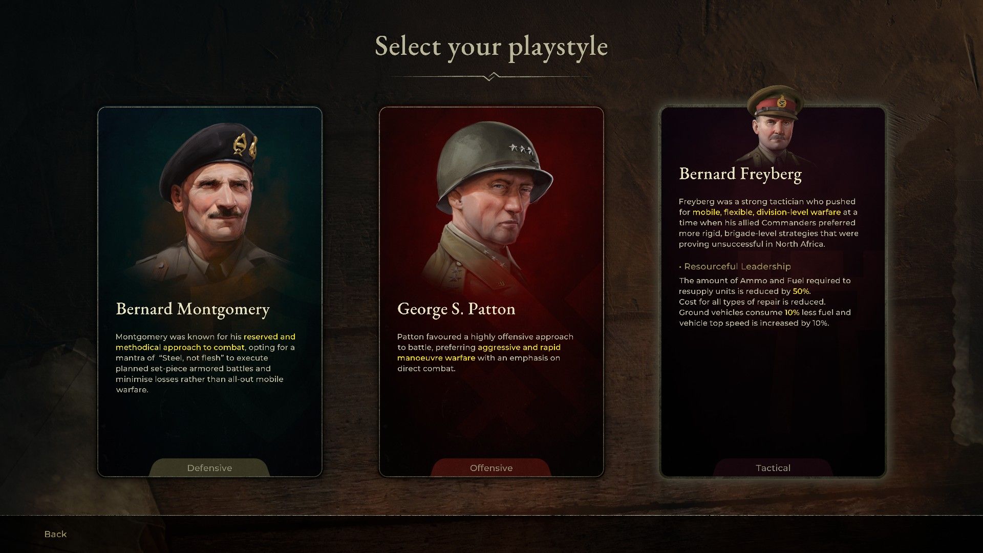 Which leader you choose depends on the game’s faction, and this can create some amusing situations, especially when playing as the US or Britain. I chose Bernard Freyberg because he’s the most historically accurate choice for the Battle of Crete. The game also offers Bernard Montgomery and, surprisingly, George S. Patton as options.