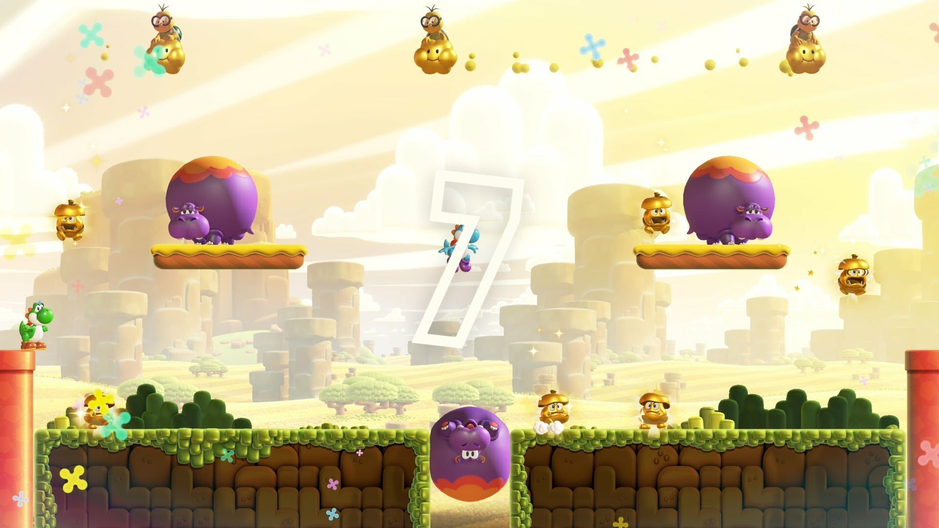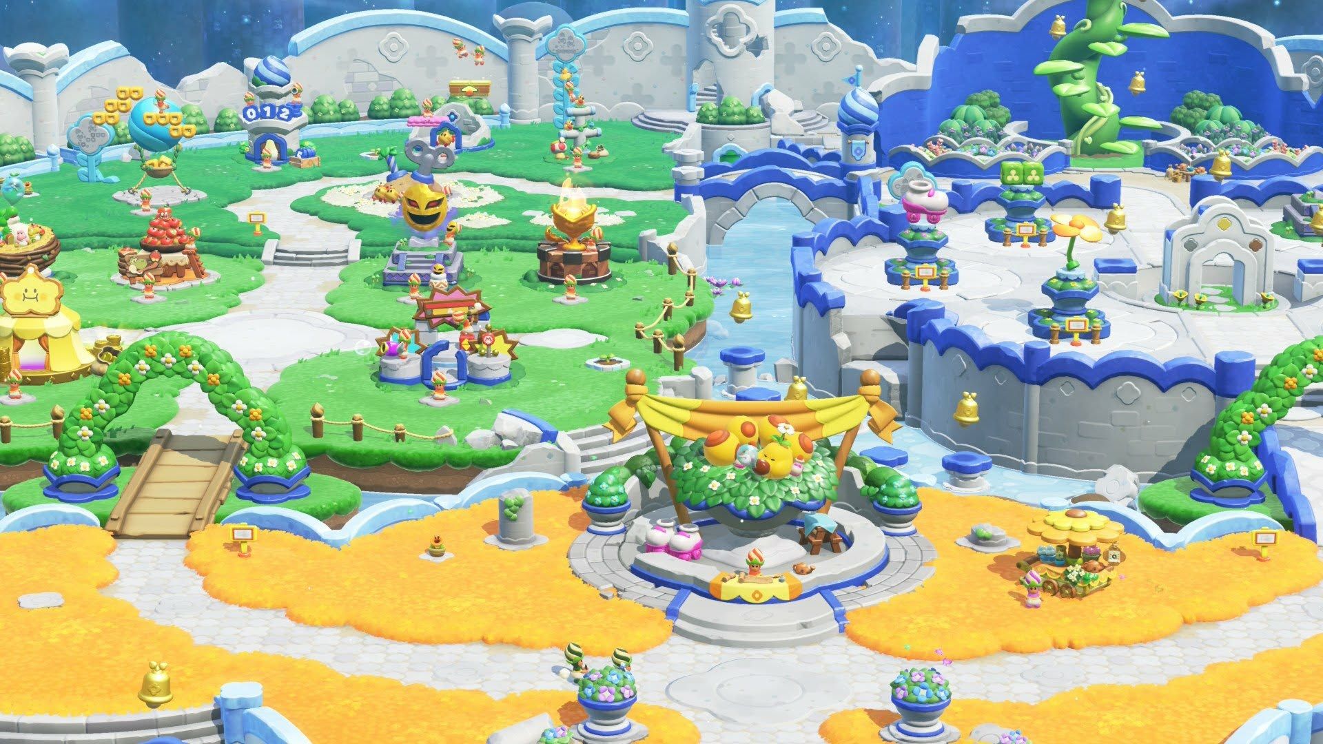 Bellabel Park is a lively area where players can earn water by completing challenges. This water is then used to unlock decorations and other items to customize the park. Like collecting standees in Super Mario Bros. Wonder, getting these items involves a bit of luck – you won’t know what you’ll receive until you try. The park offers both team-based and competitive challenges to earn more water, though many reuse levels from the main game with new additions. For example, one challenge asks players to collect coins in a section of a level, while another is a Yoshi-themed competition to see who can eat the most.