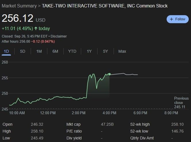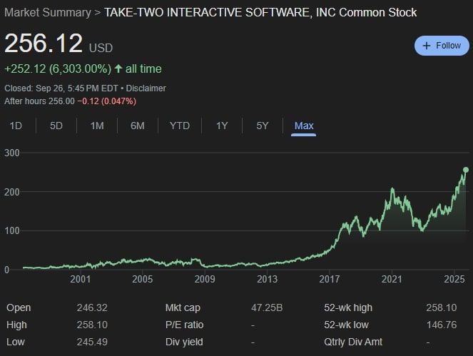 Take-Two Interactive, the company behind popular game franchises like *Red Dead Redemption*, *Grand Theft Auto*, *Borderlands*, and *NBA 2K*, reached a record high stock price of $258.10 on September 26th. This marks a new achievement for the gaming giant, which has become one of the biggest video game companies globally and continues to build on its recent successes.