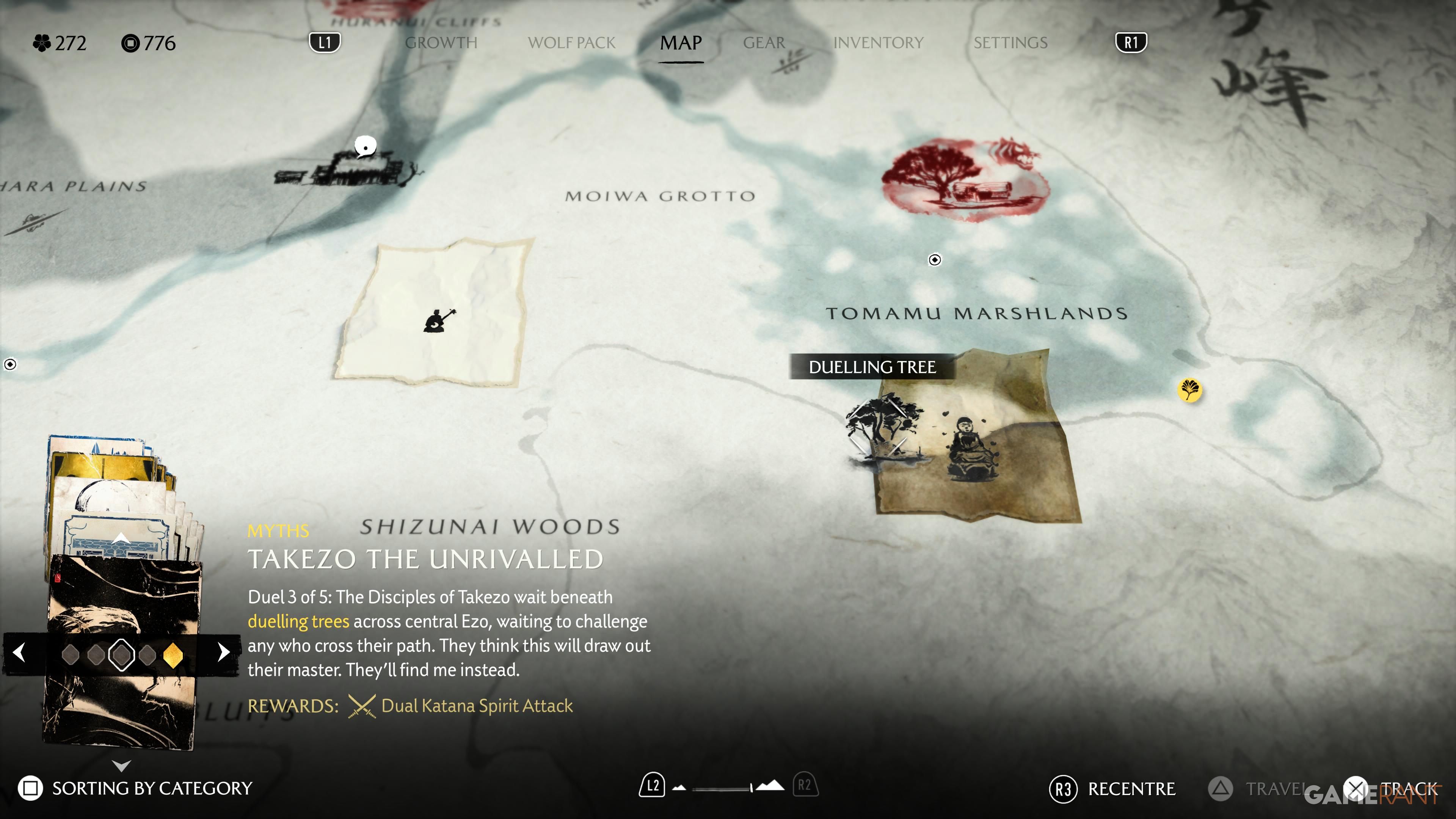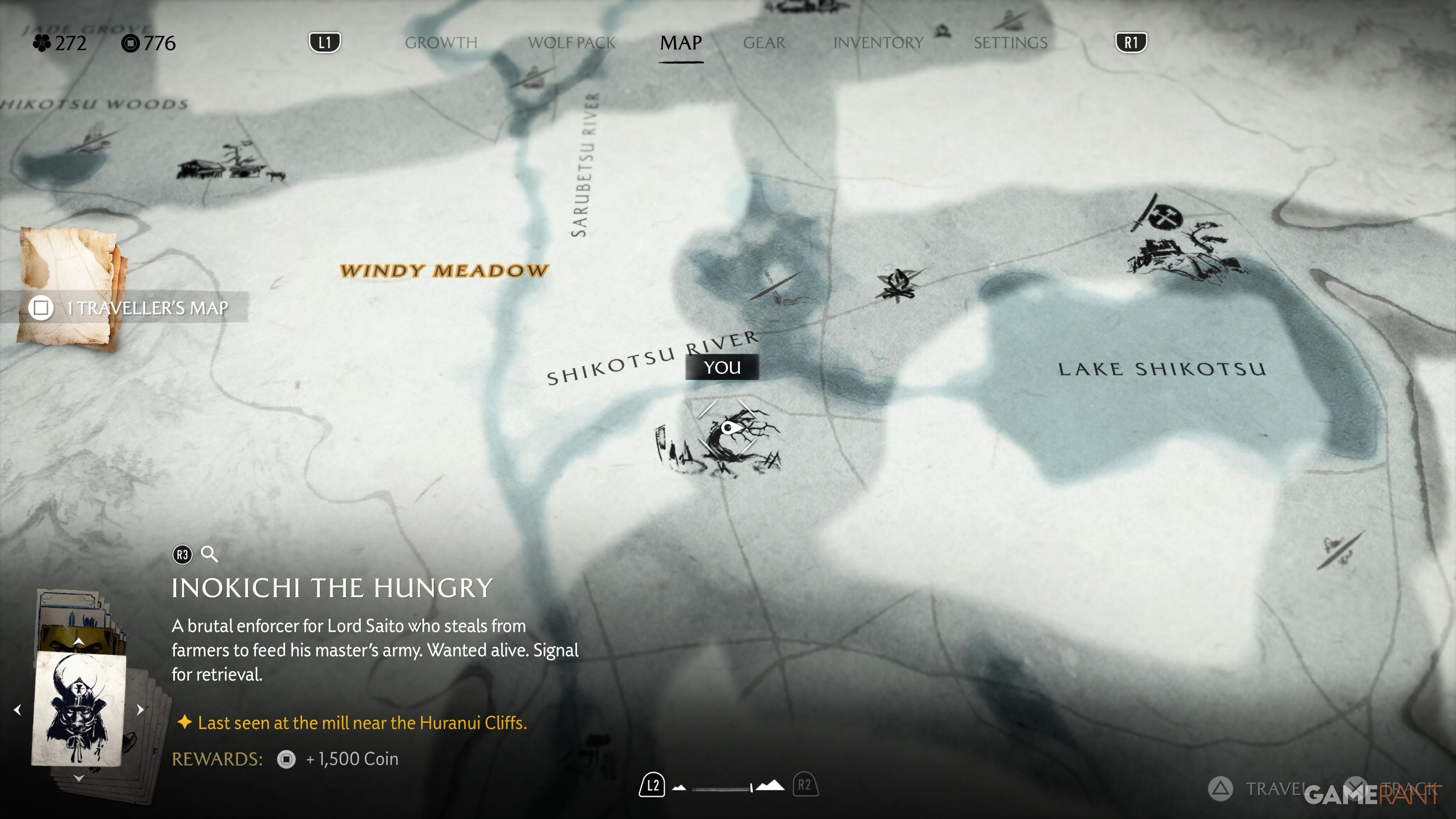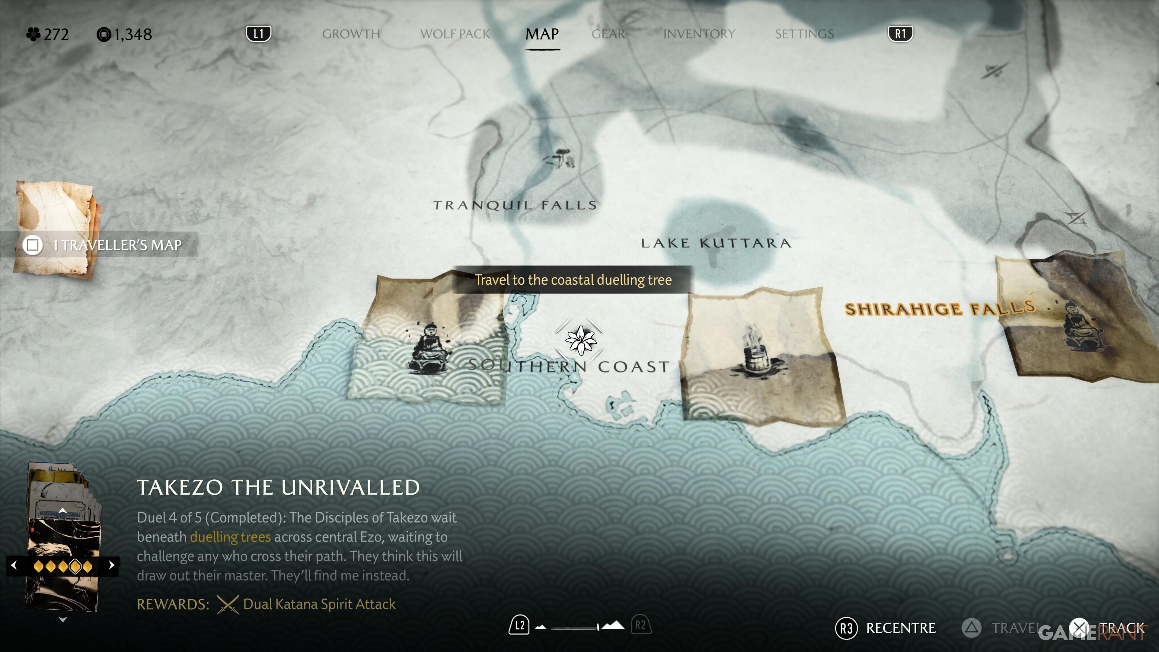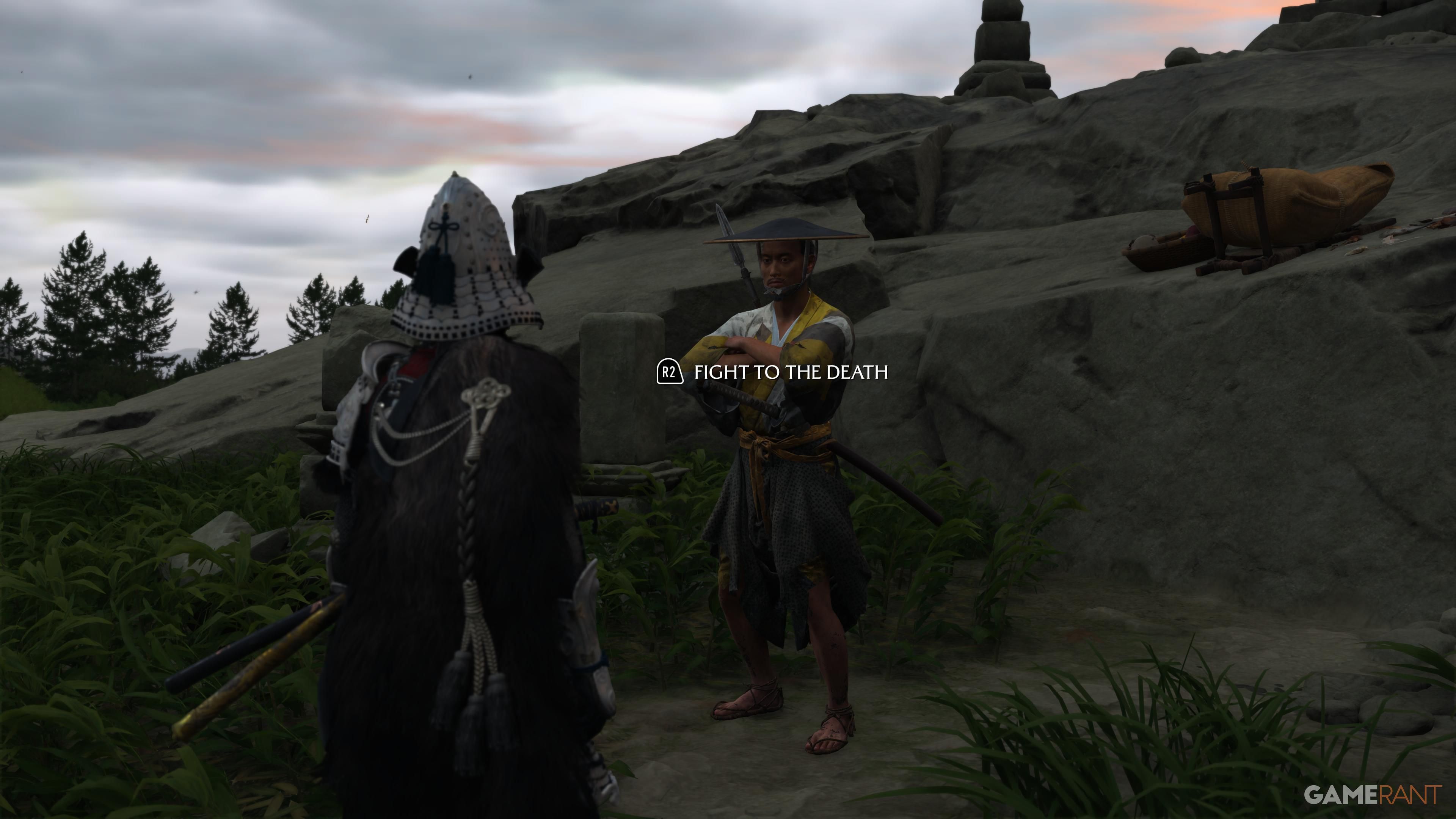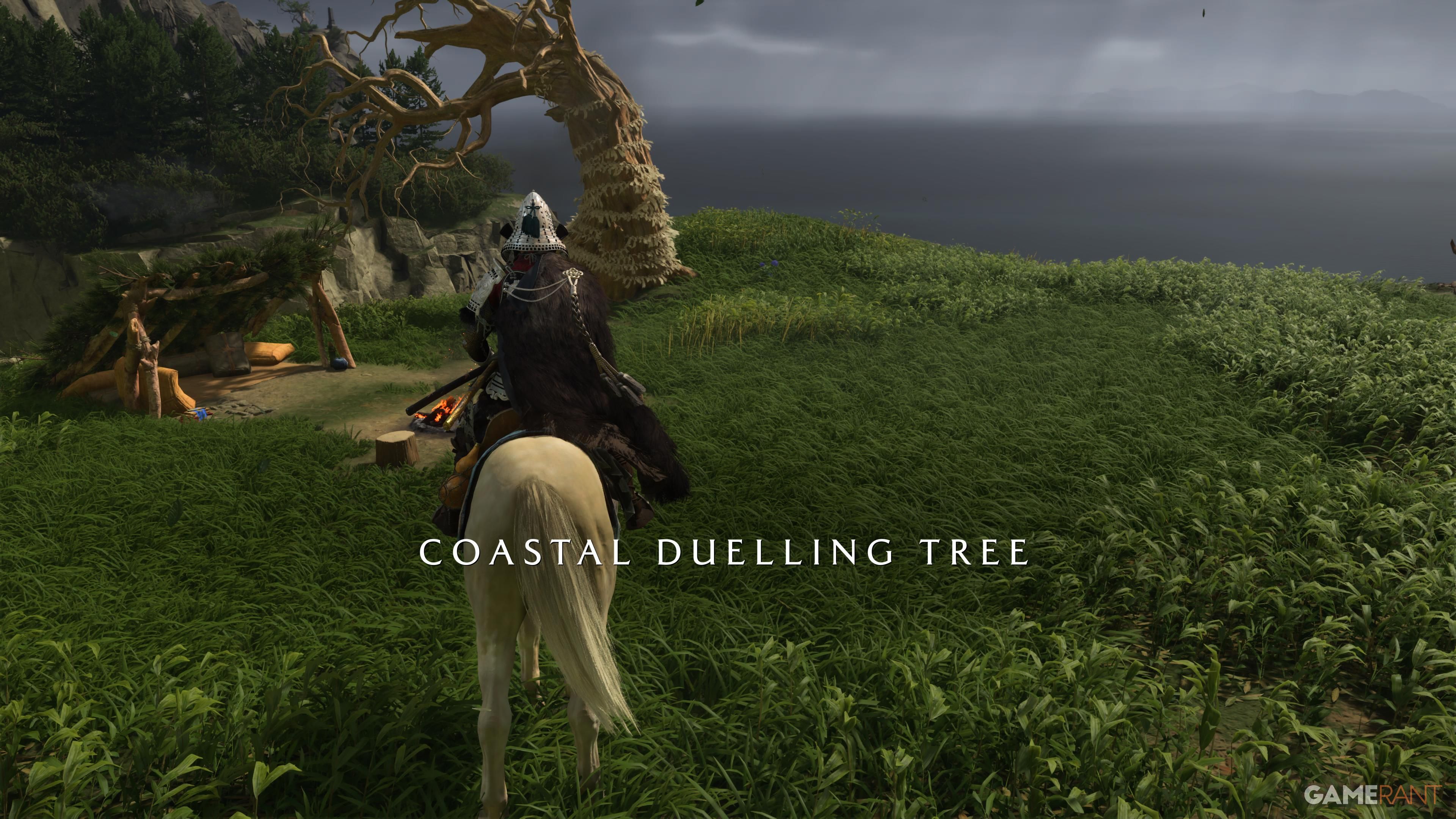 Once you’ve defeated all the Ronins at the Dueling Trees, your next goal is on the Southern Coast of the Yotei Grasslands. Travel there by horse, and you’ll find a campsite. Takezo will meet you here, and when he arrives, follow him down to the beach. You’ll engage in a Spar with him, and if you win, you’ll learn the Dual Katanas Spirit Attack, completing the quest.