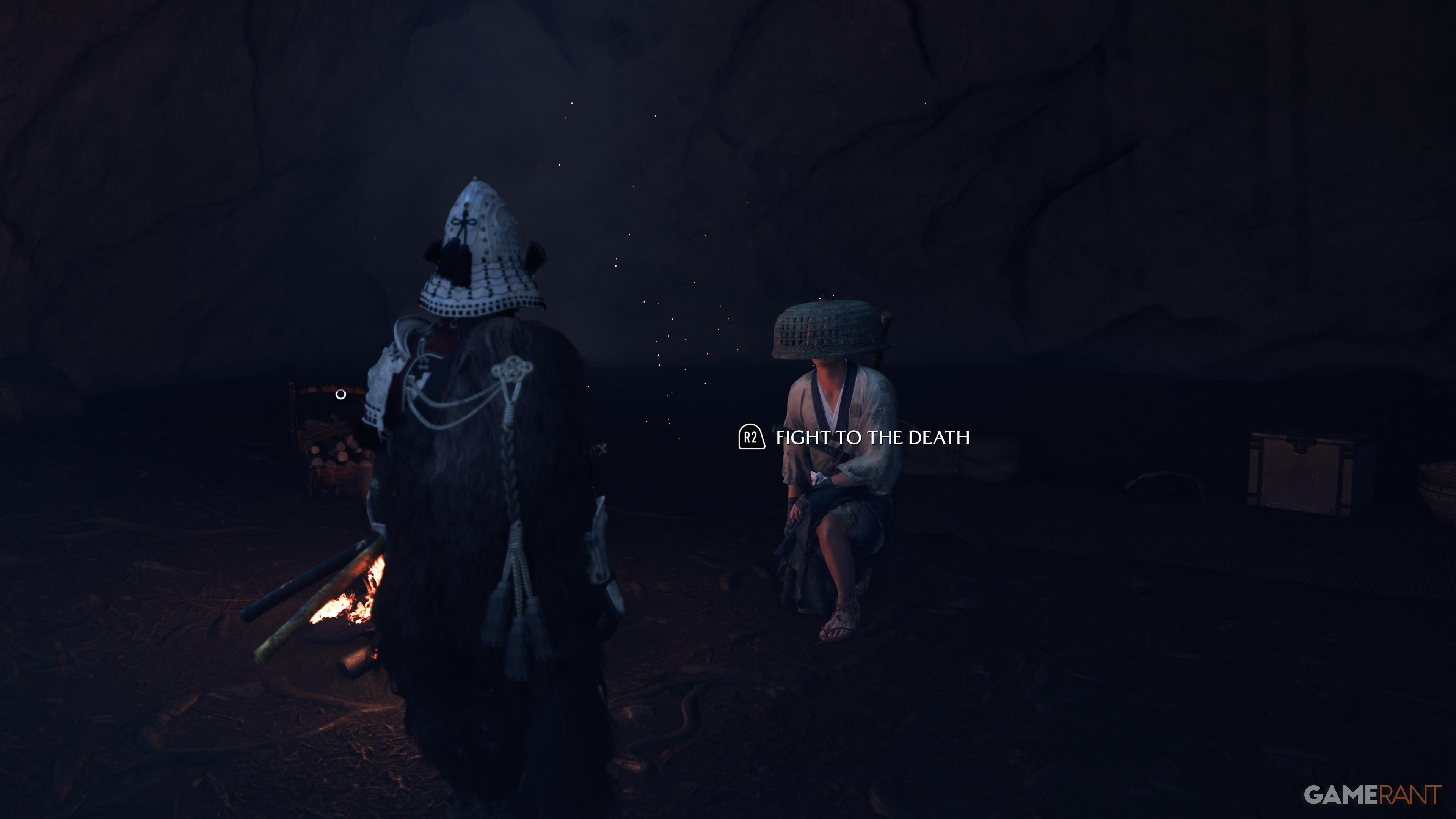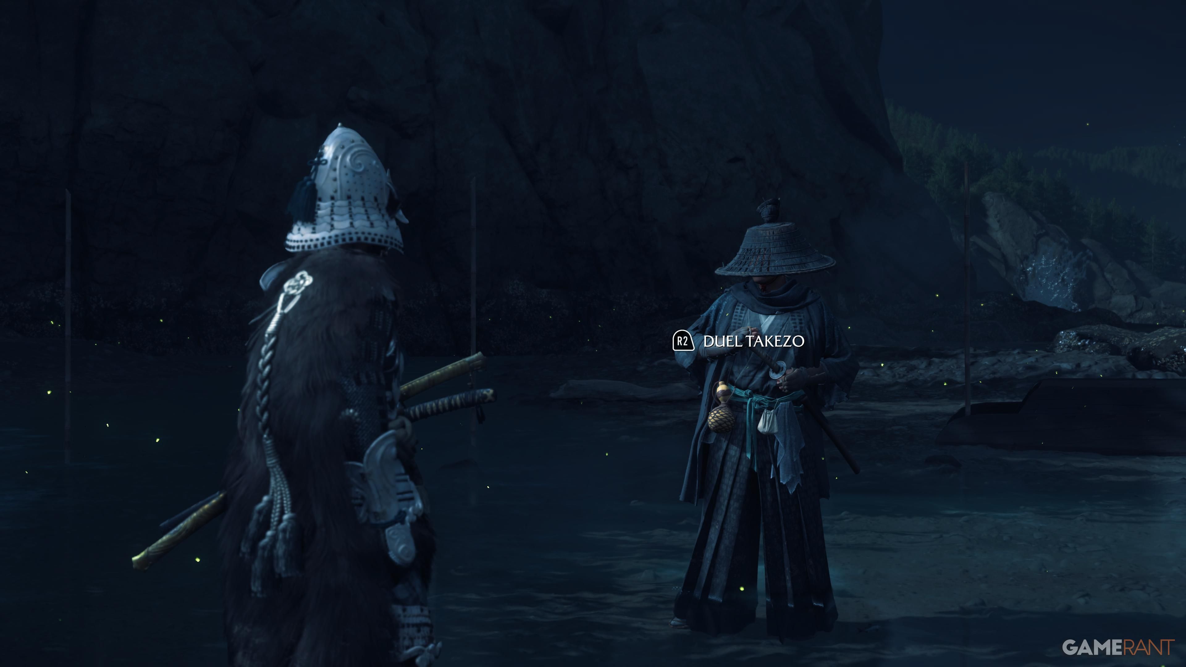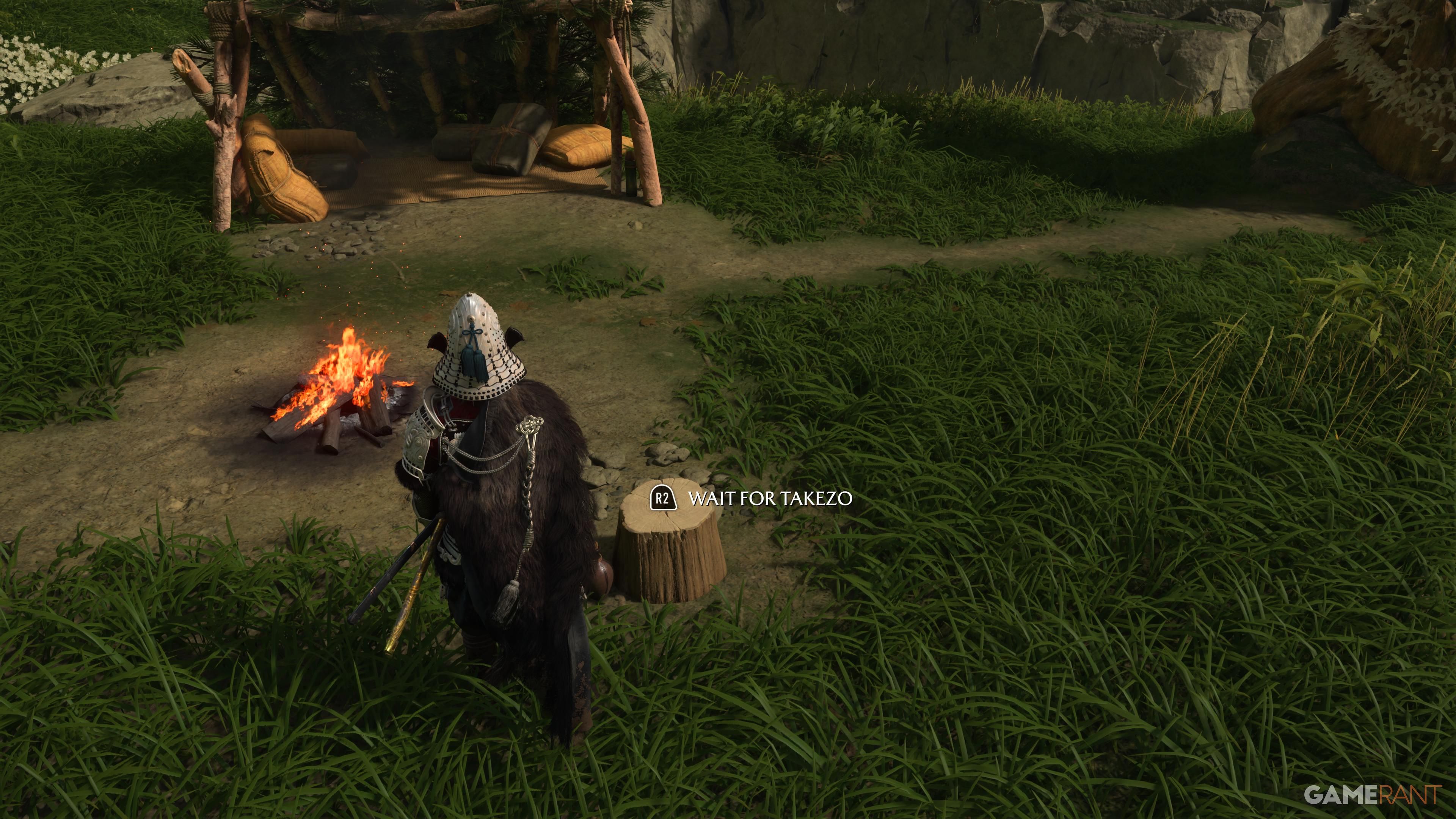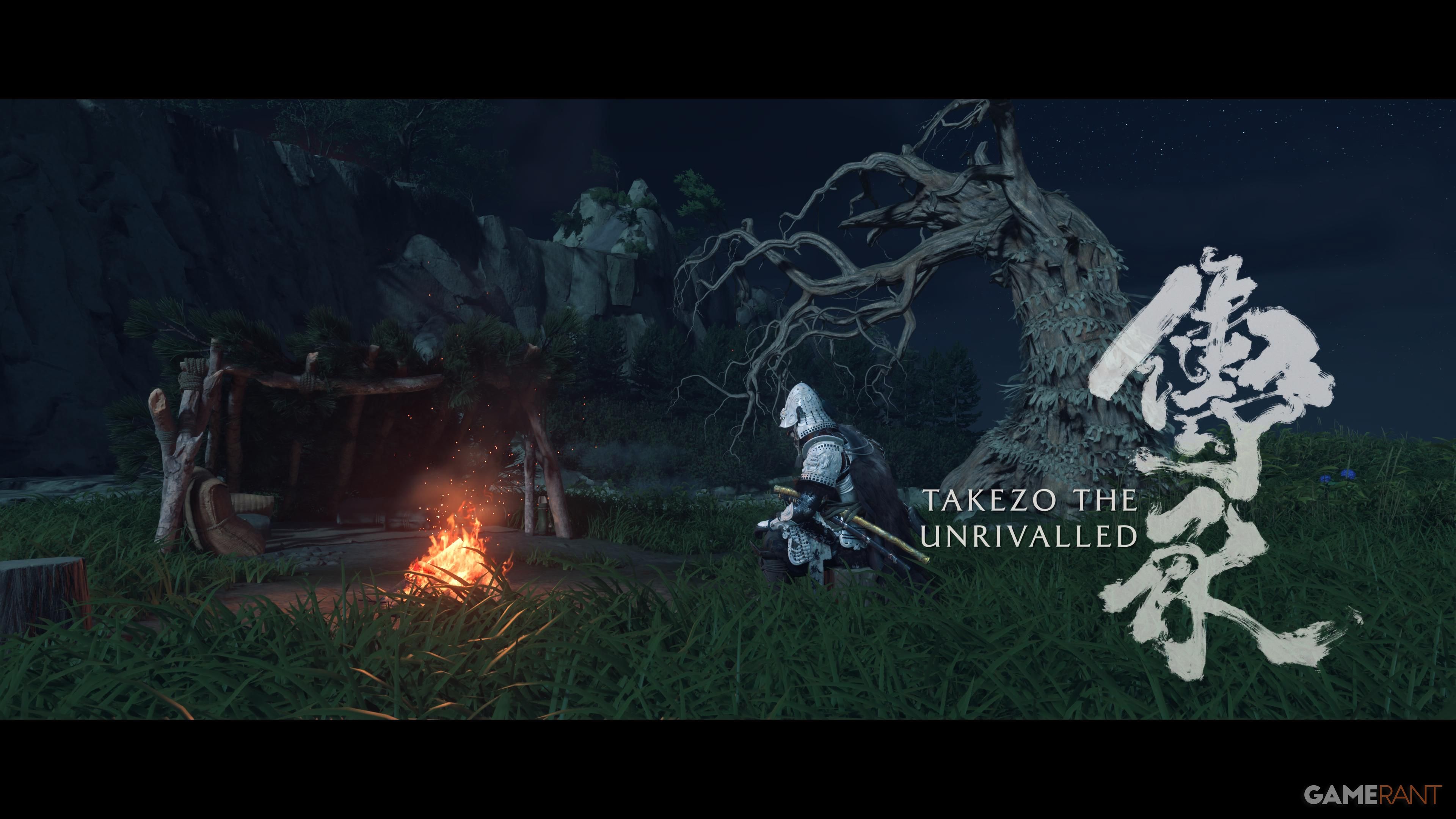 When you get to the top, go to the campsite and make sure you have all of the Takezo Charms you’ve collected. Approach the campfire, and Takezo will show up. After a brief chat, you’ll have the option to follow him and start a battle. This fight can be really challenging, particularly on higher difficulty settings. He’ll use a variety of attacks that you’ll need to dodge or parry, so quick reflexes are essential.