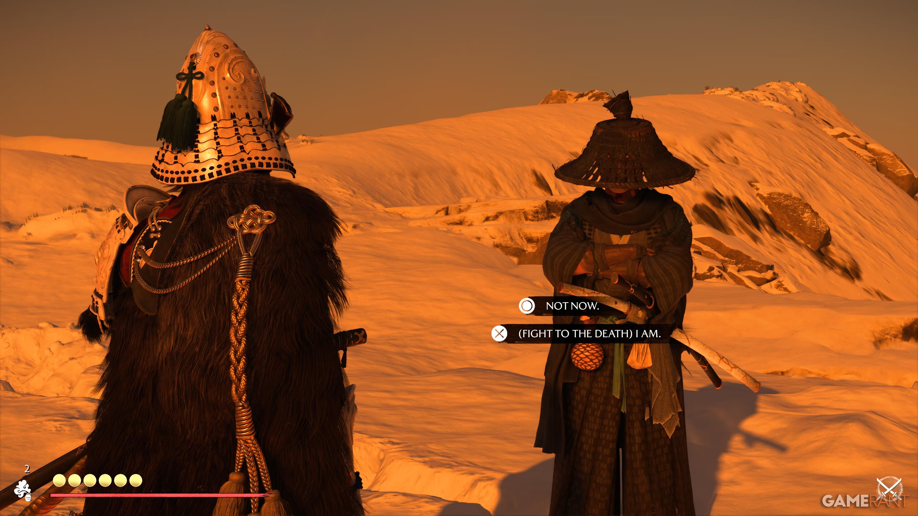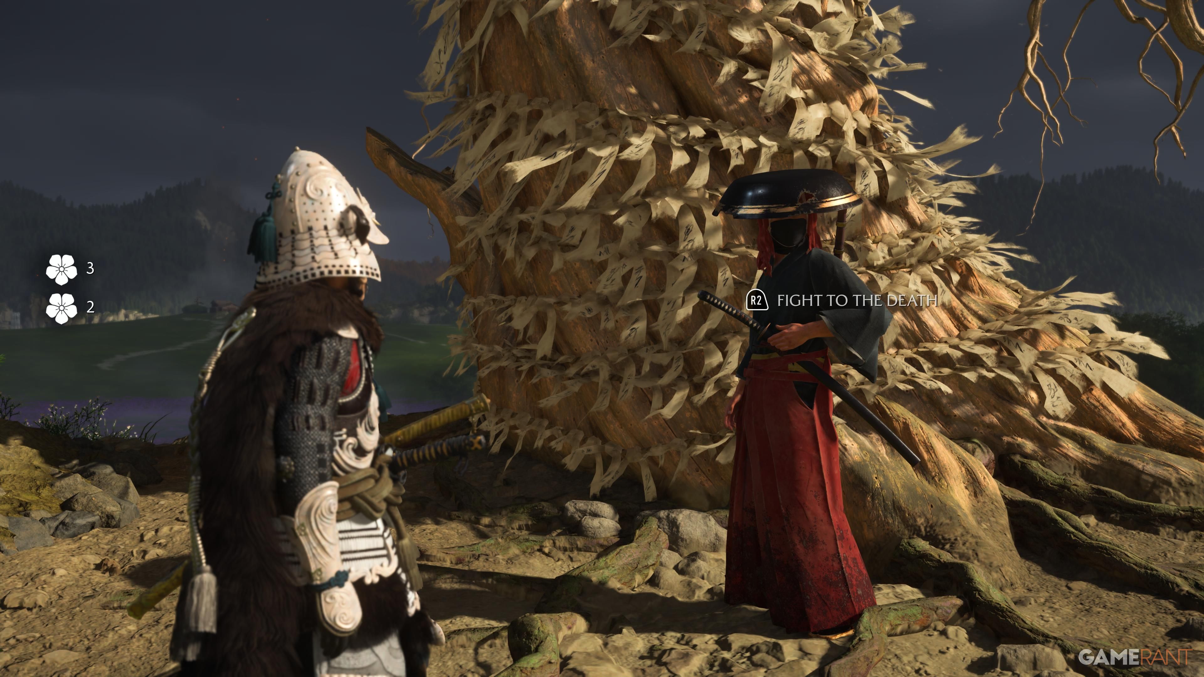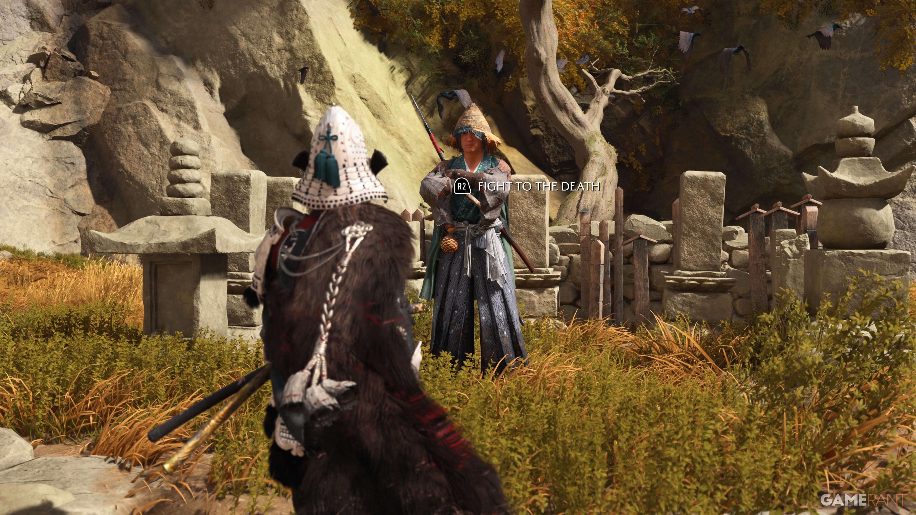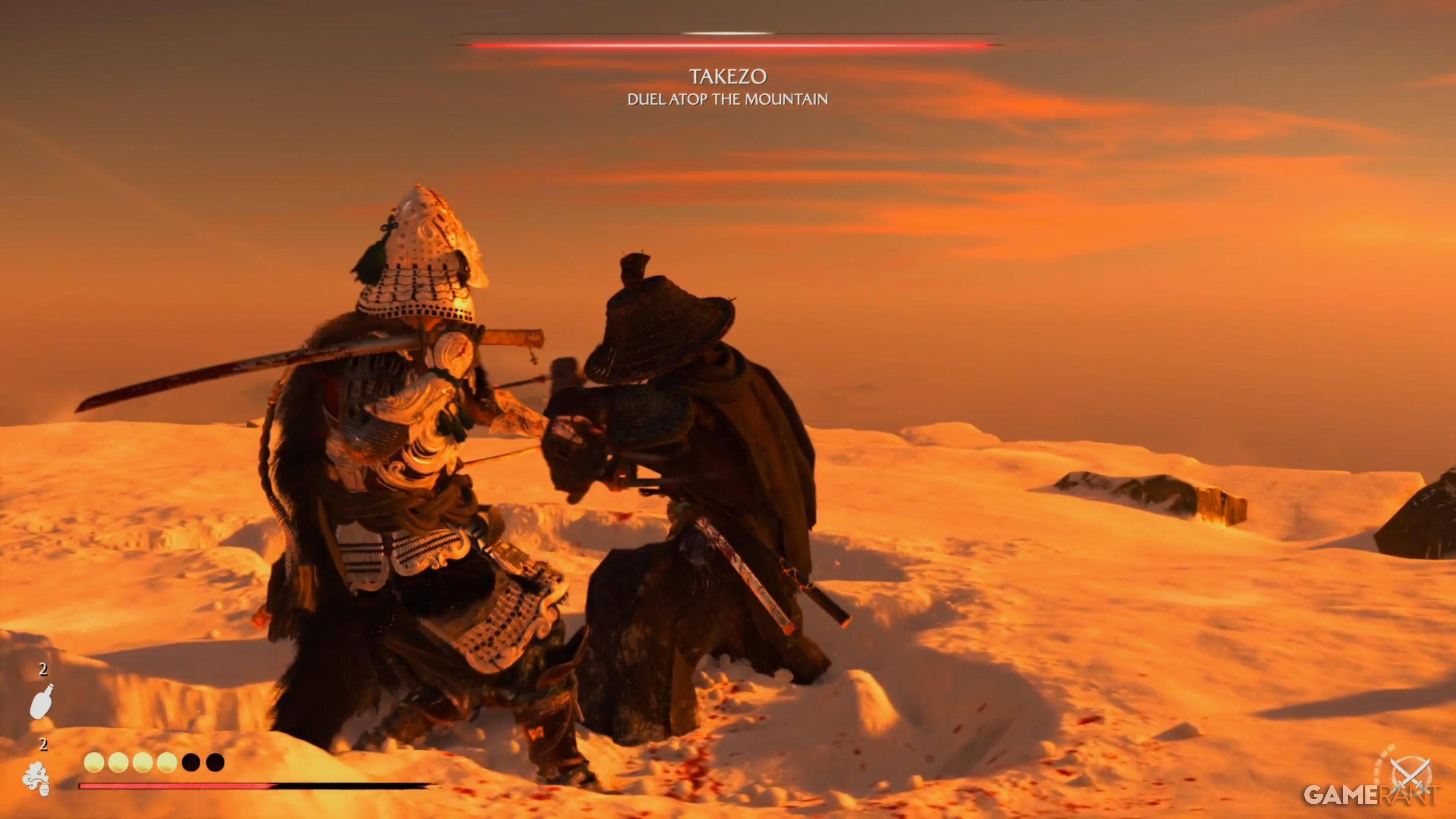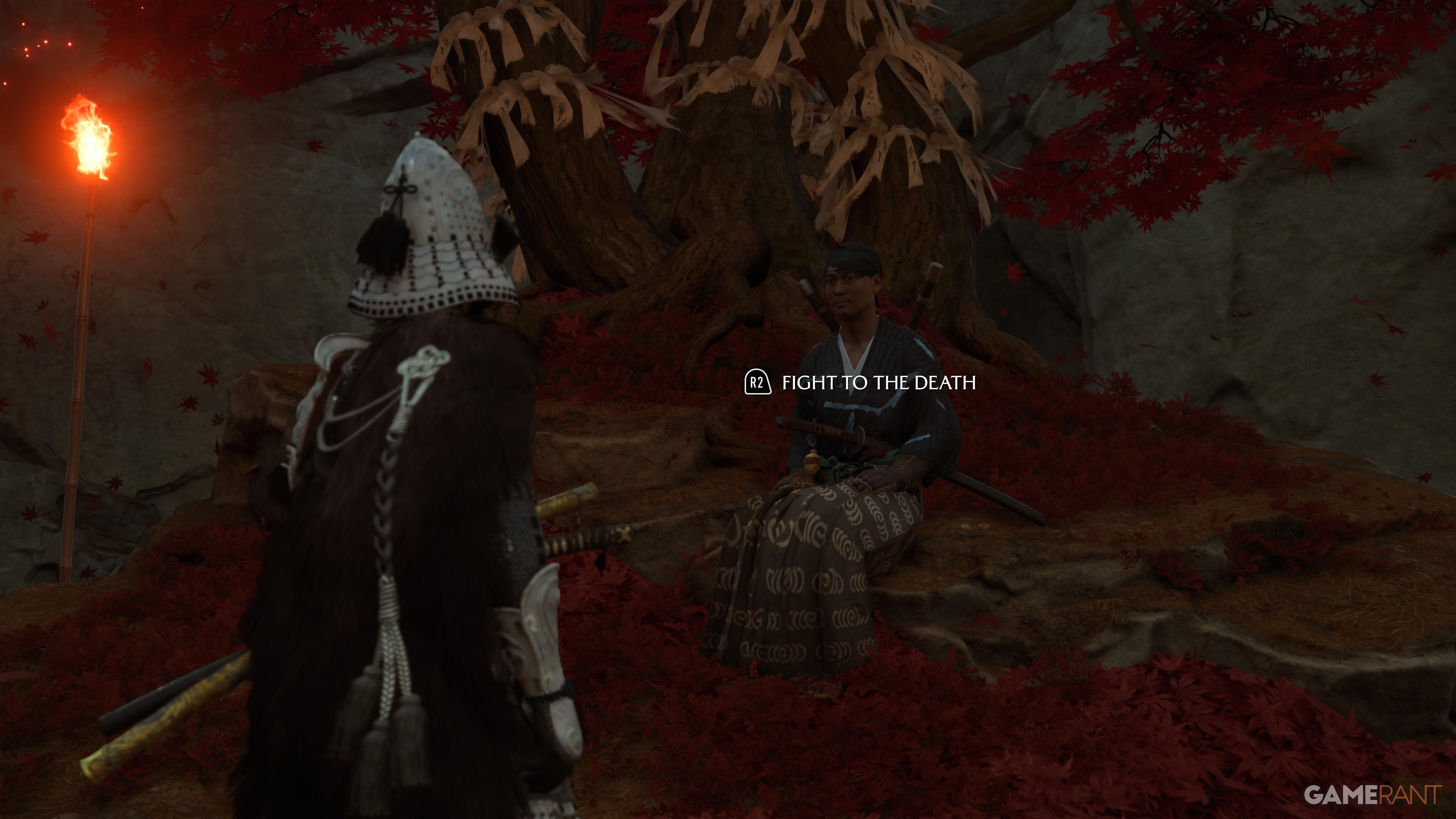 When you get to the top, go to the campsite and make sure you have all of the Takezo Charms you’ve collected. Approach the campfire, and Takezo will show up. After a brief chat, you’ll have the option to follow him and start a battle. This fight can be really challenging, particularly on higher difficulty settings. He’ll use a variety of attacks that you’ll need to dodge or parry, so quick reflexes are essential.