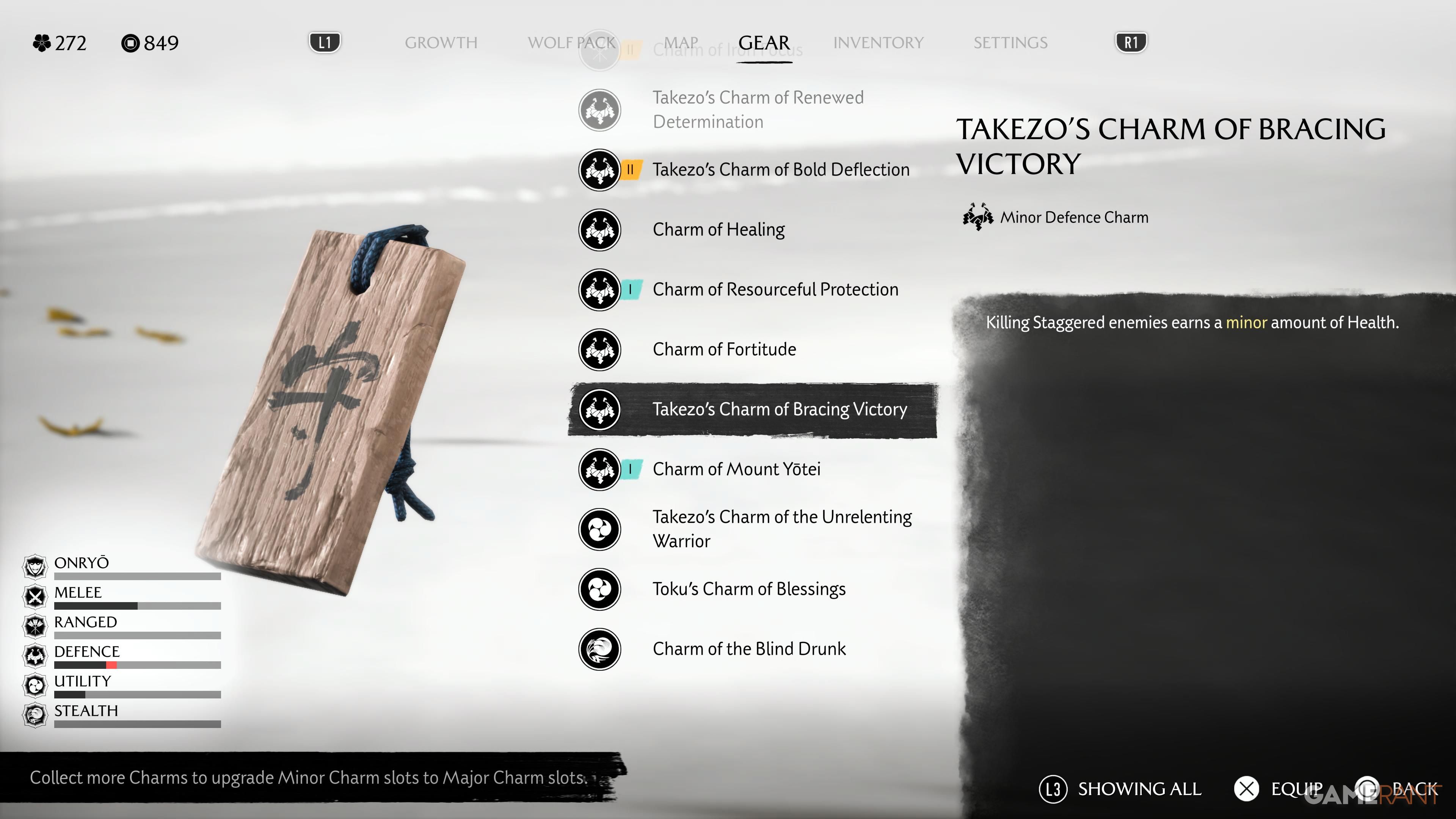- Takezo’s Charm of Bracing Victory: Killing Staggered enemies earns a minor amount of Health.