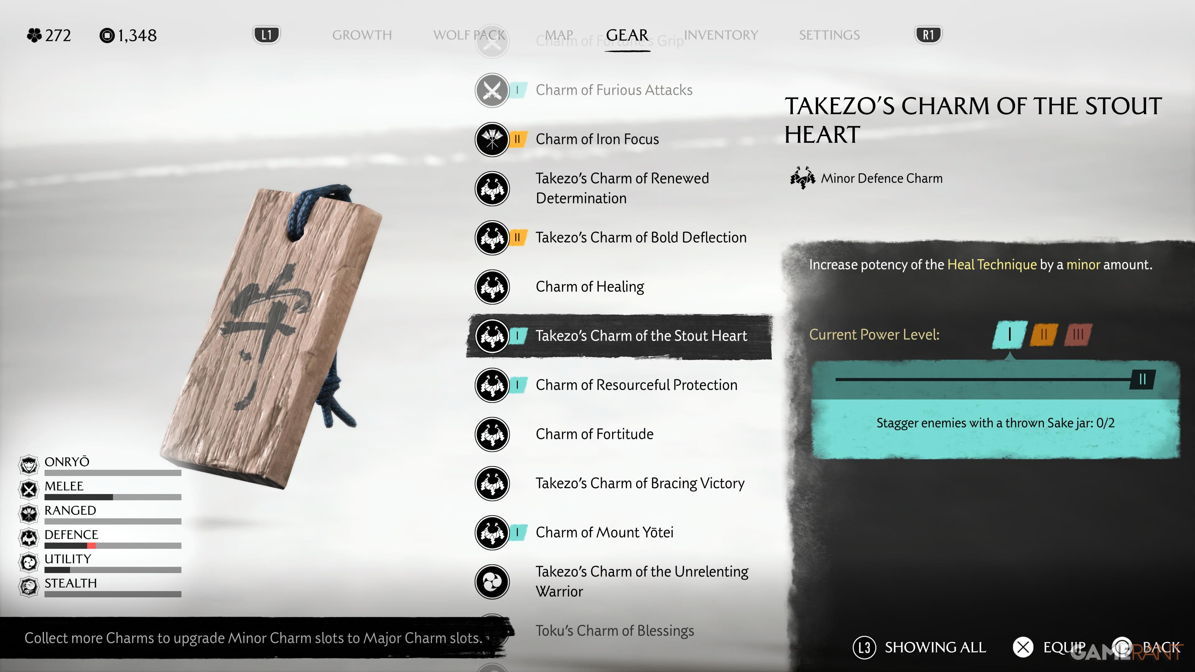 - Takezo’s Charm of the Stout Heart: Increases potency of the Heal Technique by a minor amount.