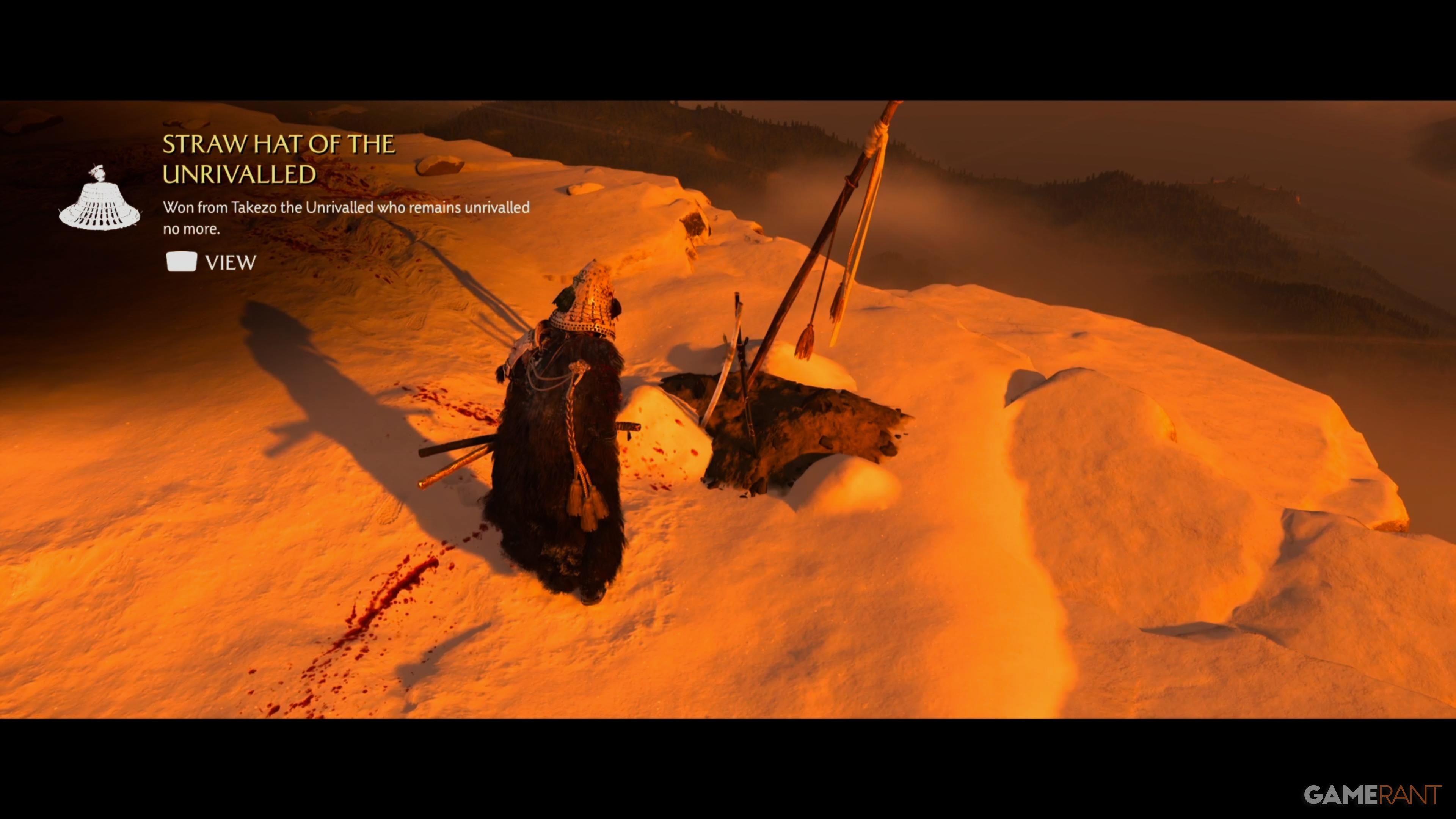 After you win against Takezo, you’ll receive the Straw Hat of the Unrivalled and the Gilded Night & Gilded Dawn (Weapon Kit). You’ll also unlock the Unrivaled trophy.