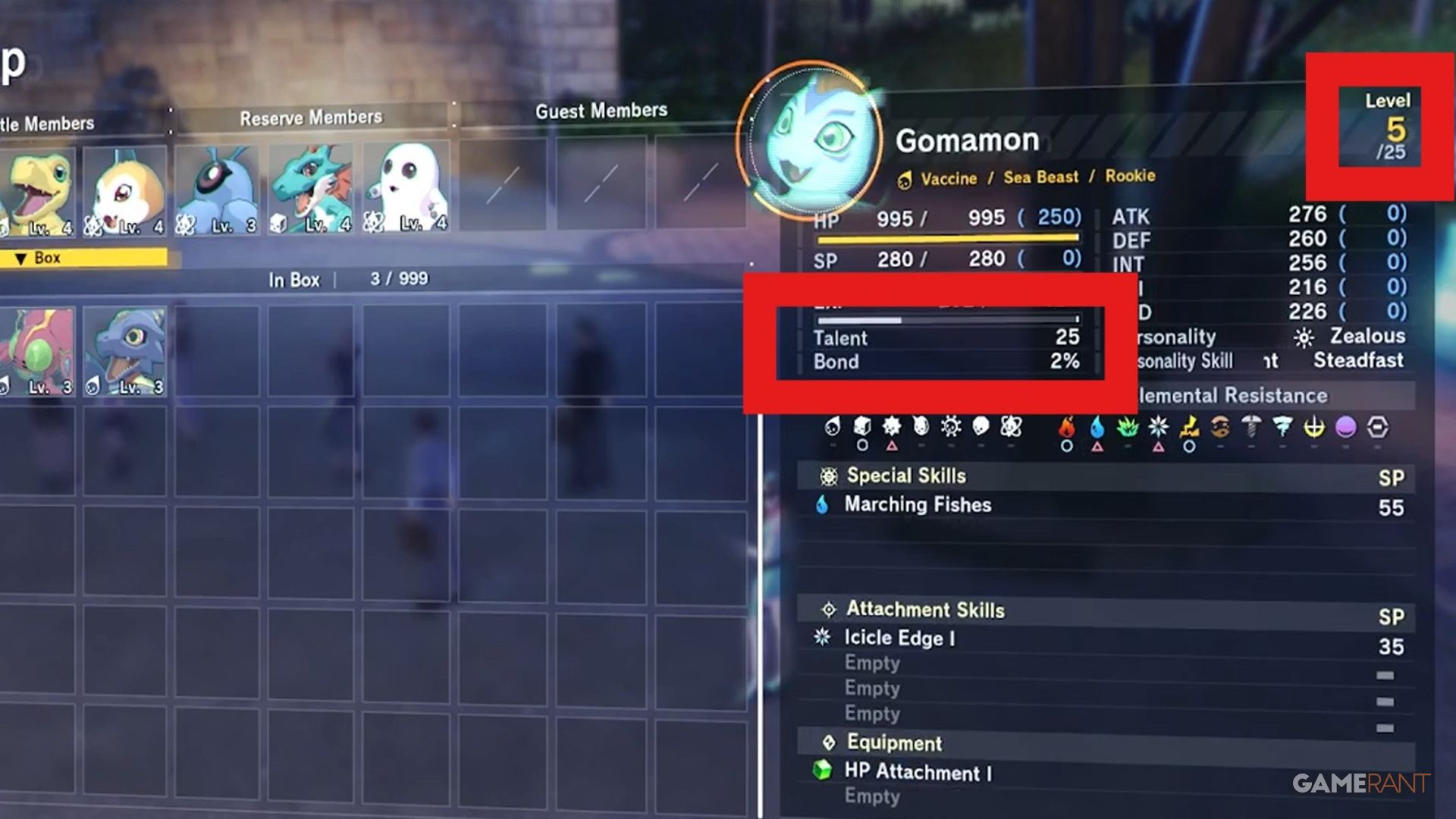 You can find your Digimon’s current level in the top right corner of its profile, displayed over its maximum possible level. Below the Digimon’s picture, you’ll see its Talent level. It’s important to know that these two levels are fundamentally the same. Talent actually represents a Digimon’s level cap and can be raised in several ways.