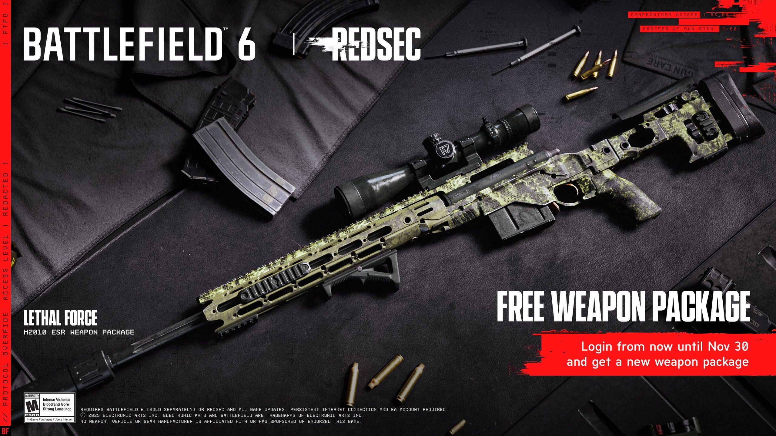 Alongside the free-to-play event, Battlefield 6 is giving away a special cosmetic item for a limited time. If you log in now, you’ll automatically receive the Lethal Force skin for the M2010 ESR Sniper Rifle in your inbox, which you can find in the main menu. This offer lasts until November 30th. You can also get the Lethal Force skin through Battlefield RedSec and use it in both games.