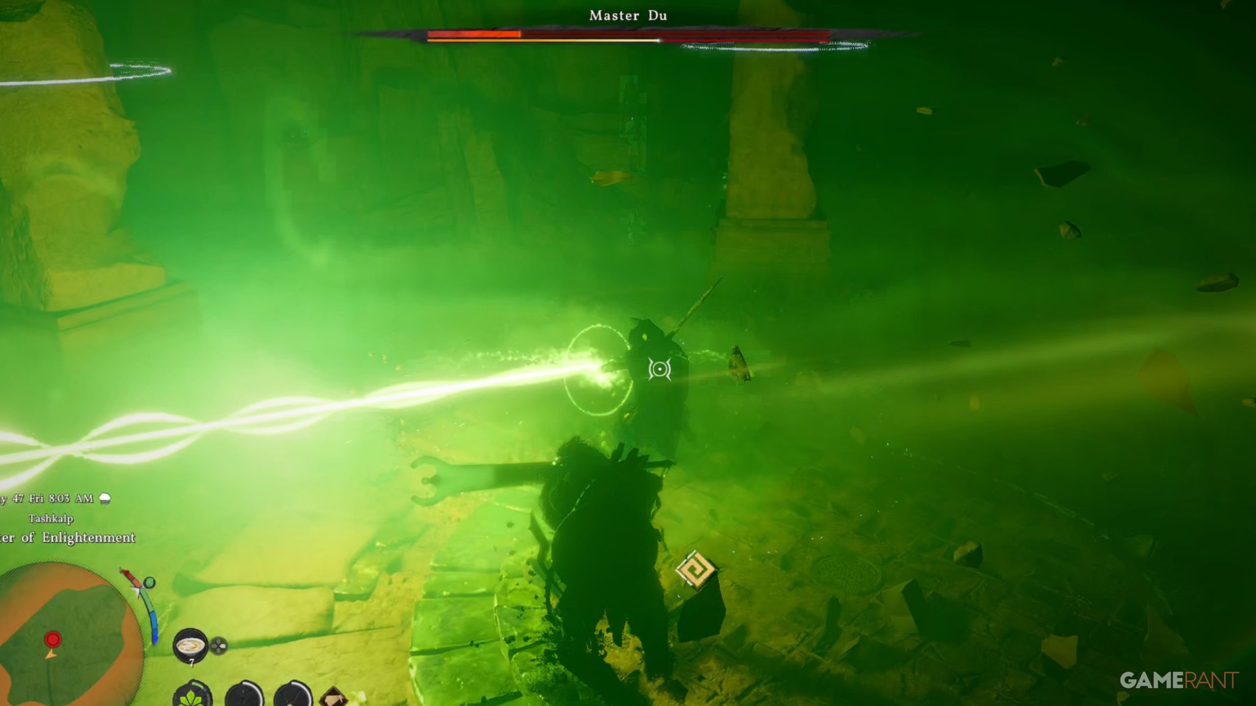 Master Du performs a powerful, unavoidable attack – a green laser beam that instantly defeats you, no matter how much health you have. To survive, you absolutely must dodge to the side as he begins to shoot, indicated by him raising his palm forward.