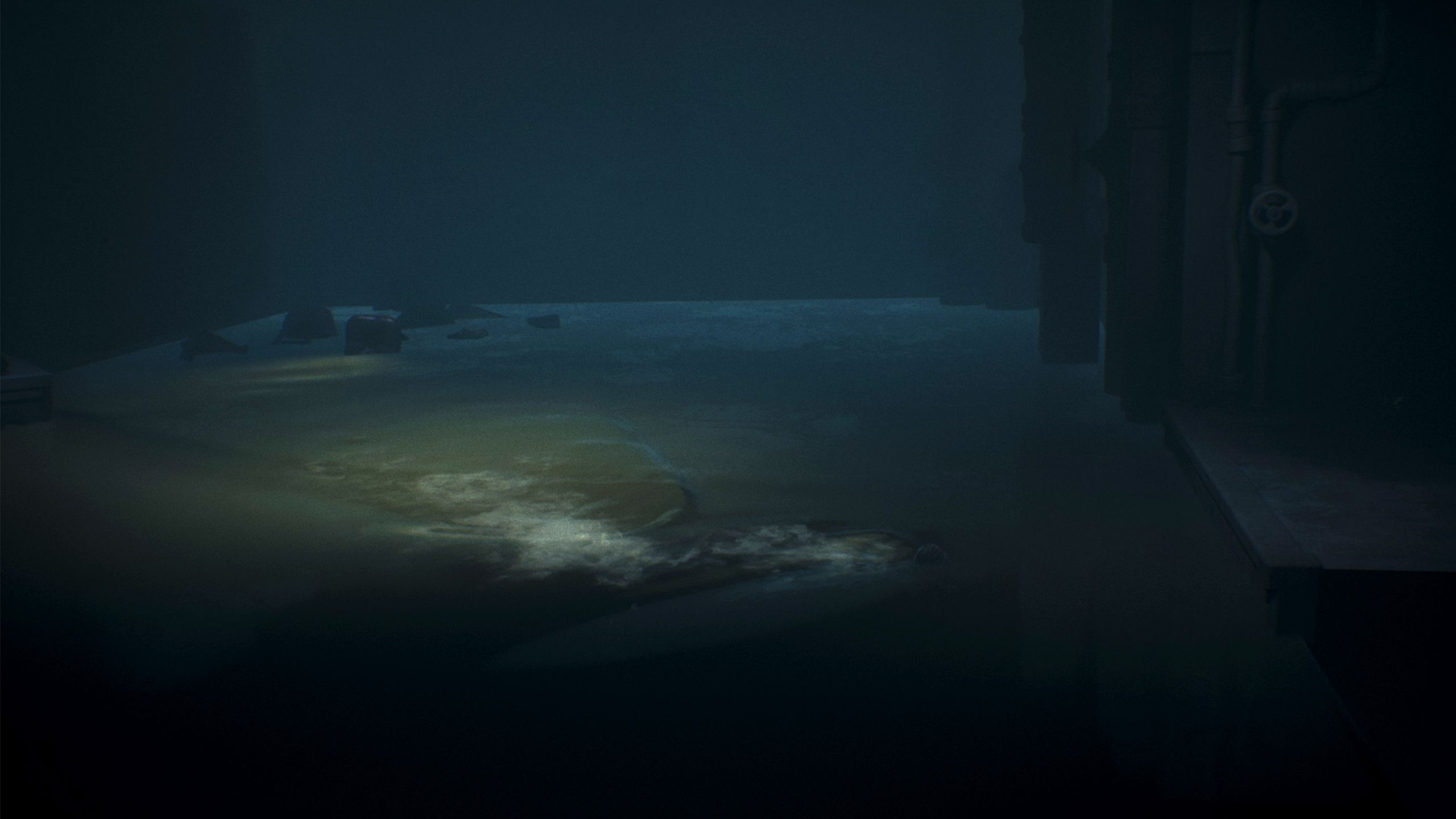 Swim across and pull out the wooden board. Continue swimming into a wider space, but be careful – something is hidden underwater and is following you.