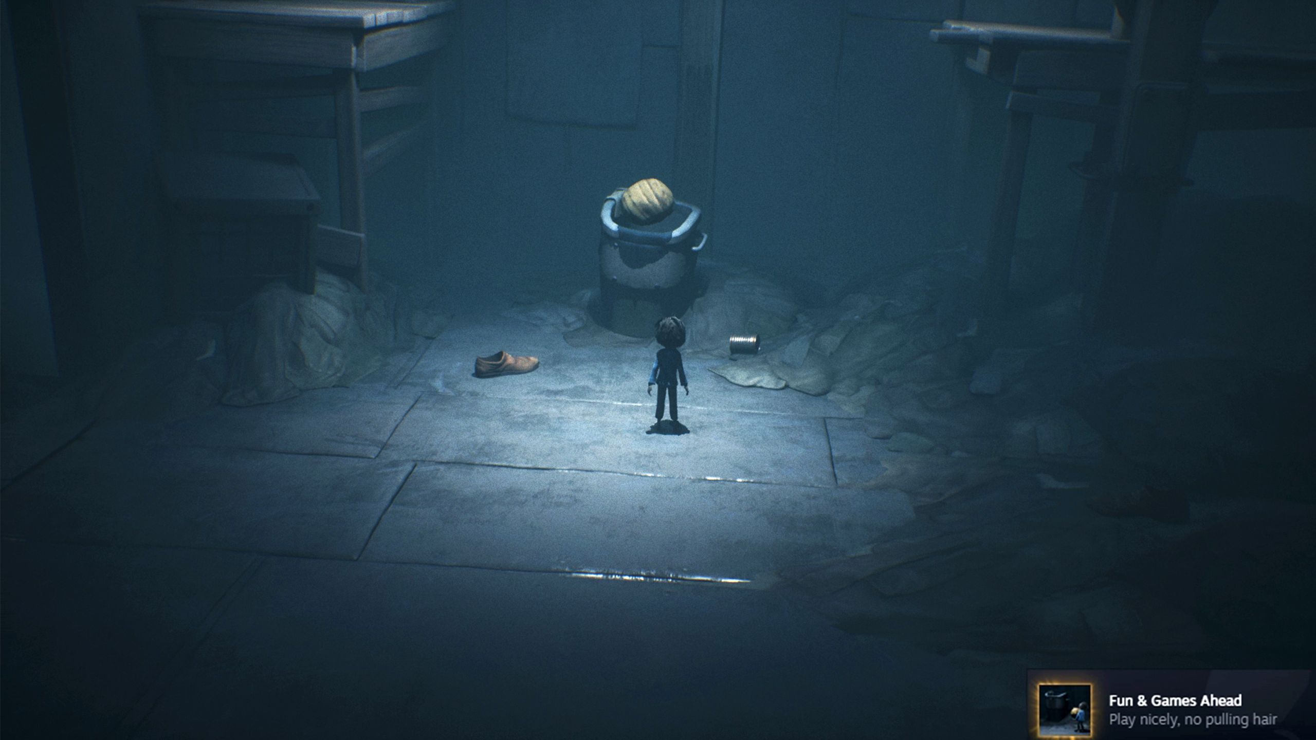 To earn the Fun & Games Ahead Trophy in Little Nightmares, pick up the large white object in the next room and toss it into the bucket.