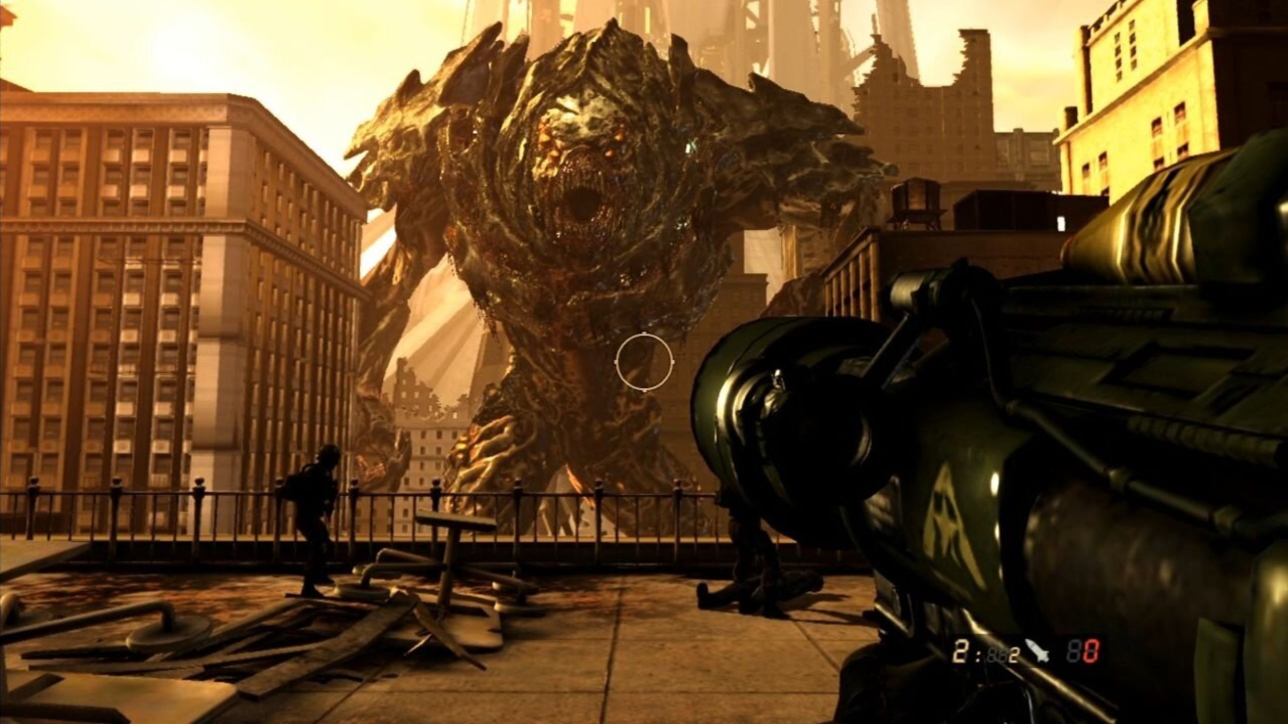 You’ll navigate a devastated landscape of wrecked trains, collapsed buildings, and flooded streets, constantly engaging in intense firefights under heavy enemy fire. The climax of it all is a massive battle against a colossal, building-sized creature called a Leviathan – a Chimera that you’ll have to defeat by destroying an entire building.