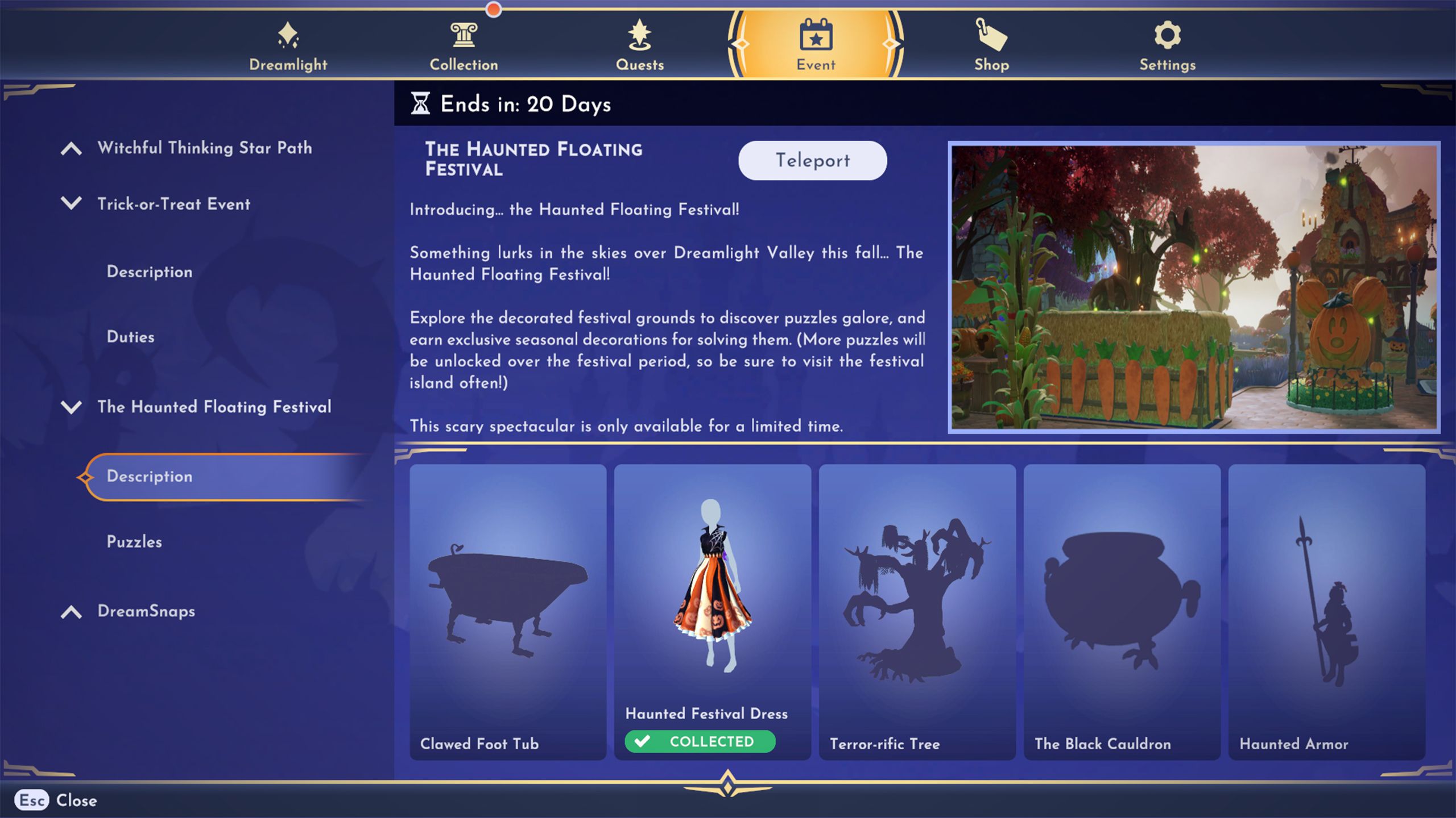 To reach the Haunted Floating Festival island, find Merlin in The Plaza – he’ll show you the teleport portal. You can also teleport directly from the event tab in the main menu. To finish the festival and get the rewards, you’ll need to solve all the puzzles. Three puzzles are available right away, and more will unlock as you progress.