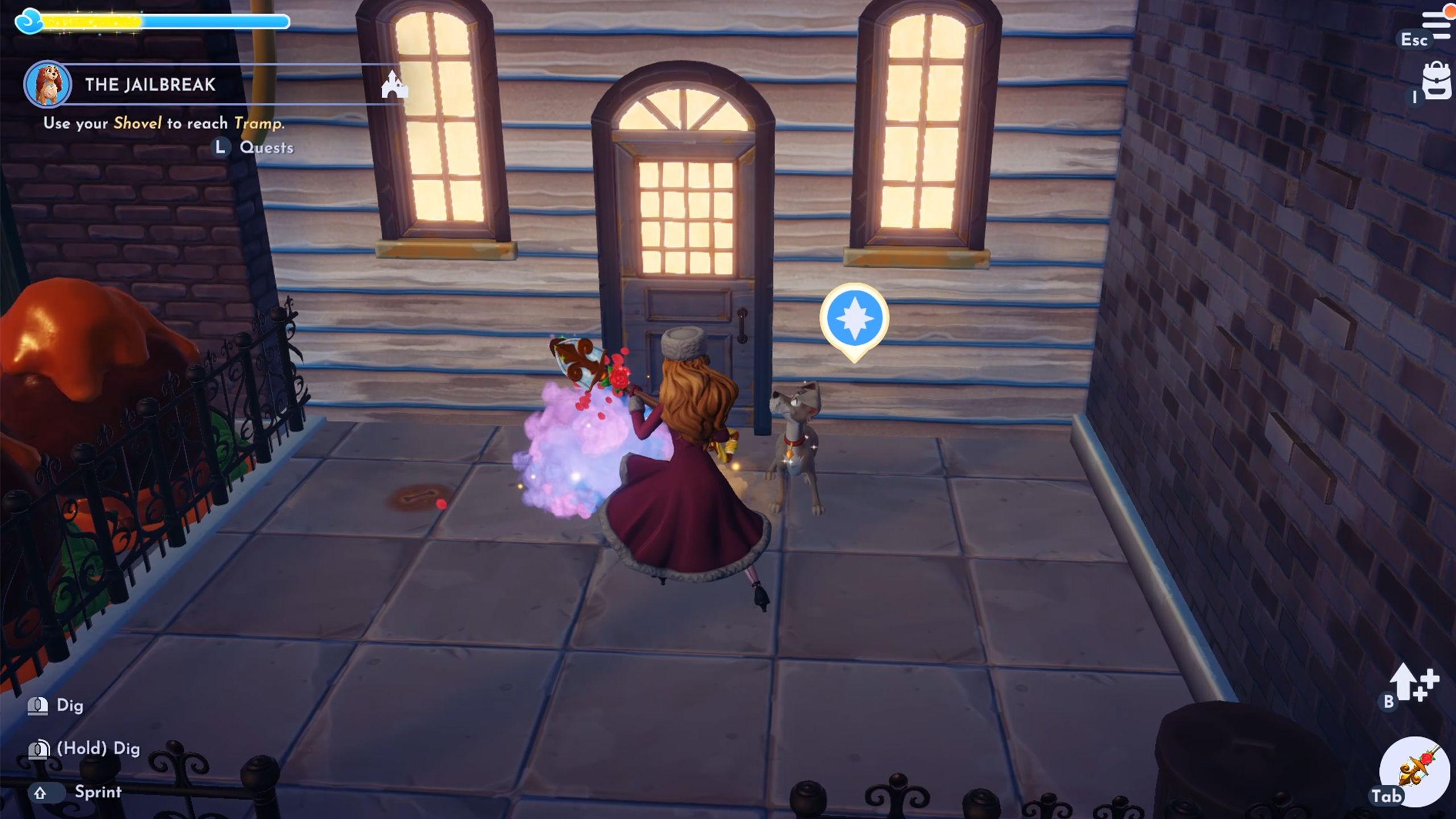 Put the snout on and present it to Lady. Then, follow the scent to the corner near the alley and dig up the meatballs with a shovel. This will reunite Tramp with the lovers and complete The Jailbreak quest.